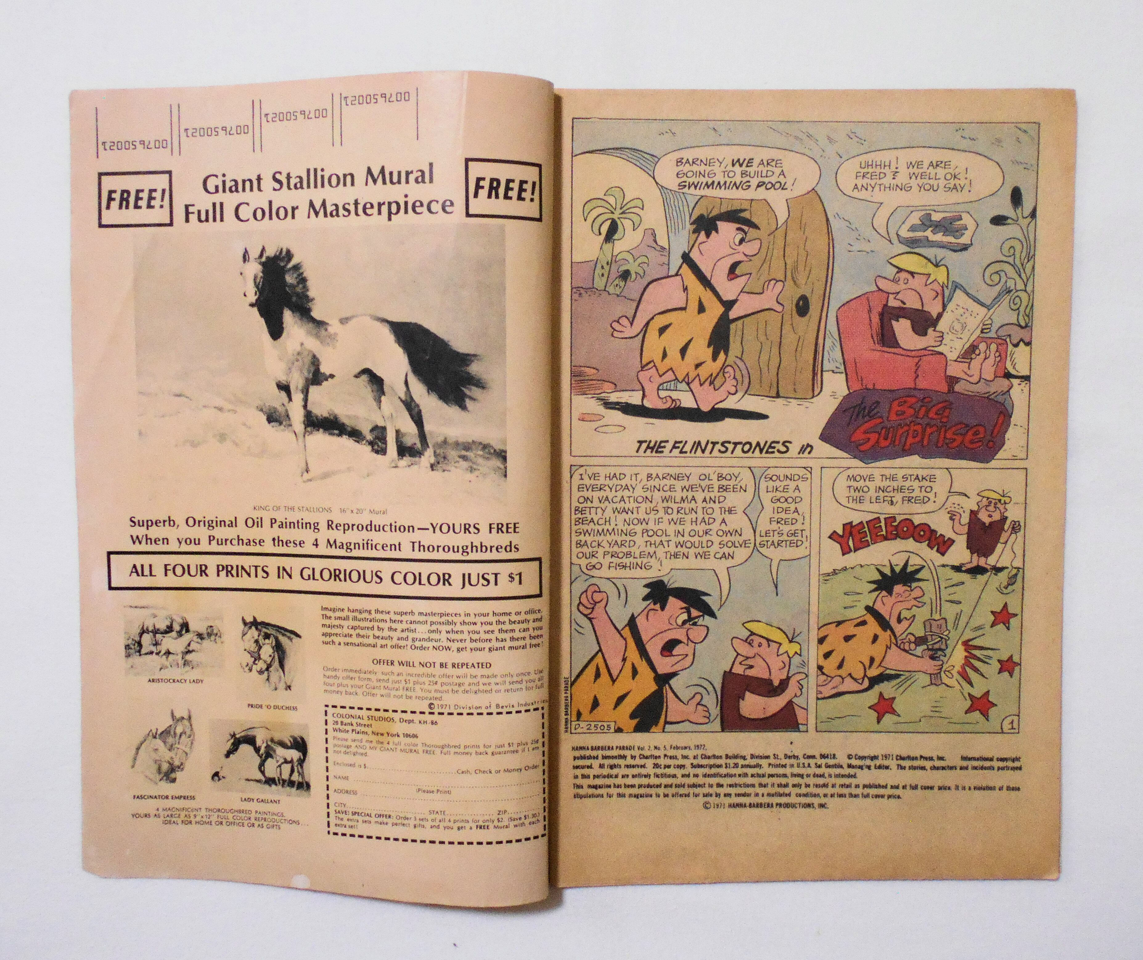 【HANNA-BARBERA PARADE】 VOL.2 NO.5 FEB. 1972◆中古アメリカン・コミック。英文表記の洋書となります。◆カラー 32ページ 大きさ約26×17センチ◆CHARLTON PRESS INC.◆COPYRIGHT 1971 HANNA-BARBERA PRODUCTIONS,INC.◆CONTENTS: THE FLINTSTONES in THE BIG SURPRISE! / TOUCHE and DUM DUM in NO GRACE / MAGILLA GORILLA in THE HiJACKER! / YAKKY DOODLE in THERE'S NO PLACE LIKE HOME / THE FLINTSTONES in THE BUGLE CALLS! / YOGI BEAR in BANNER YEAR / DINO