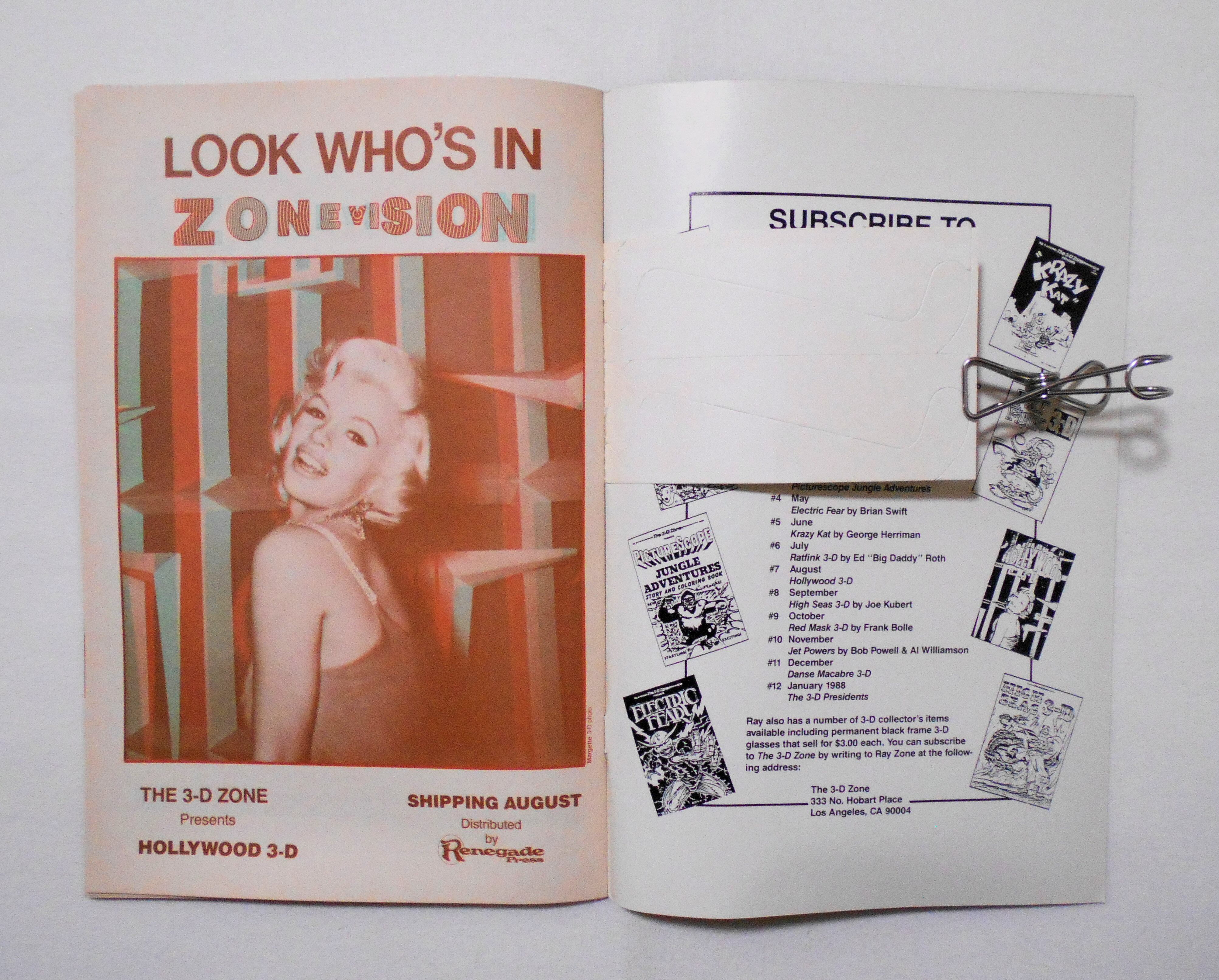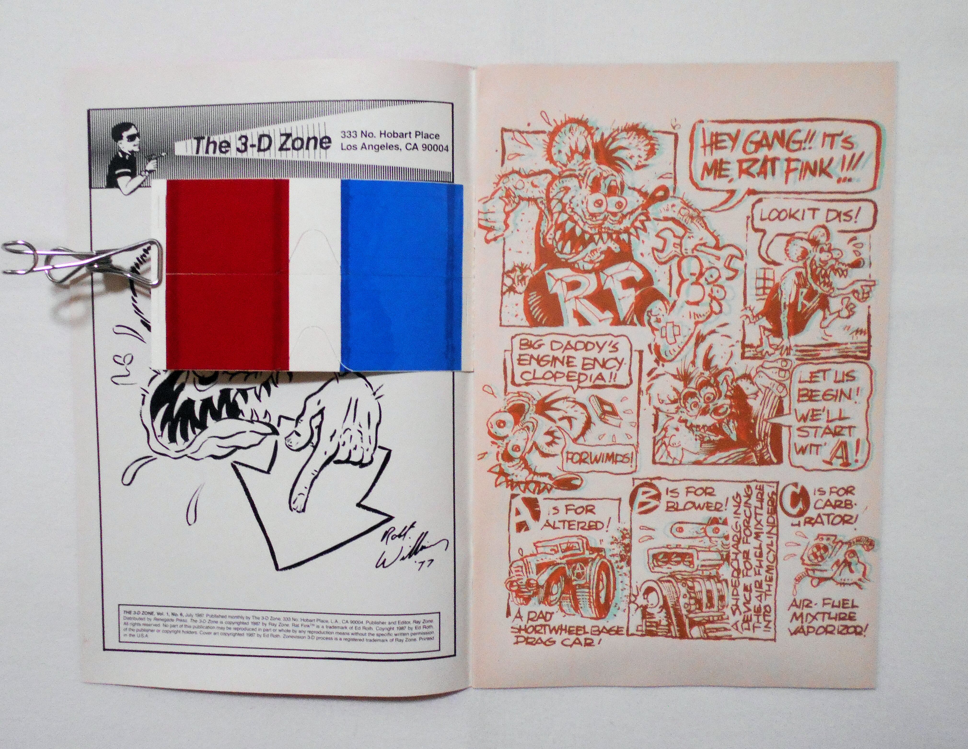 【RAT FINK THE 3-D ZONE】 VOL.1 NO.6 JULY 1987◆中古アメリカン・コミック。英文表記による洋書となります。◆32ページ 赤×緑の2色刷り 大きさ約26×17センチ◆THE 3-D ZONE◆COPYRIGHT 1987 by ED ROTH◆左右それぞれ赤緑のメガネをかけて読むと、絵が飛び出して見える、旧き良き時代の3-Dコミックです。3-Dメガネ付きです。