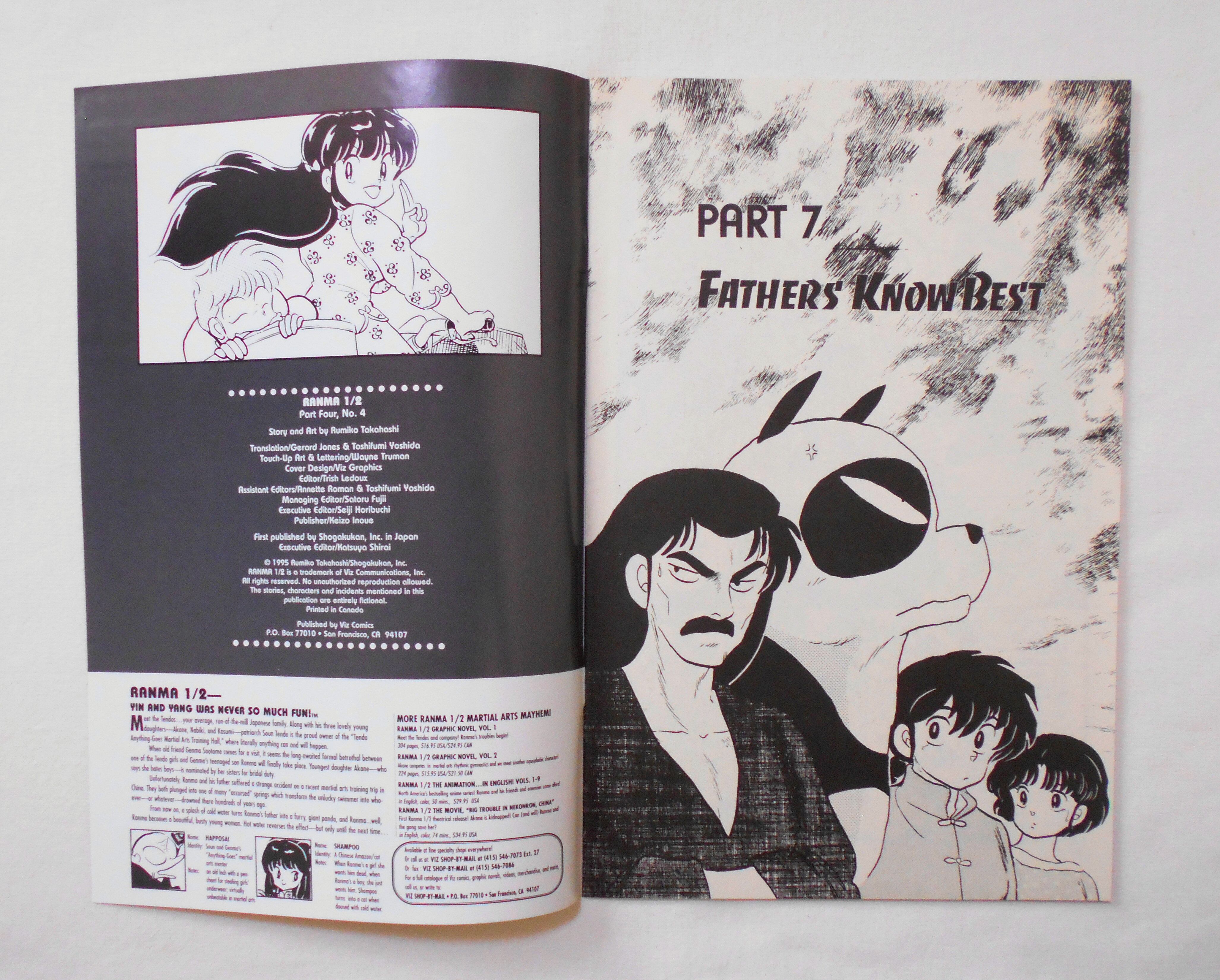 【RANMA 1/2 らんま1/2】 PART FOUR, NO.4◆中古アメリカン・コミック。英文表記の洋書となります。◆高橋留美子作品『らんま1/2』のアメリカ版コミック。翻訳版アメコミにありがちなカラーリングは施されず、白黒のまま、文字は全て英文に変更され、左右の開きが逆になっています。収録タイトル:PART 7: FATHER'S KNOW BEST PART 8: INSTANT SPRING◆32ページ 白黒 大きさ約26×17センチ◆COPYRIGHT 1995 RUMIKO TAKAHASHI (高橋留美子)/SHOGAKUKAN, INC.(小学館)◆VIZ COMICS