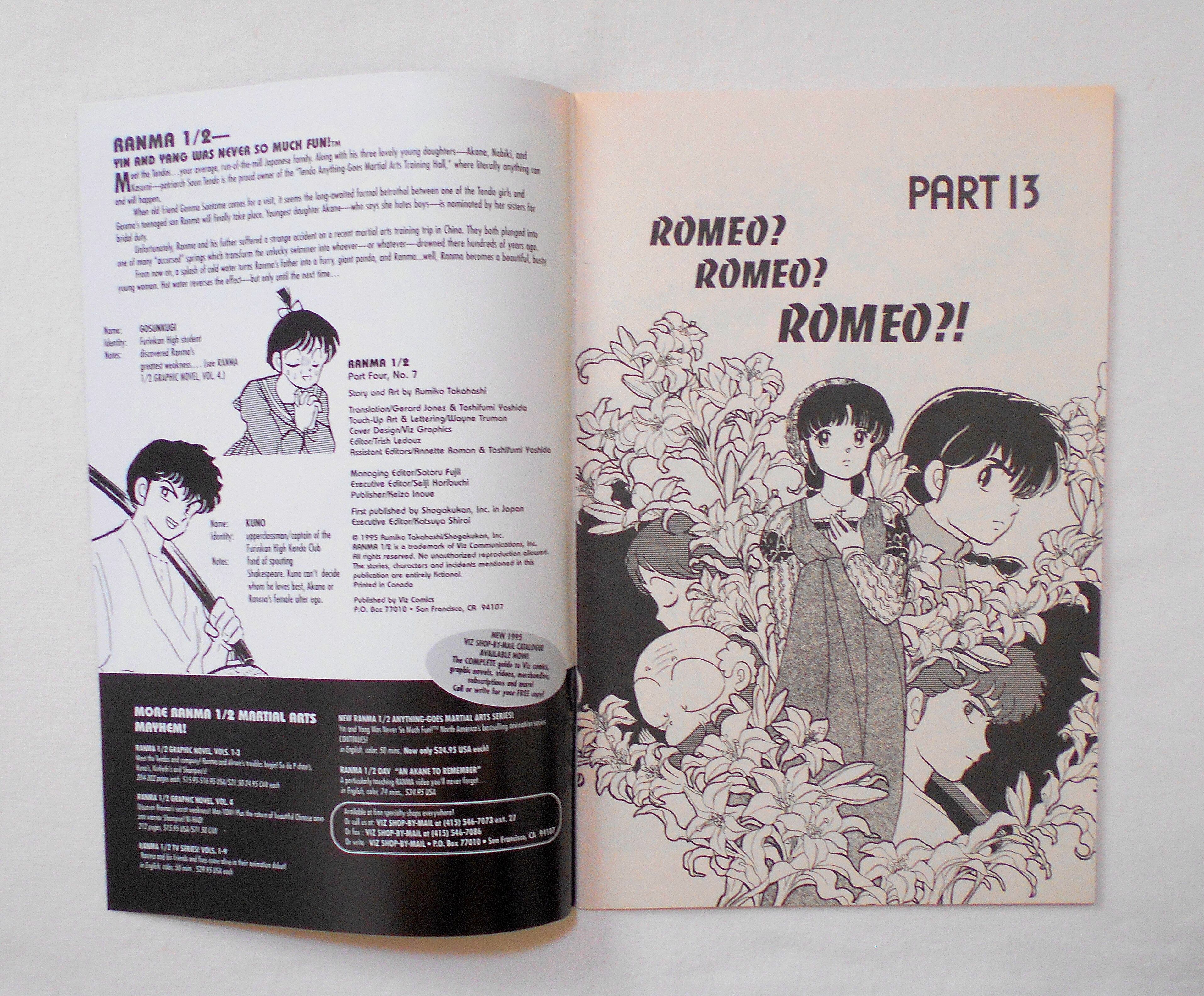 【RANMA 1/2 らんま1/2】 PART FOUR, NO.7◆中古アメリカン・コミック。英文表記の洋書となります。◆高橋留美子作品『らんま1/2』のアメリカ版コミック。翻訳版アメコミにありがちなカラーリングは施されず、白黒のまま、文字は全て英文に変更され、左右の開きが逆になっています。収録タイトル:PART 13: ROMEO? ROMEO? ROMEO?! PART 14: NOT YOUR TYPICAL JULIET◆32ページ 白黒 大きさ約26×17センチ◆COPYRIGHT 1995 RUMIKO TAKAHASHI (高橋留美子)/SHOGAKUKAN, INC.(小学館)◆VIZ COMICS