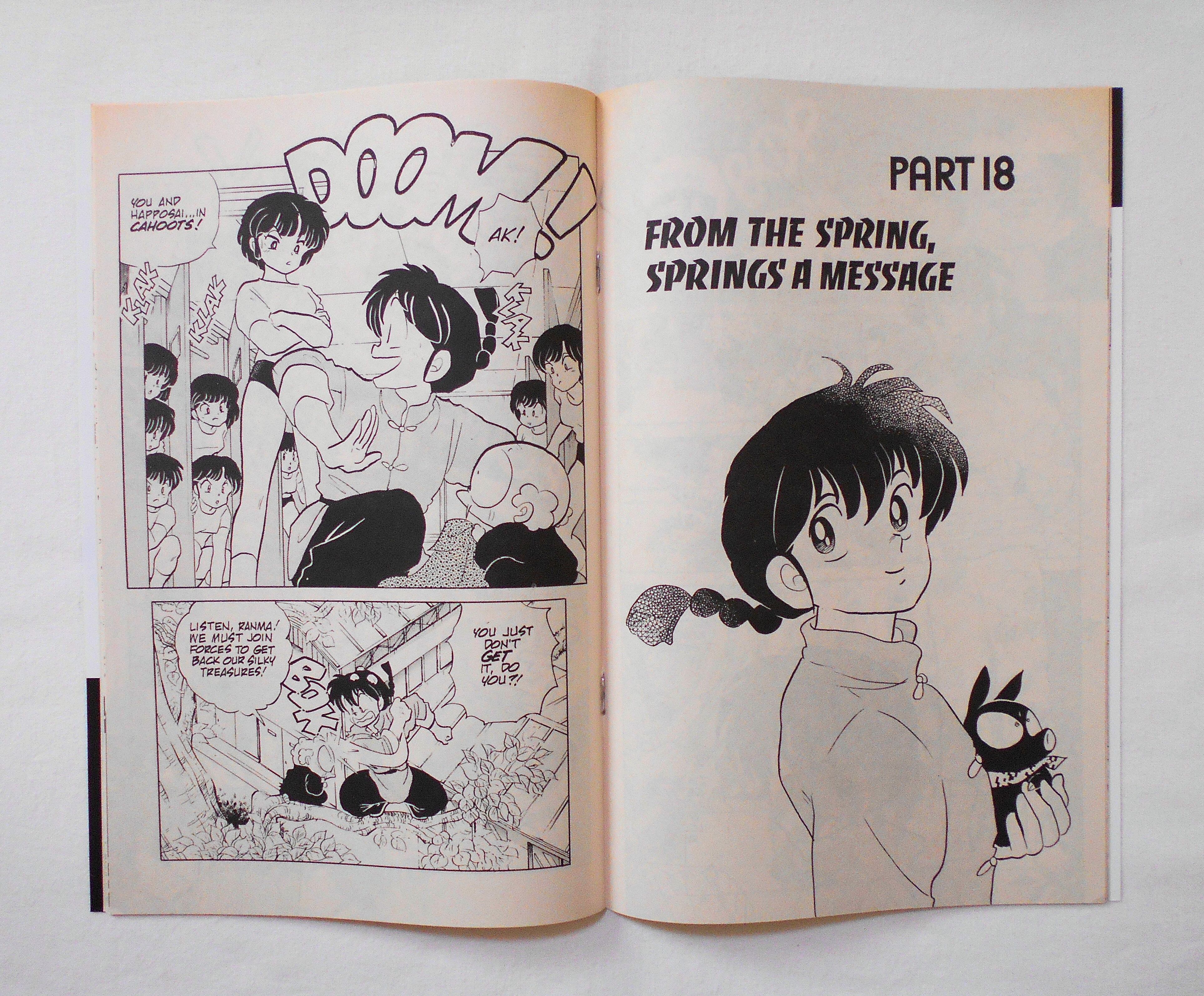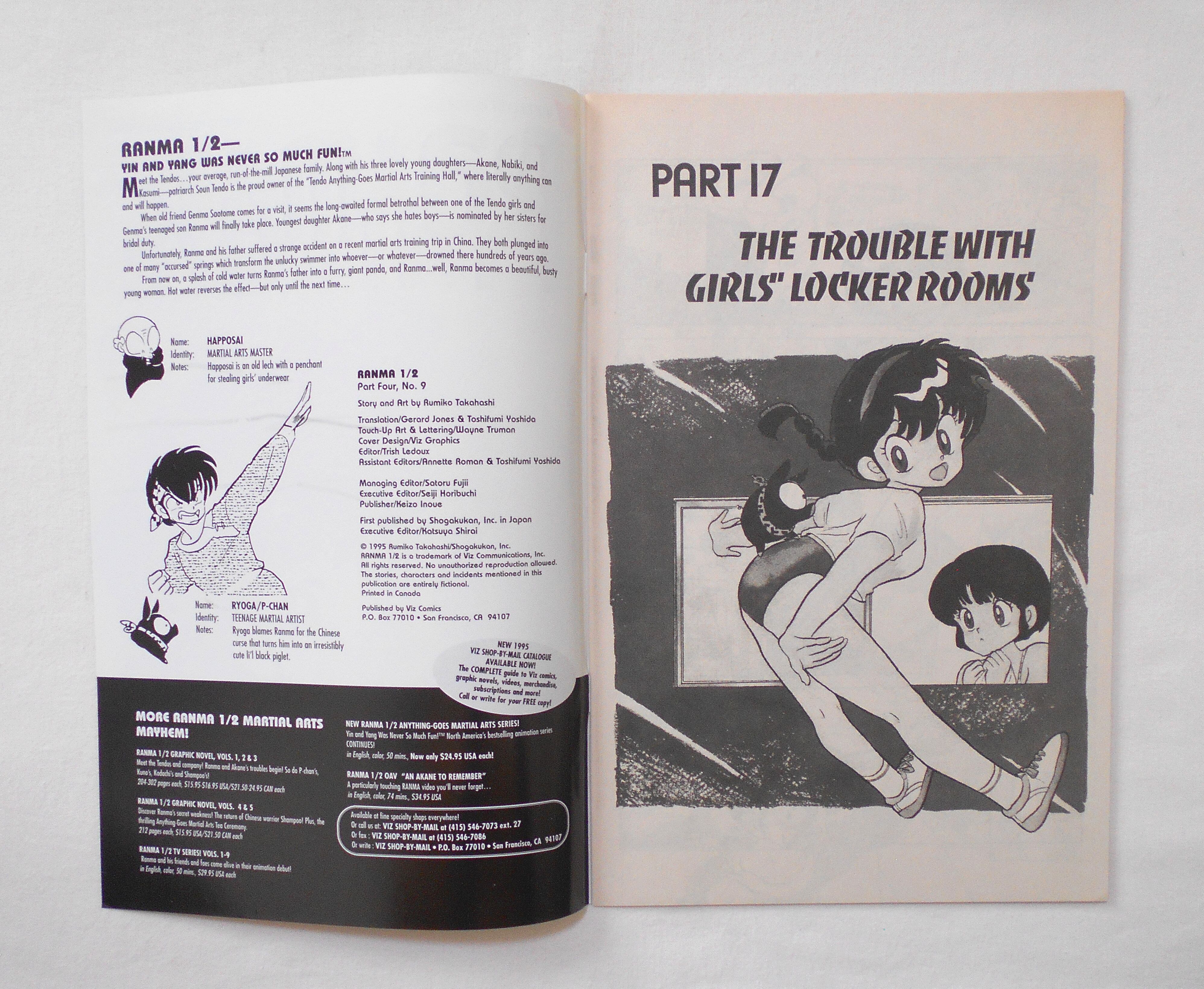 【RANMA 1/2 らんま1/2】 PART FOUR, NO.9◆中古アメリカン・コミック。英文表記の洋書となります。◆高橋留美子作品『らんま1/2』のアメリカ版コミック。翻訳版アメコミにありがちなカラーリングは施されず、白黒のまま、文字は全て英文に変更され、左右の開きが逆になっています。収録タイトル:PART 17: THE TROUBLE WITH GIRLS' LOCKER ROOMS PART 18: FROM THE SPRING, SPRINGS A MESSAGE◆32ページ 白黒 大きさ約26×17センチ◆COPYRIGHT 1995 RUMIKO TAKAHASHI (高橋留美子)/SHOGAKUKAN, INC.(小学館)◆VIZ COMICS