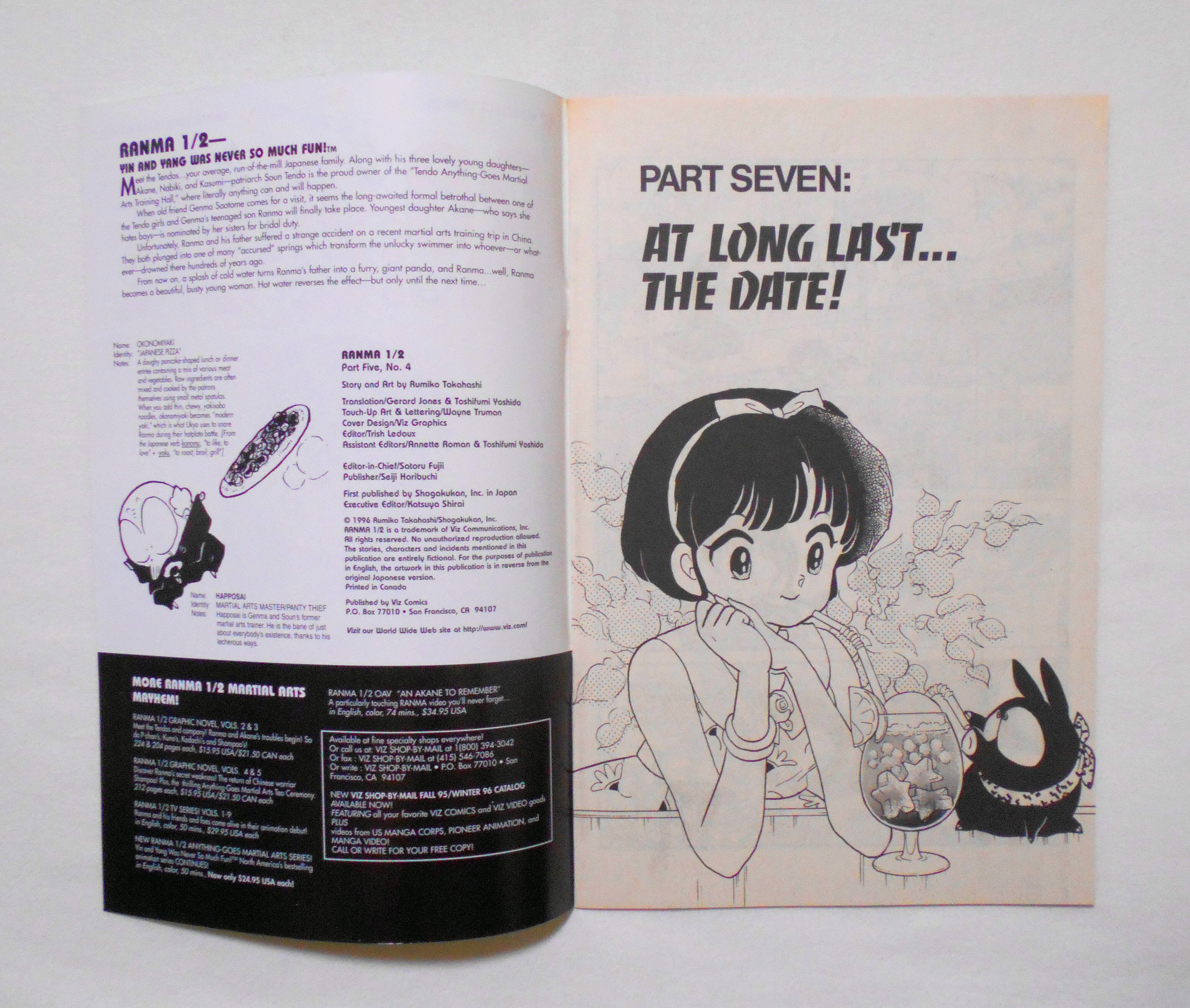 【RANMA 1/2 らんま1/2】 PART FIVE, NO.4◆中古アメリカン・コミック。英文表記の洋書となります。◆高橋留美子作品『らんま1/2』のアメリカ版コミック。翻訳版アメコミにありがちなカラーリングは施されず、白黒のまま、文字は全て英文に変更され、左右の開きが逆になっています。収録タイトル:PART 7: AT LONG LAST... THE DATE! PART 8: HAPPOSAI DAYS ARE HERE AGAIN◆32ページ 白黒 大きさ約26×17センチ◆COPYRIGHT 1996 RUMIKO TAKAHASHI (高橋留美子)/SHOGAKUKAN, INC.(小学館)◆VIZ COMICS