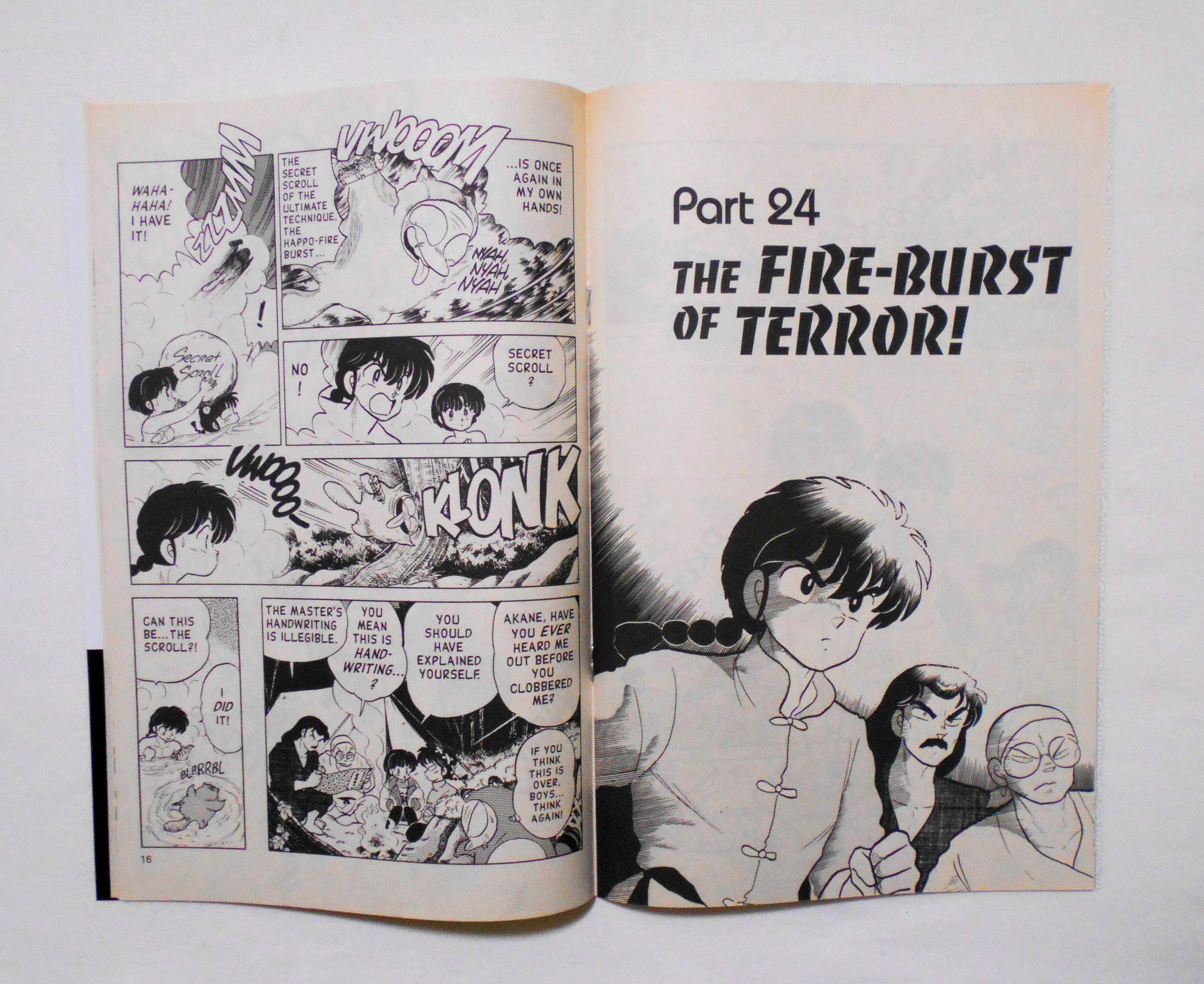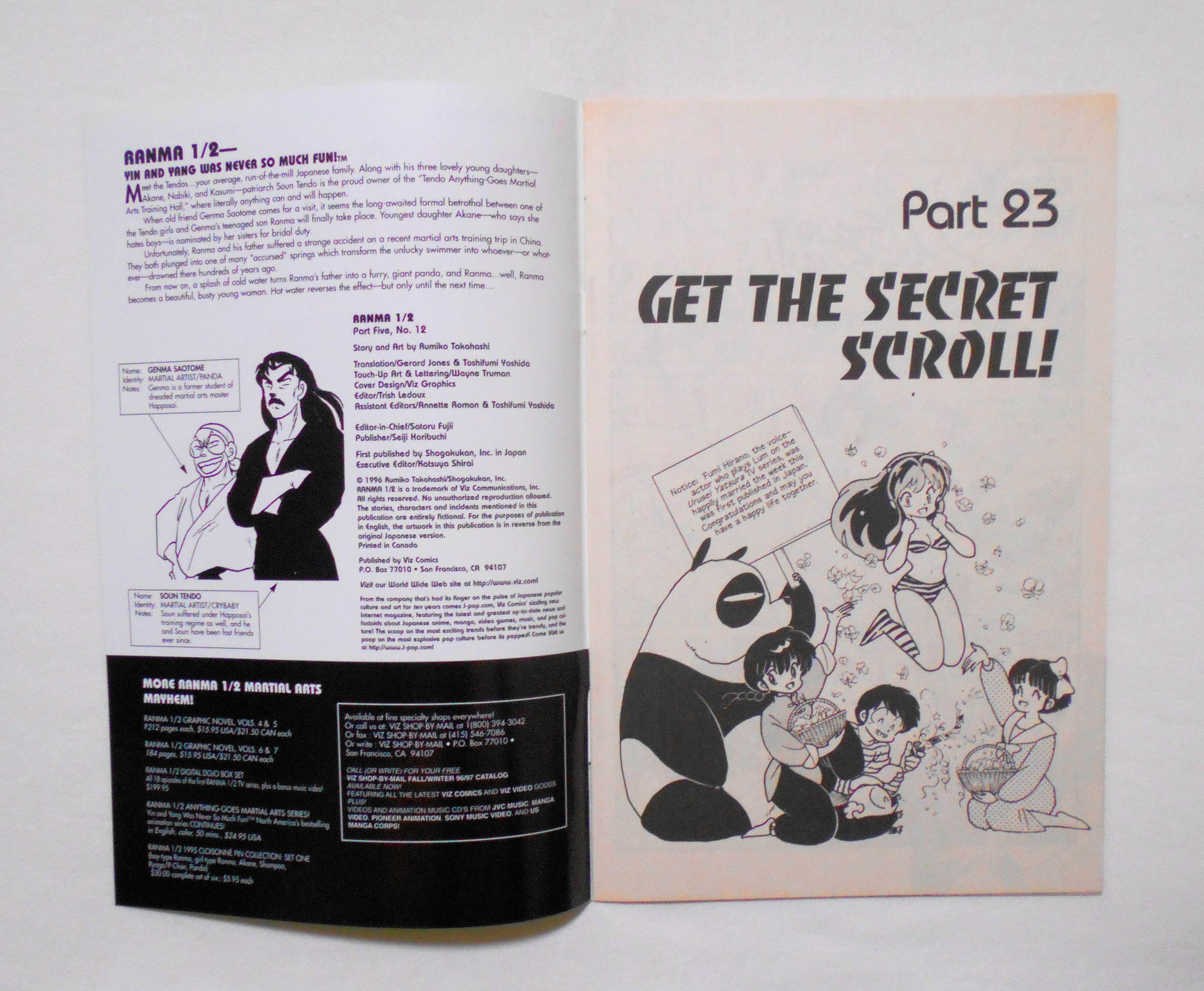 【RANMA 1/2 らんま1/2】 PART FIVE, NO.12◆中古アメリカン・コミック。英文表記の洋書となります。◆高橋留美子作品『らんま1/2』のアメリカ版コミック。翻訳版アメコミにありがちなカラーリングは施されず、白黒のまま、文字は全て英文に変更され、左右の開きが逆になっています。収録タイトル:PART 23: GET THE SECRET SCROLL! PART 24: THE FIRE-BURST OF TERROR!◆32ページ 白黒 大きさ約26×17センチ◆COPYRIGHT 1996 RUMIKO TAKAHASHI (高橋留美子)/SHOGAKUKAN, INC.(小学館)◆VIZ COMICS