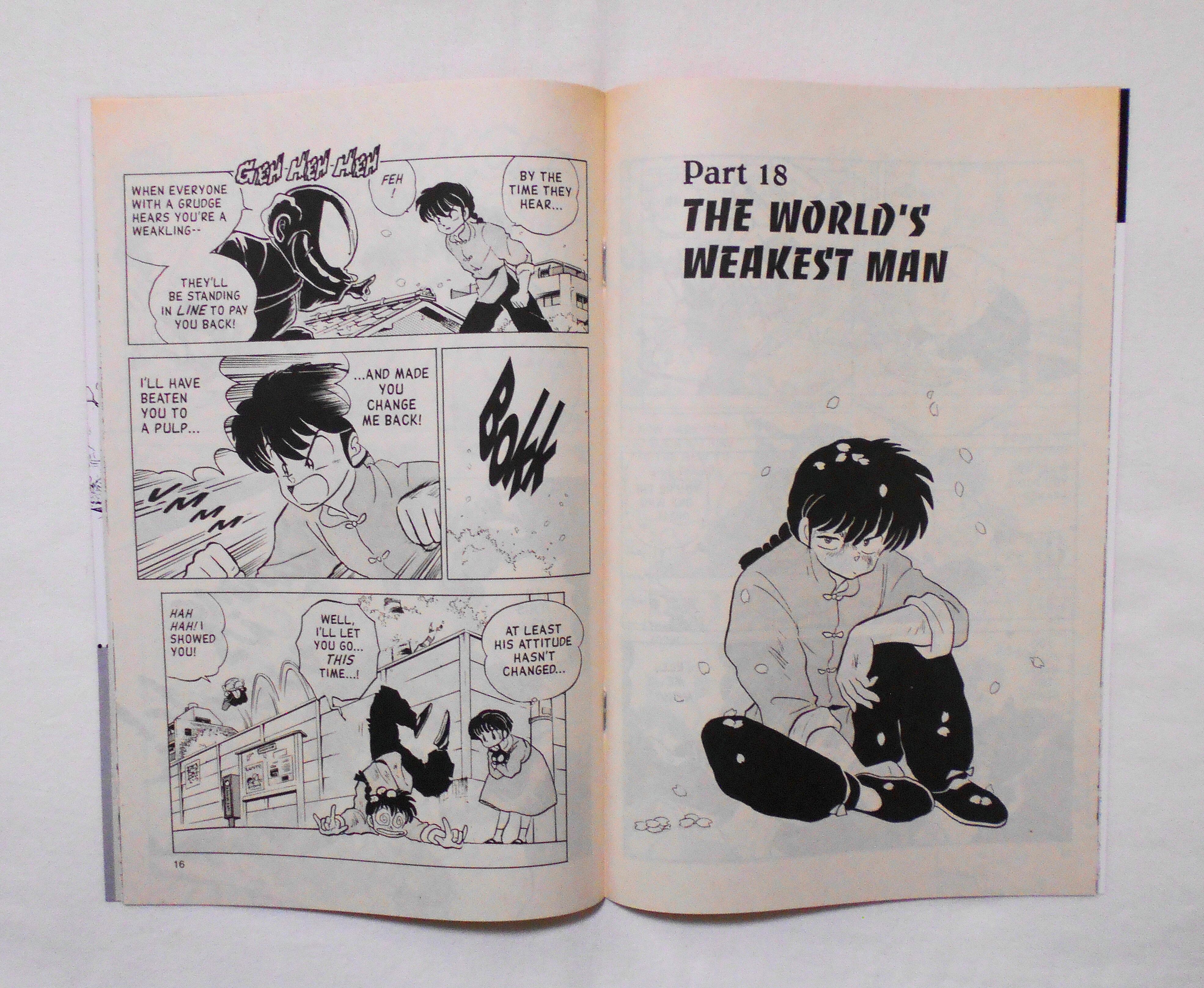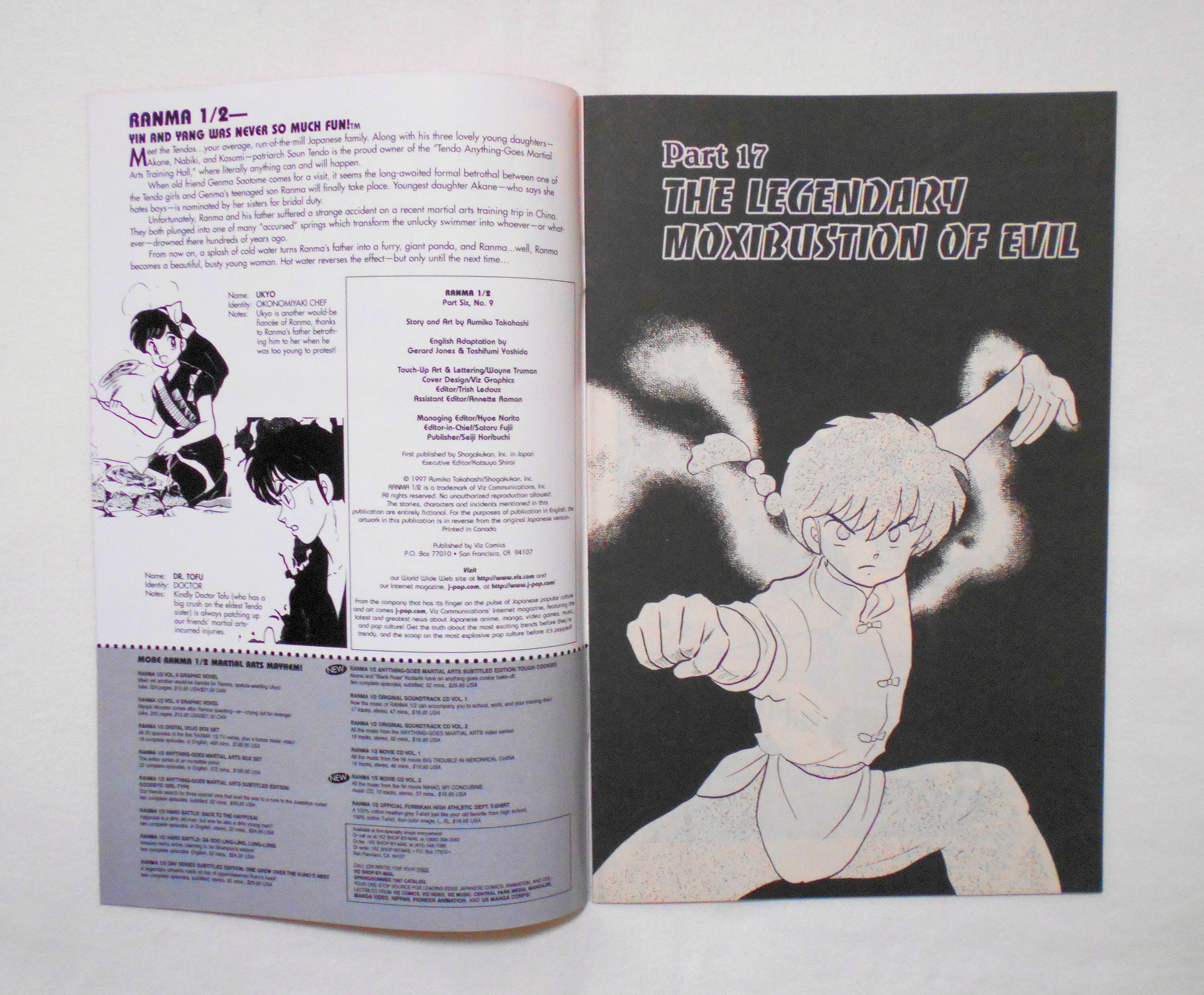 【RANMA 1/2 らんま1/2】 PART SIX, NO.9◆中古アメリカン・コミック。英文表記の洋書となります。◆高橋留美子作品『らんま1/2』のアメリカ版コミック。翻訳版アメコミにありがちなカラーリングは施されず、白黒のまま、文字は全て英文に変更され、左右の開きが逆になっています。収録タイトル:PART 17: THE LEGENDARY MOXIBUSTION OF EVIL PART 18: THE WORLD'S WEAKEST MAN◆32ページ 白黒 大きさ約26×17センチ◆COPYRIGHT 1997 RUMIKO TAKAHASHI (高橋留美子)/SHOGAKUKAN, INC.(小学館)◆VIZ COMICS