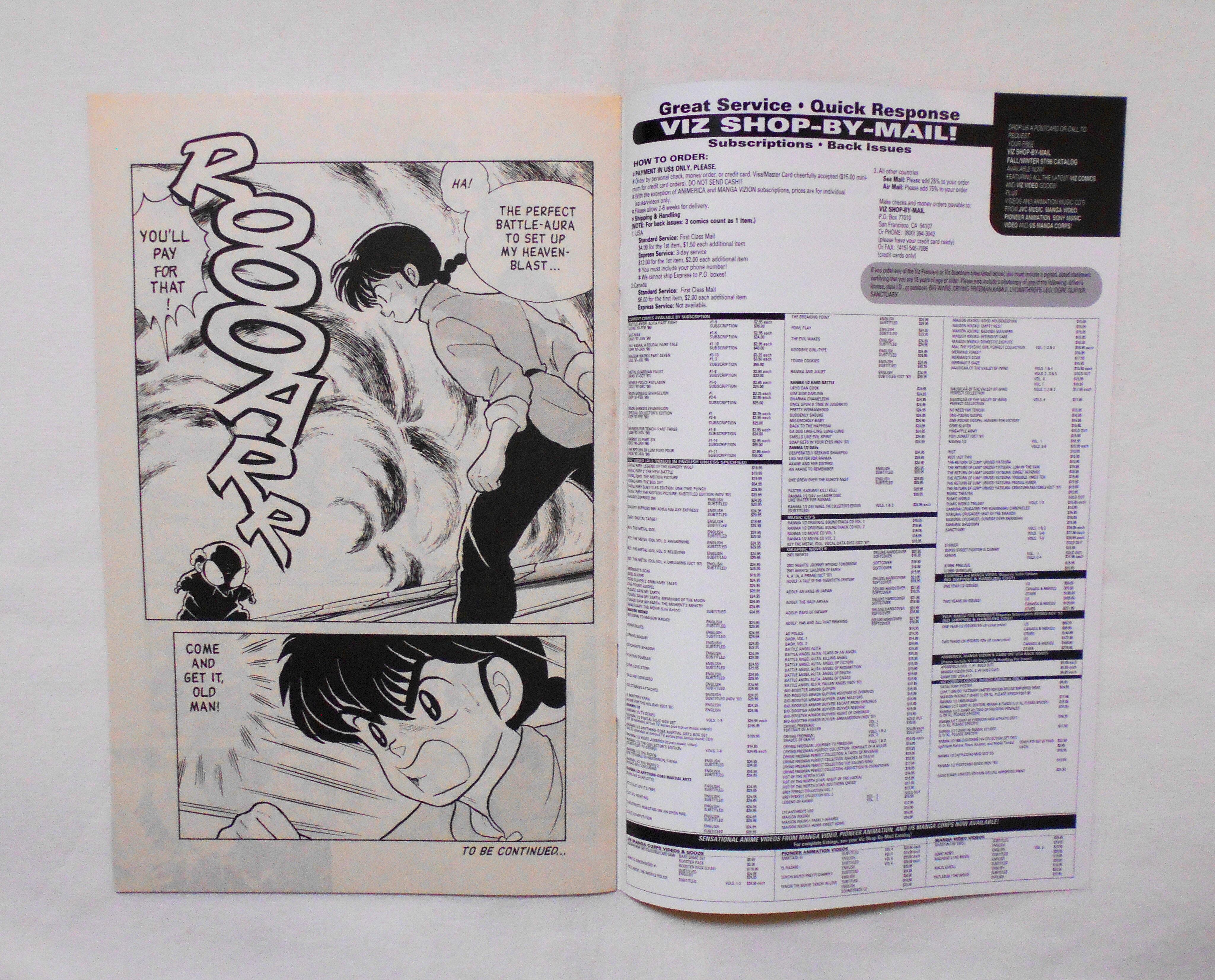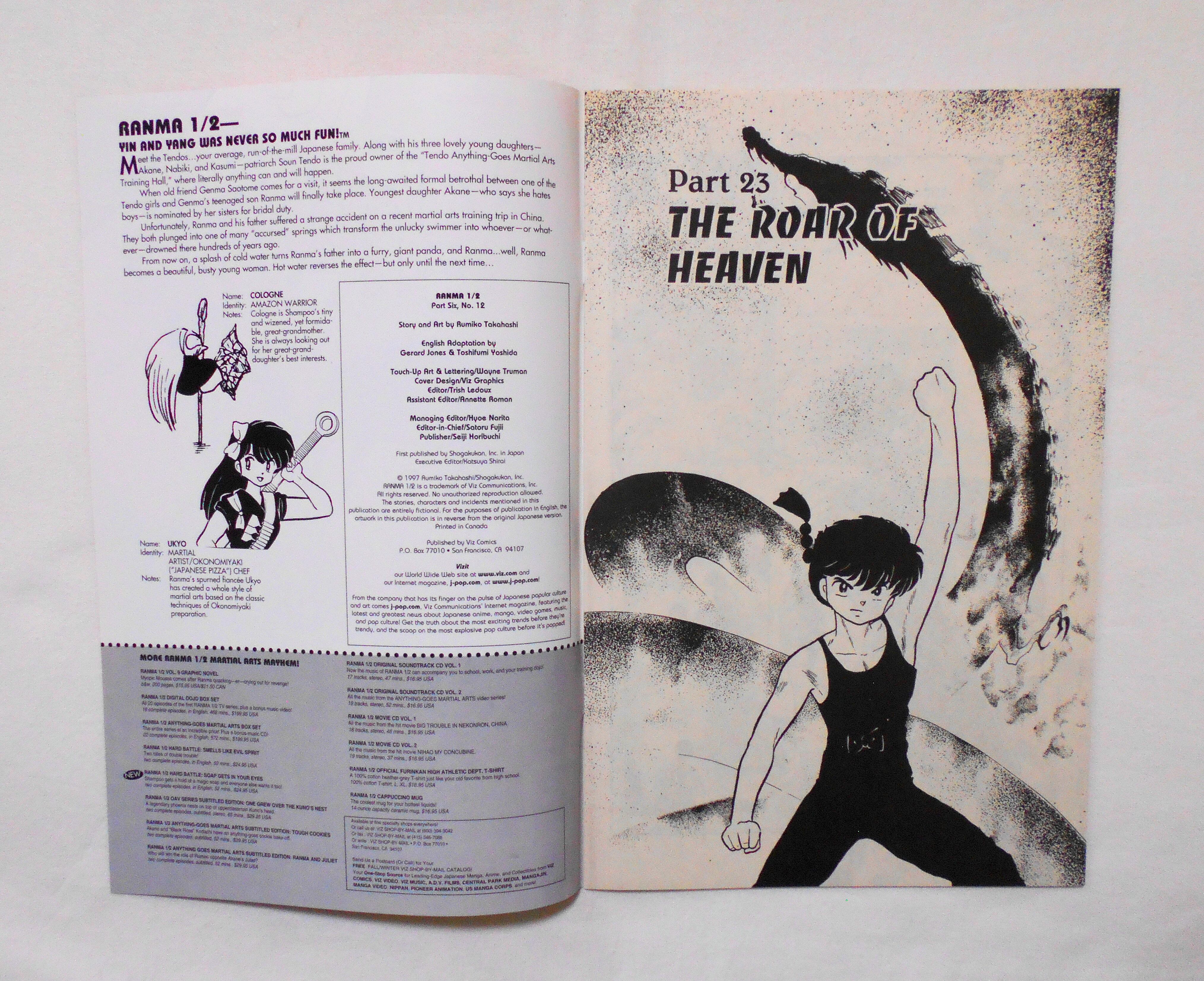 【RANMA 1/2 らんま1/2】 PART SIX, NO.12◆中古アメリカン・コミック。英文表記の洋書となります。◆高橋留美子作品『らんま1/2』のアメリカ版コミック。翻訳版アメコミにありがちなカラーリングは施されず、白黒のまま、文字は全て英文に変更され、左右の開きが逆になっています。収録タイトル:PART 23: THE ROAR OF HEAVEN PART 24: THE GREAT REMATCH◆32ページ 白黒 大きさ約26×17センチ◆COPYRIGHT 1997 RUMIKO TAKAHASHI (高橋留美子)/SHOGAKUKAN, INC.(小学館)◆VIZ COMICS