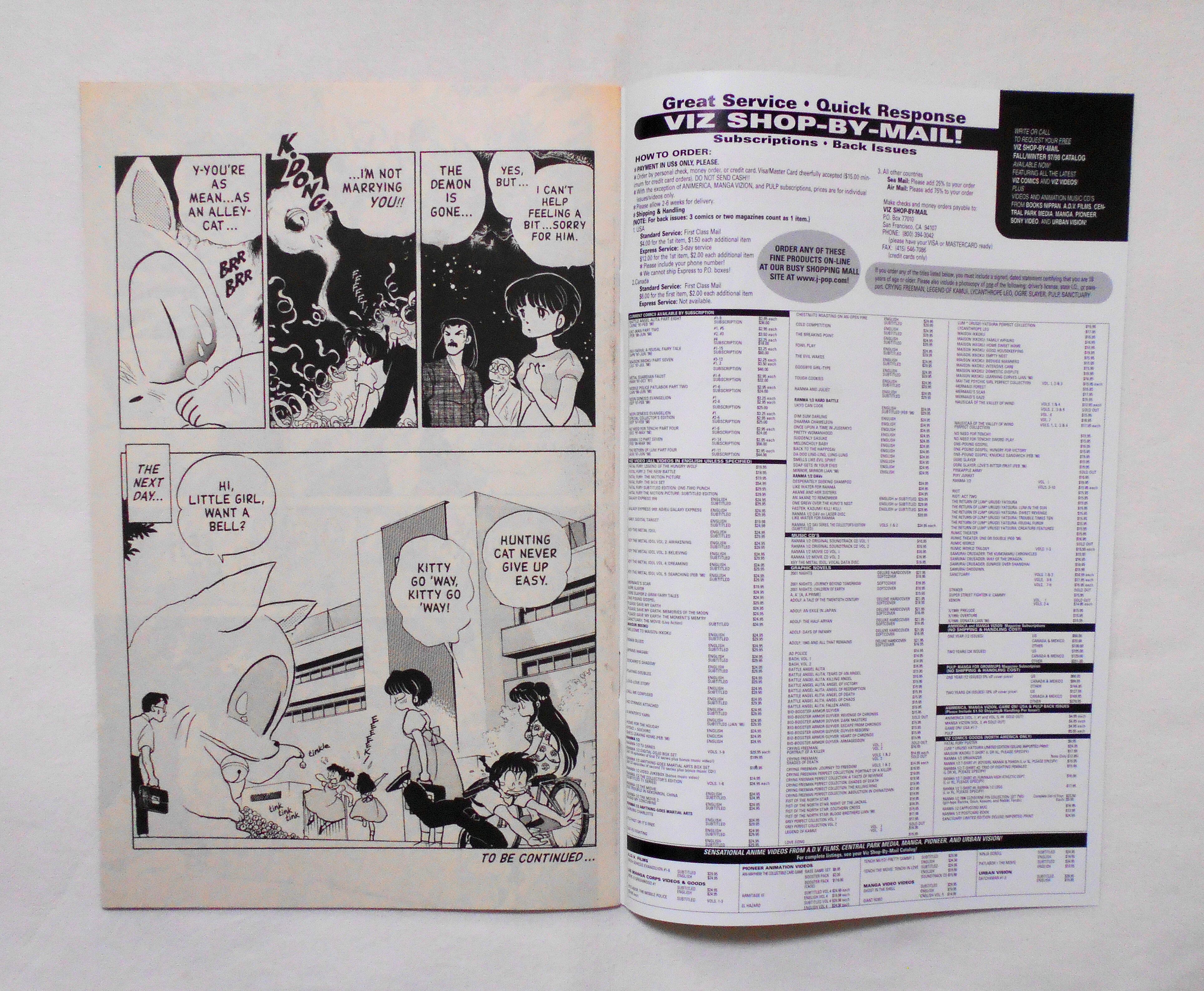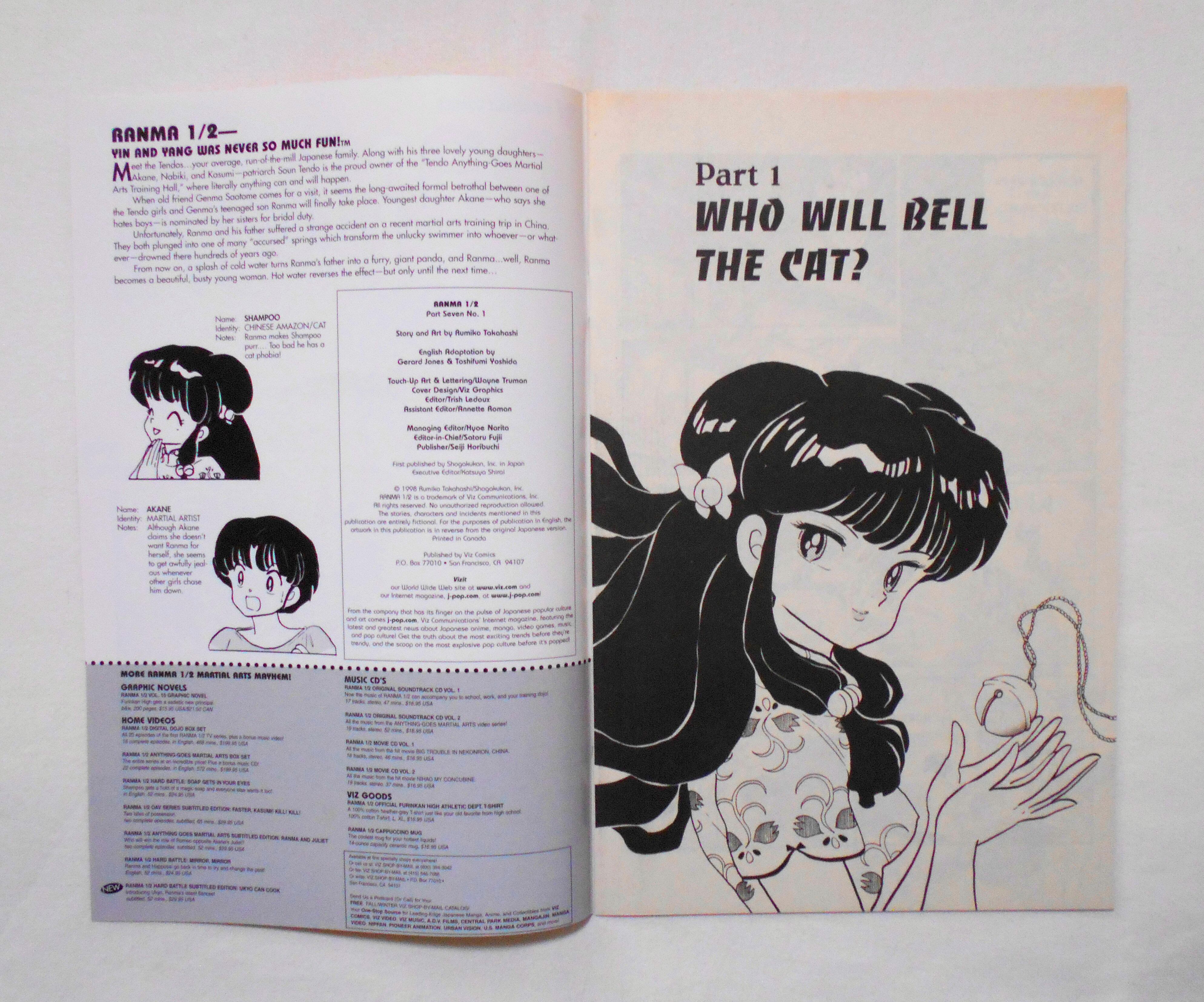 【RANMA 1/2 らんま1/2】 PART SEVEN, NO.1◆中古アメリカン・コミック。英文表記の洋書となります。◆高橋留美子作品『らんま1/2』のアメリカ版コミック。翻訳版アメコミにありがちなカラーリングは施されず、白黒のまま、文字は全て英文に変更され、左右の開きが逆になっています。収録タイトル:PART 1: WHO WILL BELL THE CAT? PART 2: KITTY TAKES A BRIDE◆32ページ 白黒 大きさ約26×17センチ◆COPYRIGHT 1998 RUMIKO TAKAHASHI (高橋留美子)/SHOGAKUKAN, INC.(小学館)◆VIZ COMICS