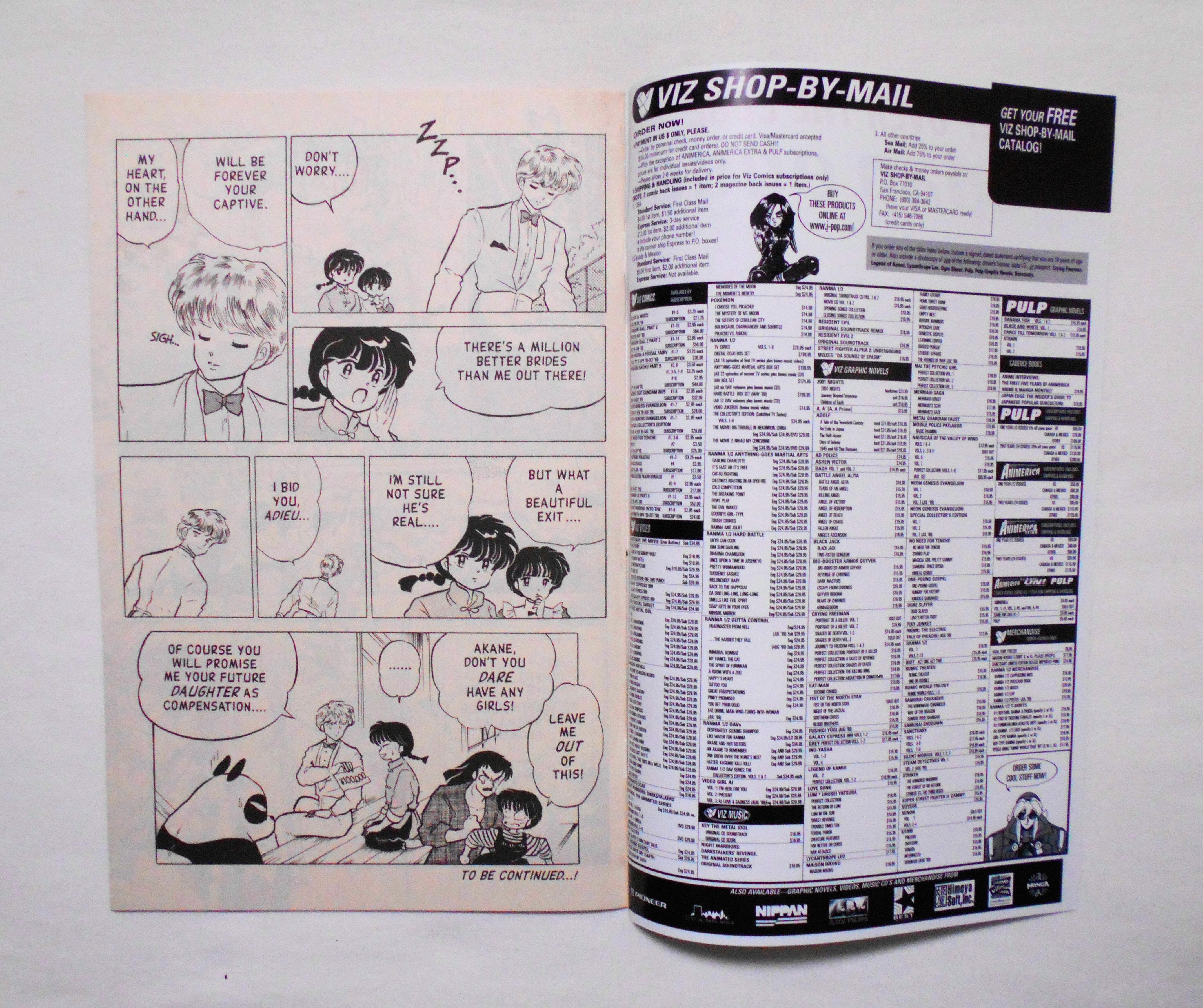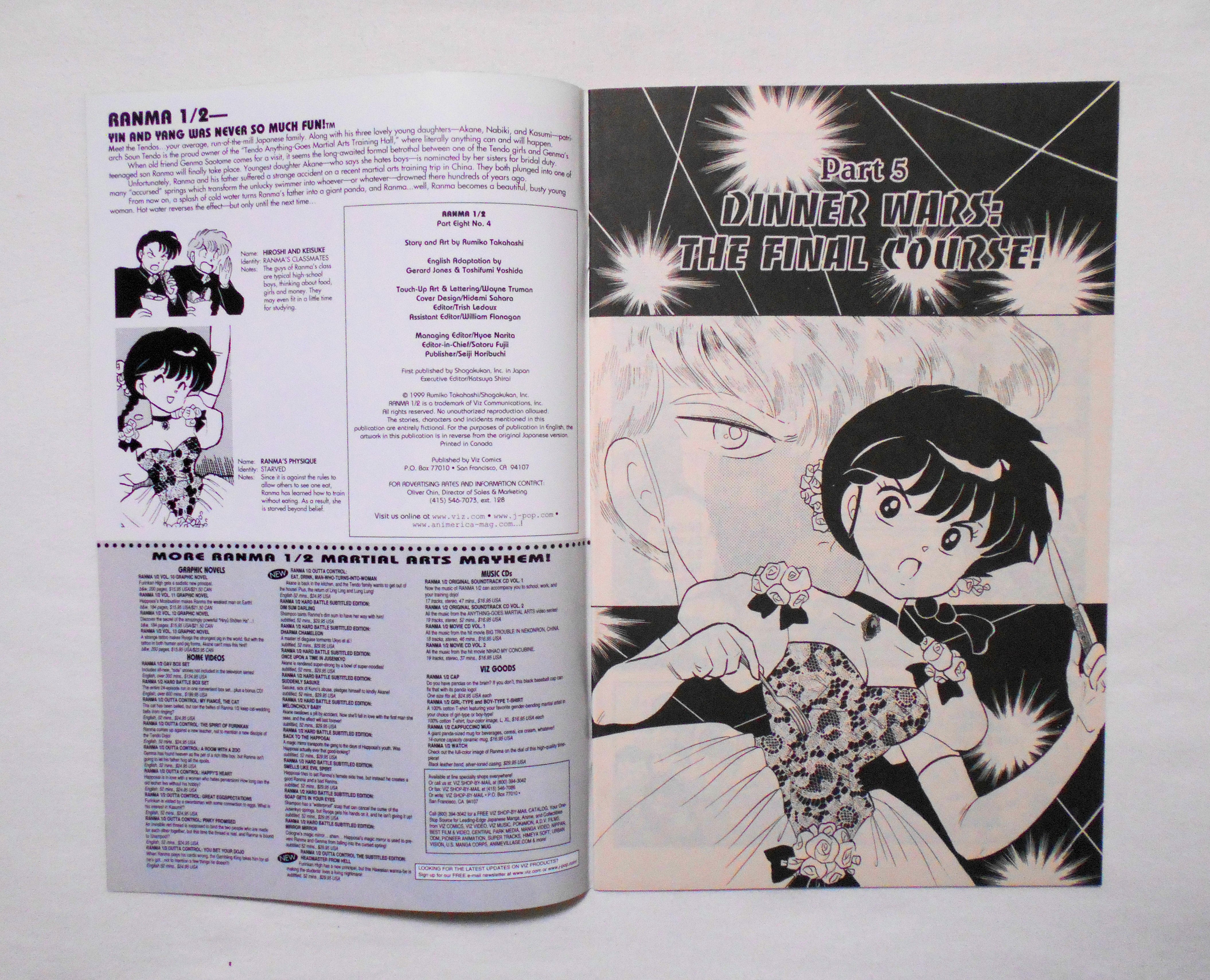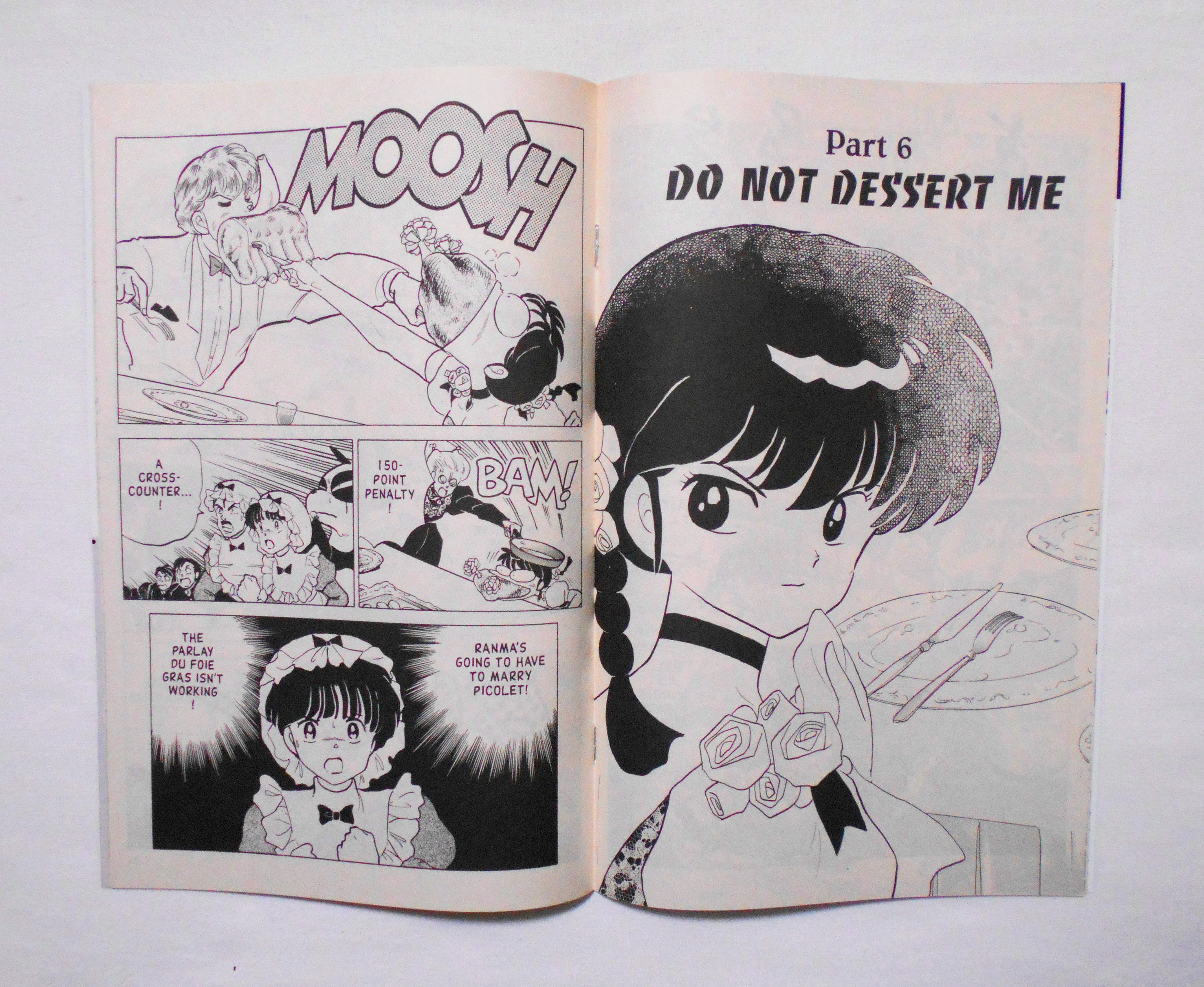 【RANMA 1/2 らんま1/2】 PART EIGHT, NO.4◆中古アメリカン・コミック。英文表記の洋書となります。◆高橋留美子作品『らんま1/2』のアメリカ版コミック。翻訳版アメコミにありがちなカラーリングは施されず、白黒のまま、文字は全て英文に変更され、左右の開きが逆になっています。収録タイトル:PART 5: DINNER WARS: THE FINAL COURSE! PART 6: DO NOT DESSERT ME◆32ページ 白黒 大きさ約26×17センチ◆COPYRIGHT 1999 RUMIKO TAKAHASHI (高橋留美子)/SHOGAKUKAN, INC.(小学館)◆VIZ COMICS