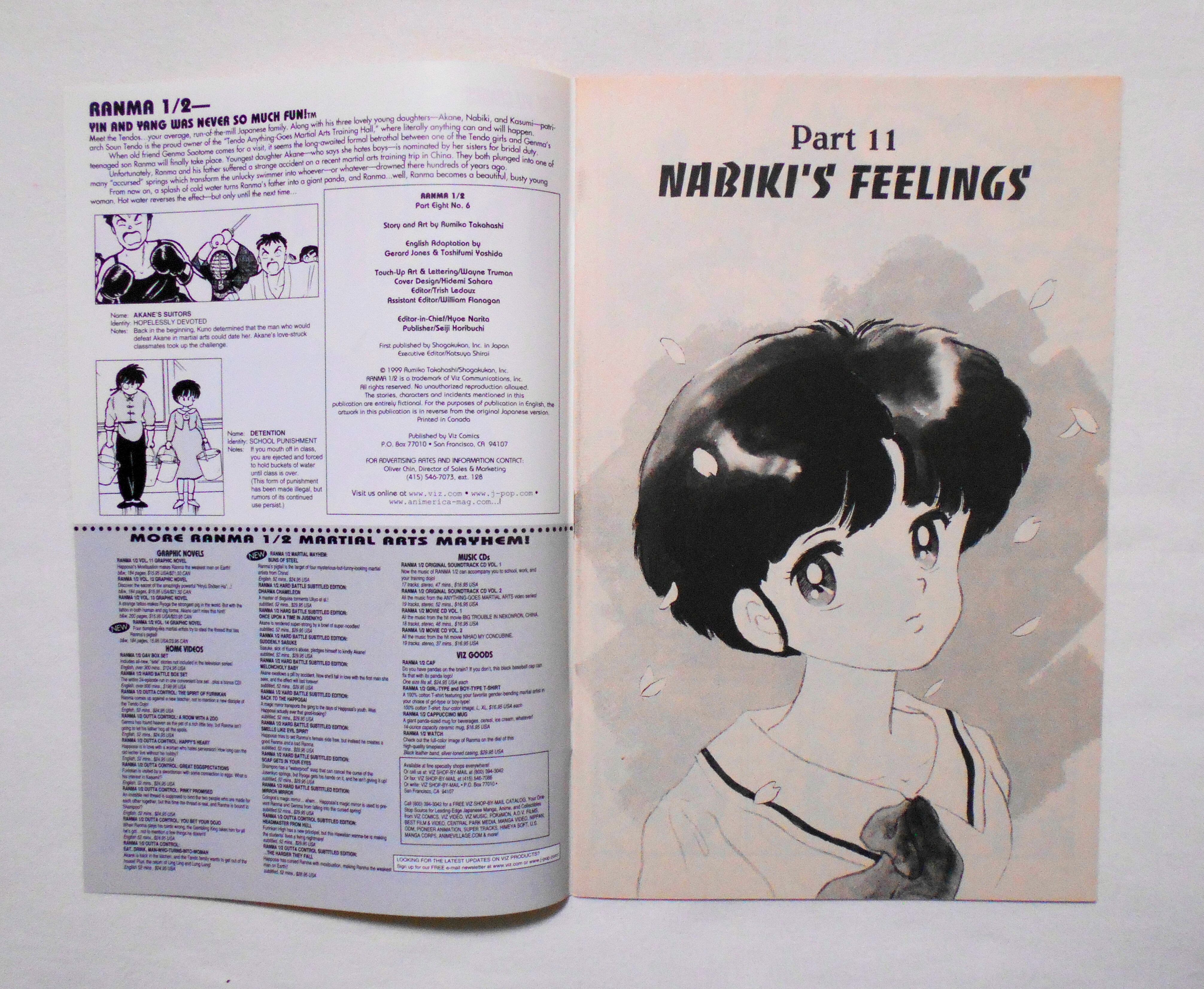 【RANMA 1/2 らんま1/2】 PART EIGHT, NO.6◆中古アメリカン・コミック。英文表記の洋書となります。◆高橋留美子作品『らんま1/2』のアメリカ版コミック。翻訳版アメコミにありがちなカラーリングは施されず、白黒のまま、文字は全て英文に変更され、左右の開きが逆になっています。収録タイトル:PART 11: NABIKI'S FEELINGS PART 12: I'M THE VICTIM HERE!◆32ページ 白黒 大きさ約26×17センチ◆COPYRIGHT 1999 RUMIKO TAKAHASHI (高橋留美子)/SHOGAKUKAN, INC.(小学館)◆VIZ COMICS