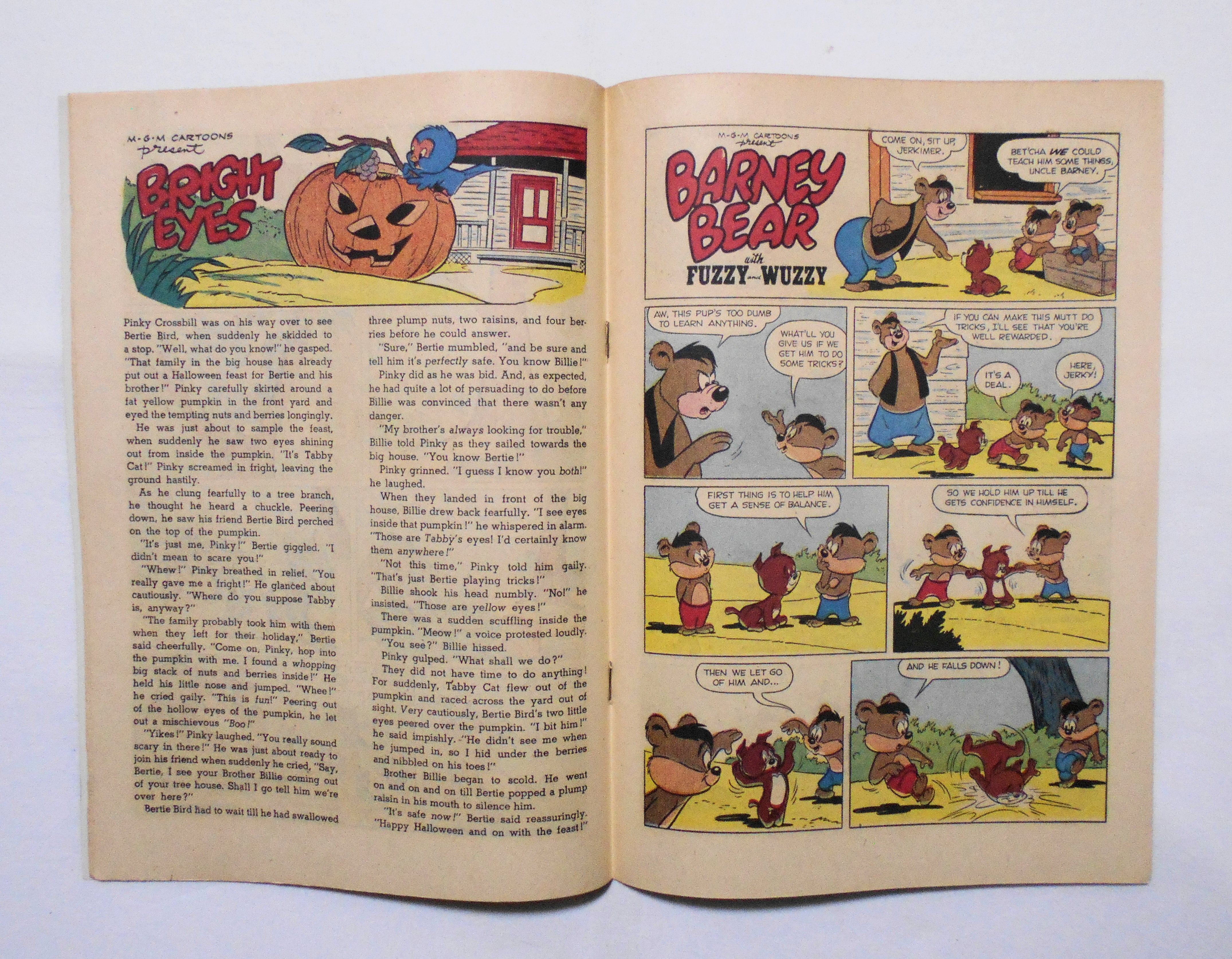 背から内側へ約1センチ縦方向に軽く折れ目が付いています。表紙の上端の真ん中あたりに、おそらく鉛筆による書き込みがあります。他、多少の擦れやシワ、黄ばみ、角や端の傷みや微折れ等があり、経年に伴う使用感は否めませんが、目立った汚れやシミ等はなく、1950年代の輸入中古コミックですので、その点を考慮頂ければ、普通程度~おおむね良好と言える保存状態だと思います。新品同様の美品をお求めの方や、古書にご理解を頂けない方にお薦めは出来ません。