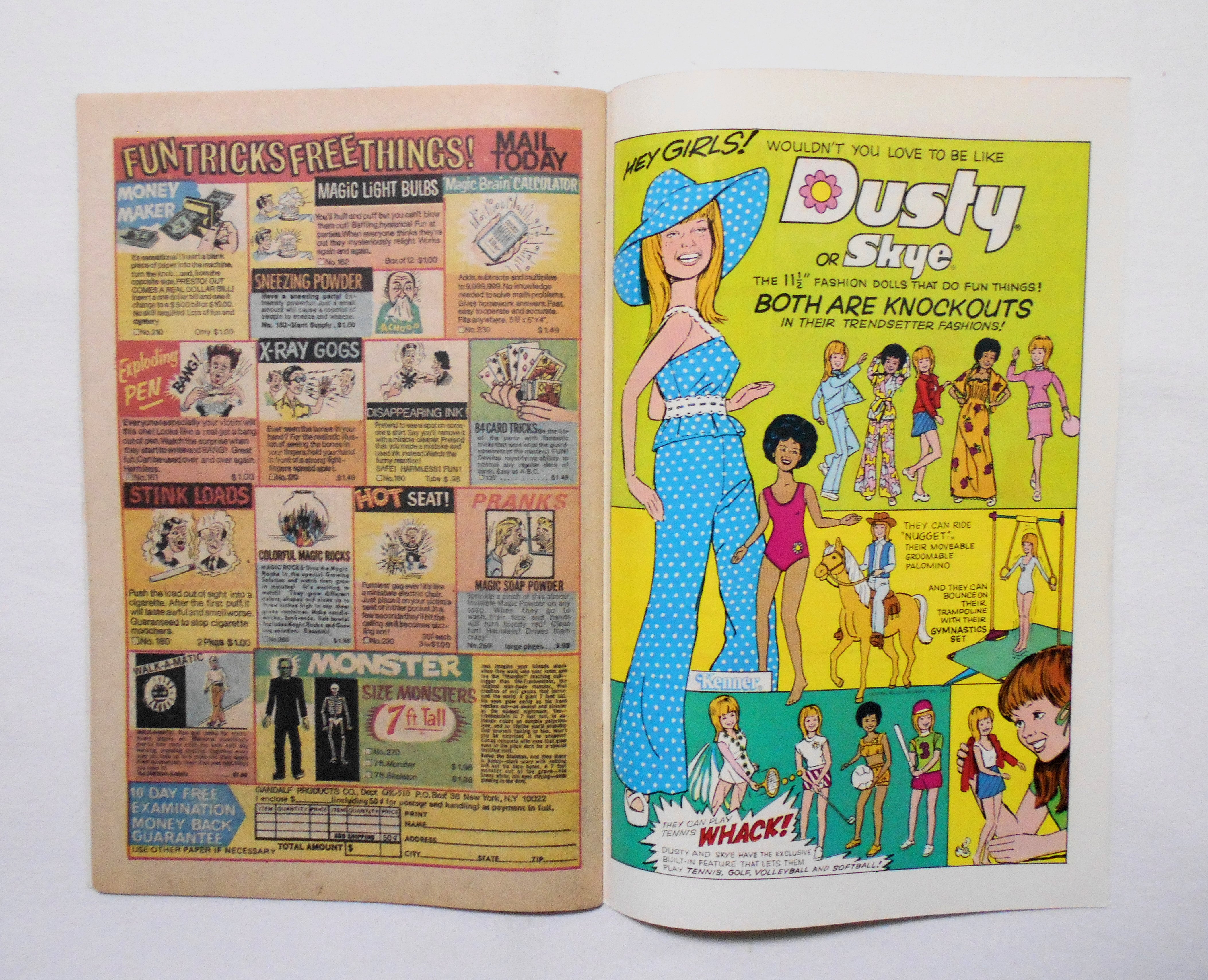 背から内側へ約1センチ縦方向に軽く折れ目が付いています。他、多少の擦れやシワ、黄ばみ、角の傷みや折れ等があり、経年に伴う使用感は否めませんが、1970年代の輸入中古コミックですので、その点を考慮頂ければと思います。中は目立った汚れやシミ等はなく、おおむねきれいな状態ですので、読むのに支障はございません。新品同様の美品をお求めの方や、中古品にご理解を頂けない方にお薦めは出来ません。