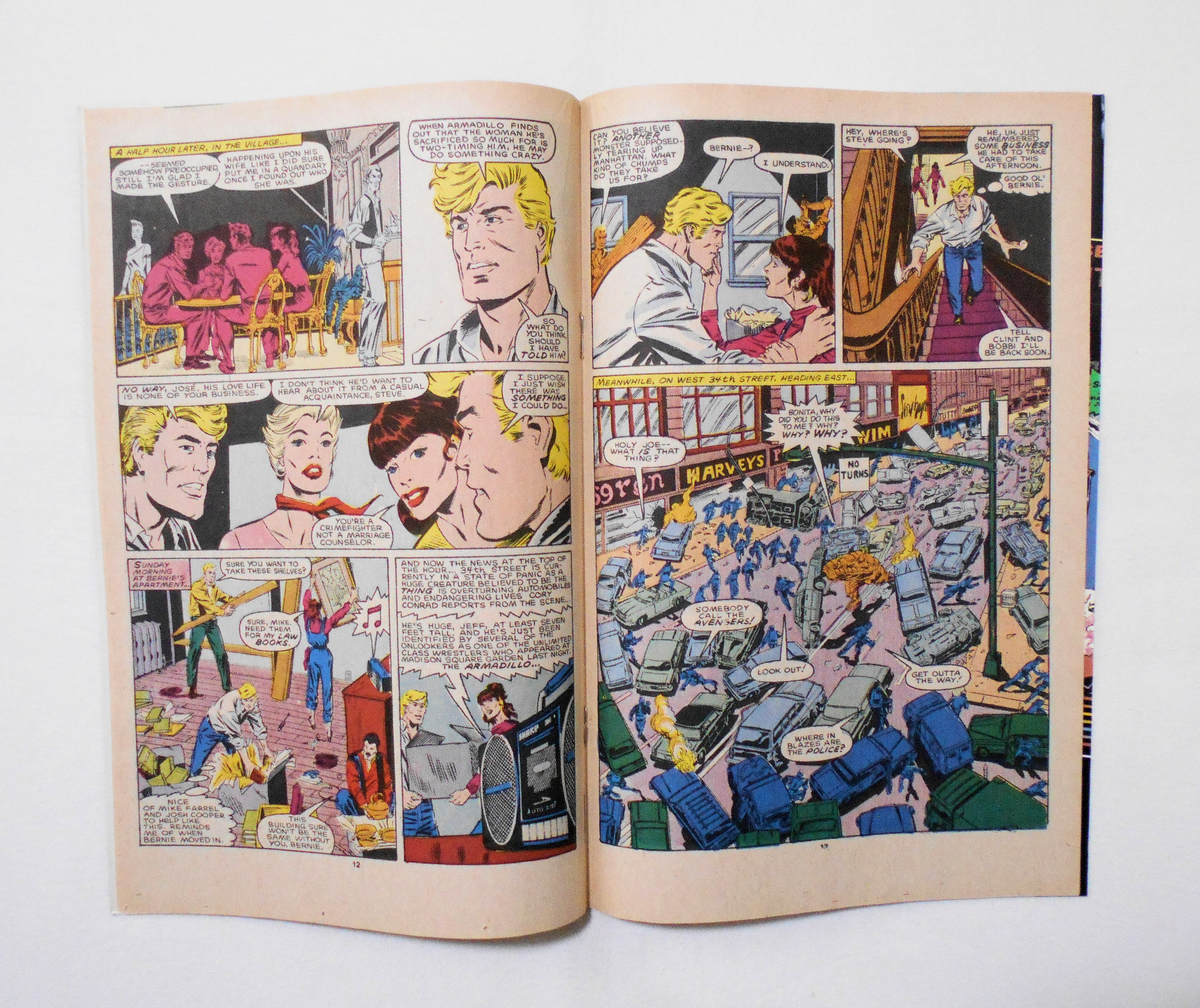 背から内側へ約1センチ縦方向に軽く折れ目が付いています。他、多少の擦れやシワ、黄ばみ、角や端の傷みや微折れ等があり、経年に伴う使用感は否めませんが、目立った汚れやシミ等はなく、1980年代の輸入中古コミックですので、その点を考慮頂ければ、普通程度~おおむねきれいな状態だと思います。新品同様の美品をお求めの方や、中古品にご理解が頂けない方にはお薦め出来ません。