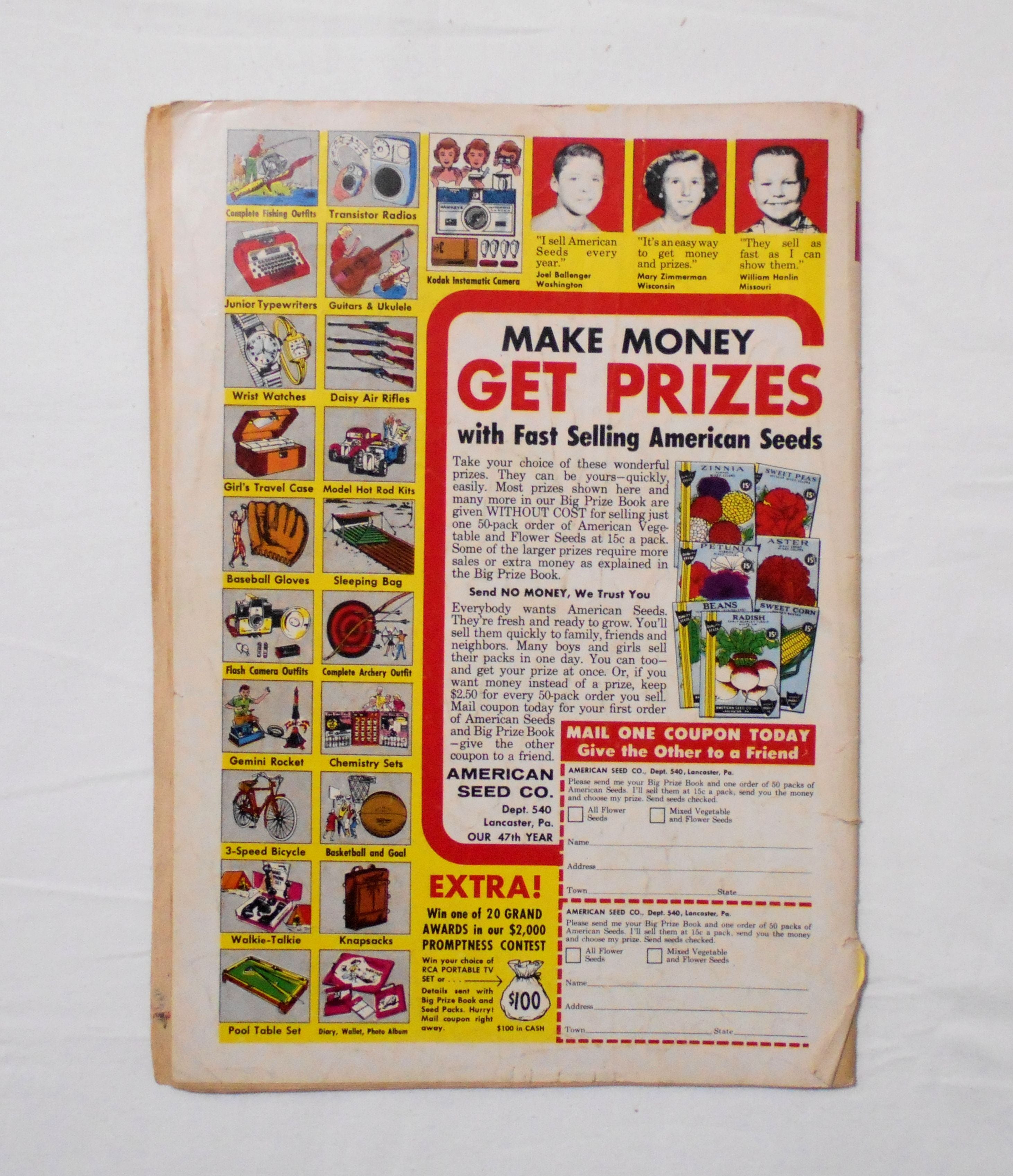 中央見開きページが本体から外れて、紛失しています。表紙に二付のスタンプが押されています。他、多少の擦れやシワ、黄ばみ、角や端の傷みや折れ、破れ等があり、経年に伴う使用感は強めと言え、保存状態は良くありません。1960年代の輸入中古コミックですので、その点を考慮頂ければと思います。中は多少黄ばんでいますが、目立った汚れやシミ等はなく、おおむねきれいですので、読むのに支障はございません。新品同様の美品をお求めの方や、古書にご理解を頂けない方にお薦めは出来ません。