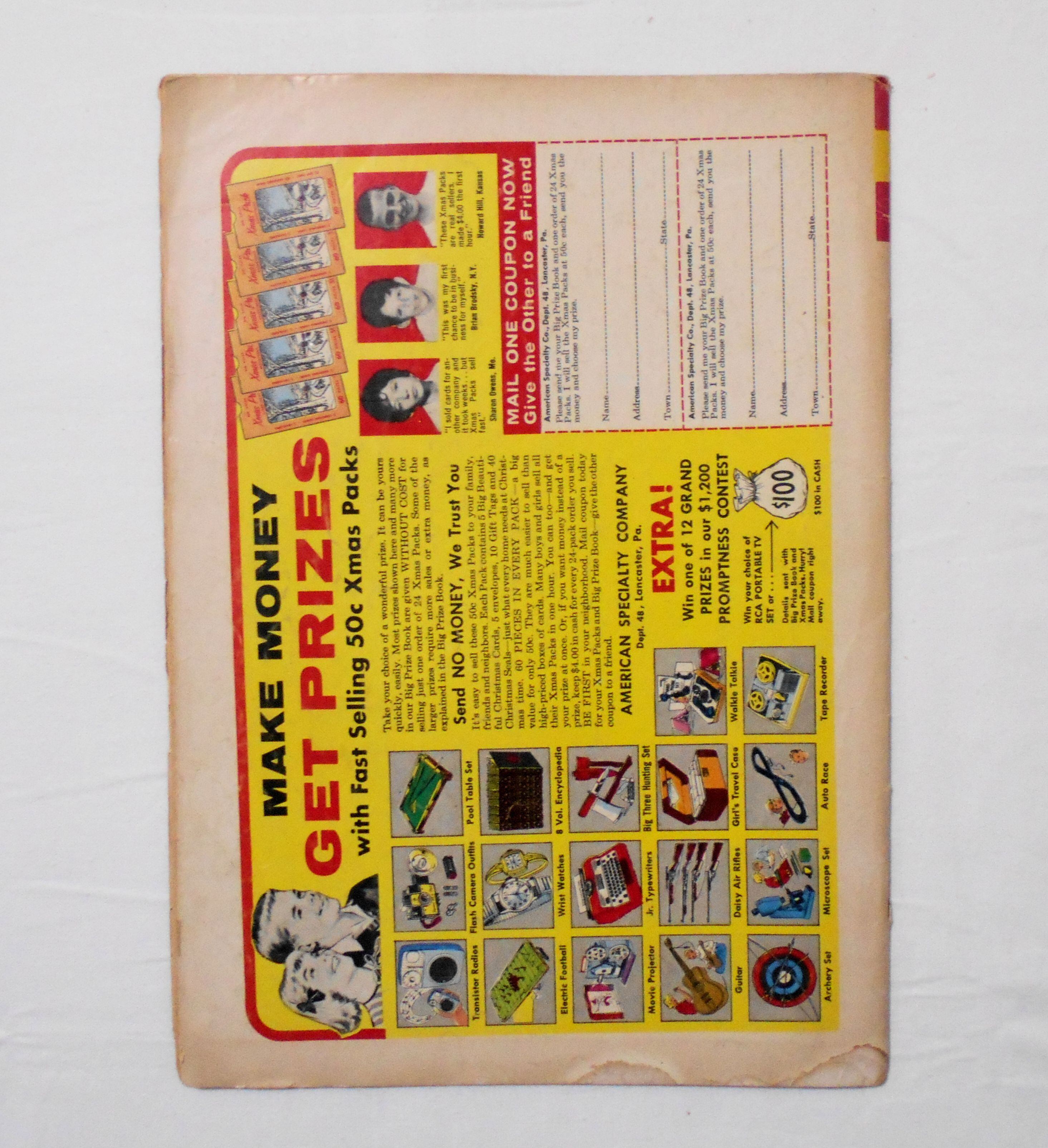 多少の擦れやシワ、黄ばみ、紙ジミ、角や端の傷みや折れ、破れ等があり、経年に伴う使用感は強めで、保存状態は良くありません。1960年代の輸入中古コミックですので、その点を考慮頂ければと思います。中は多少黄ばんでいますが、目立った汚れやシミ等はなく、おおむねきれいですので、読むのに支障はございません。新品同様の美品をお求めの方や、古書にご理解を頂けない方にお薦めは出来ません。