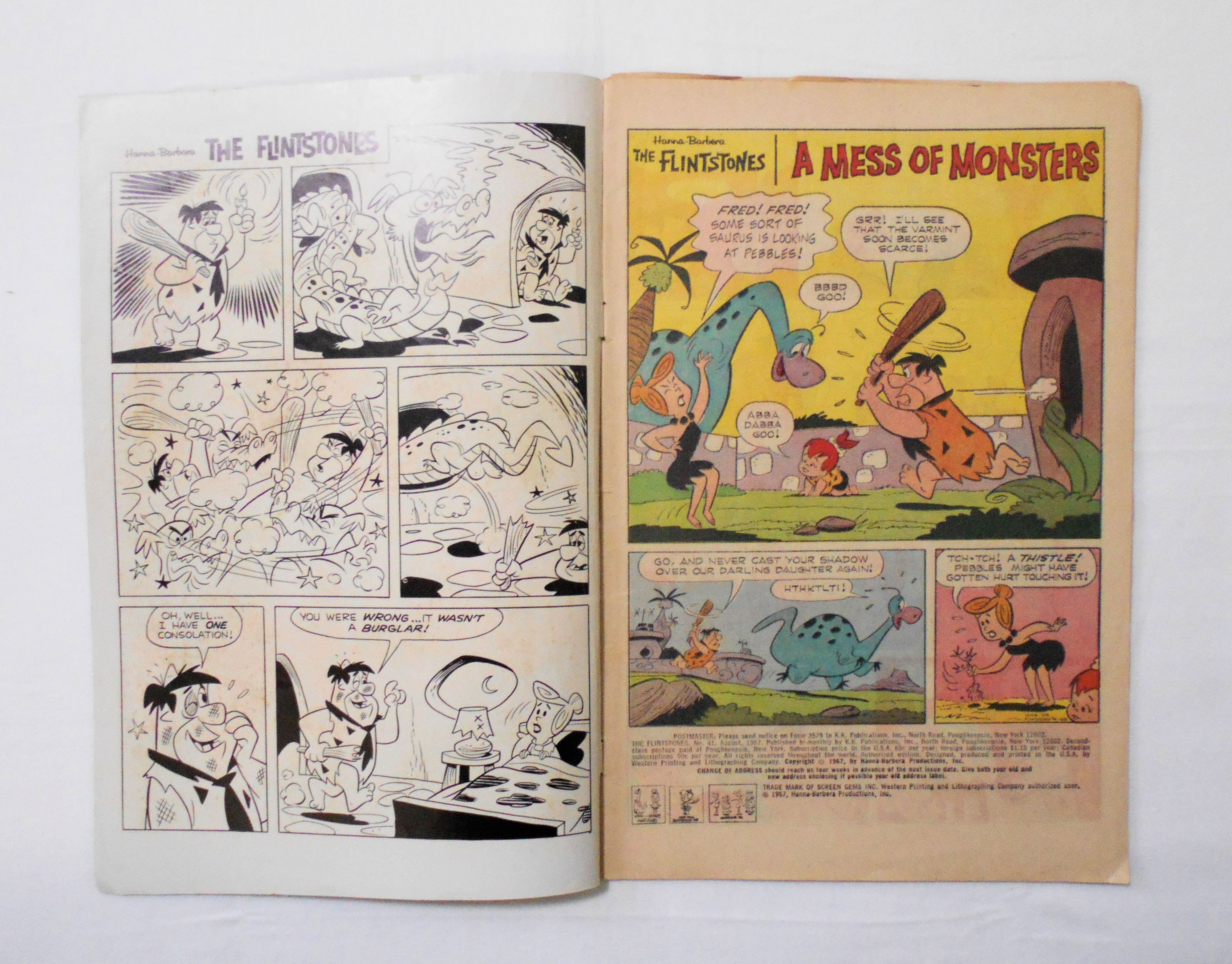 【HANNA BARBERA THE FLINTSTONES with PABBLES】 NO.41 AUG. 1967◆中古アメリカン・コミック。英文表記の洋書となります。◆28ページ(見開きページ欠品の為、本来は32ページ) フルカラー 大きさ約26×17センチ◆K.K.PUBLICATIONS, INC.◆WESTERN PRINTING & LITHOGRAPHING CO.◆COPYRIGHT 1967 by HANNA-BARBERA PRODUCTIONS, INC.
