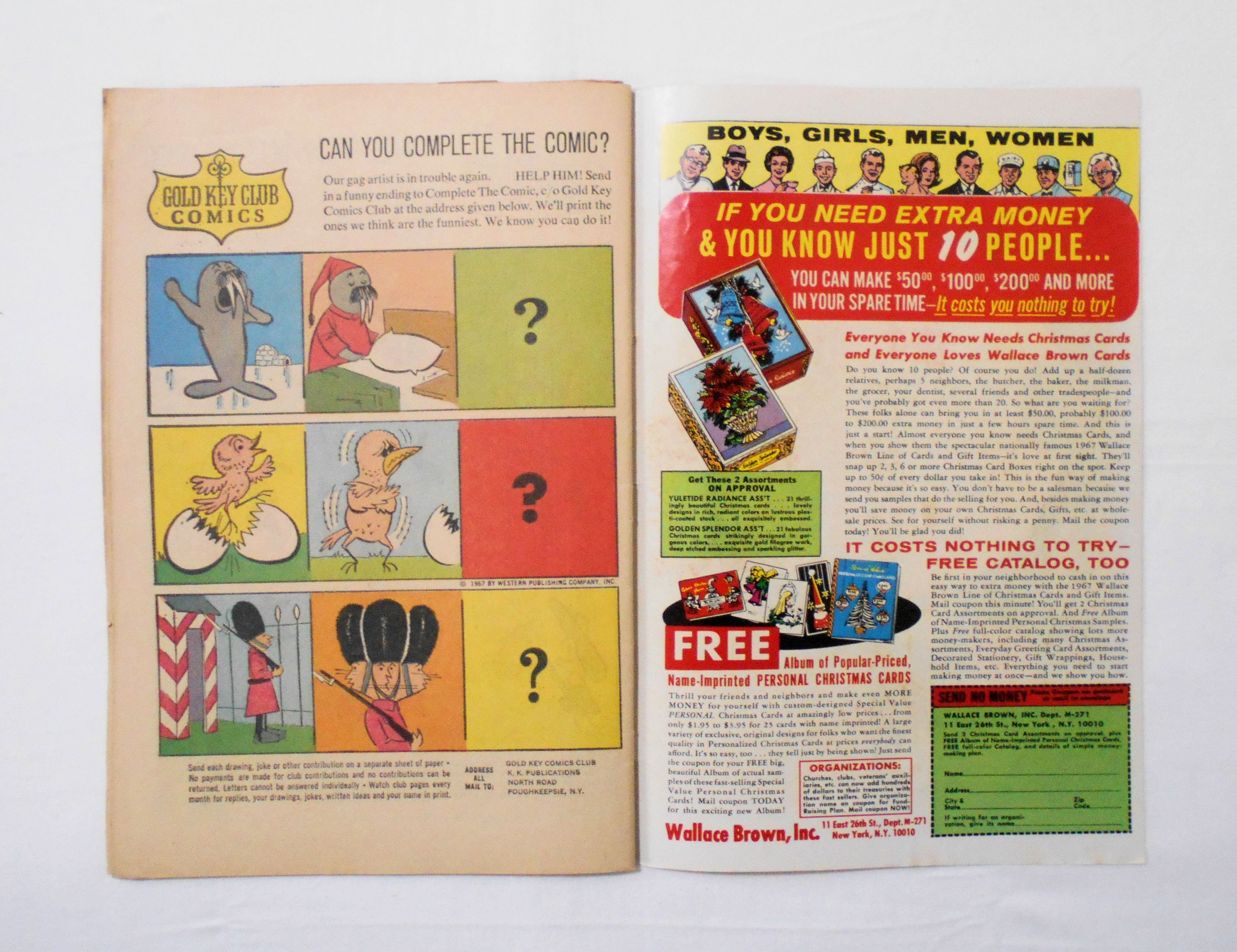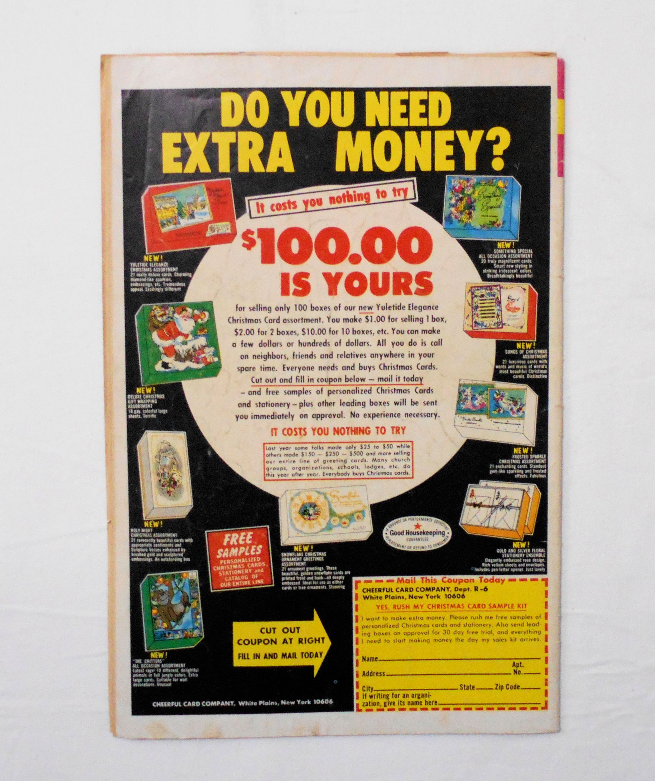 中央見開きの広告ページが紛失しており、さらに1枚が本体から外れています。他、多少の擦れやシワ、黄ばみ、紙ジミ、角や端の傷みや折れ、破れ等があり、経年に伴う使用感は強めと言えますが、1960年代の輸入中古コミックですので、その点を考慮頂ければと思います。中は多少黄ばんでいますが、目立った汚れやシミ等はなく、おおむねきれいですので、読むのに支障はございません。新品同様の美品をお求めの方や、古書にご理解を頂けない方にお薦めは出来ません。