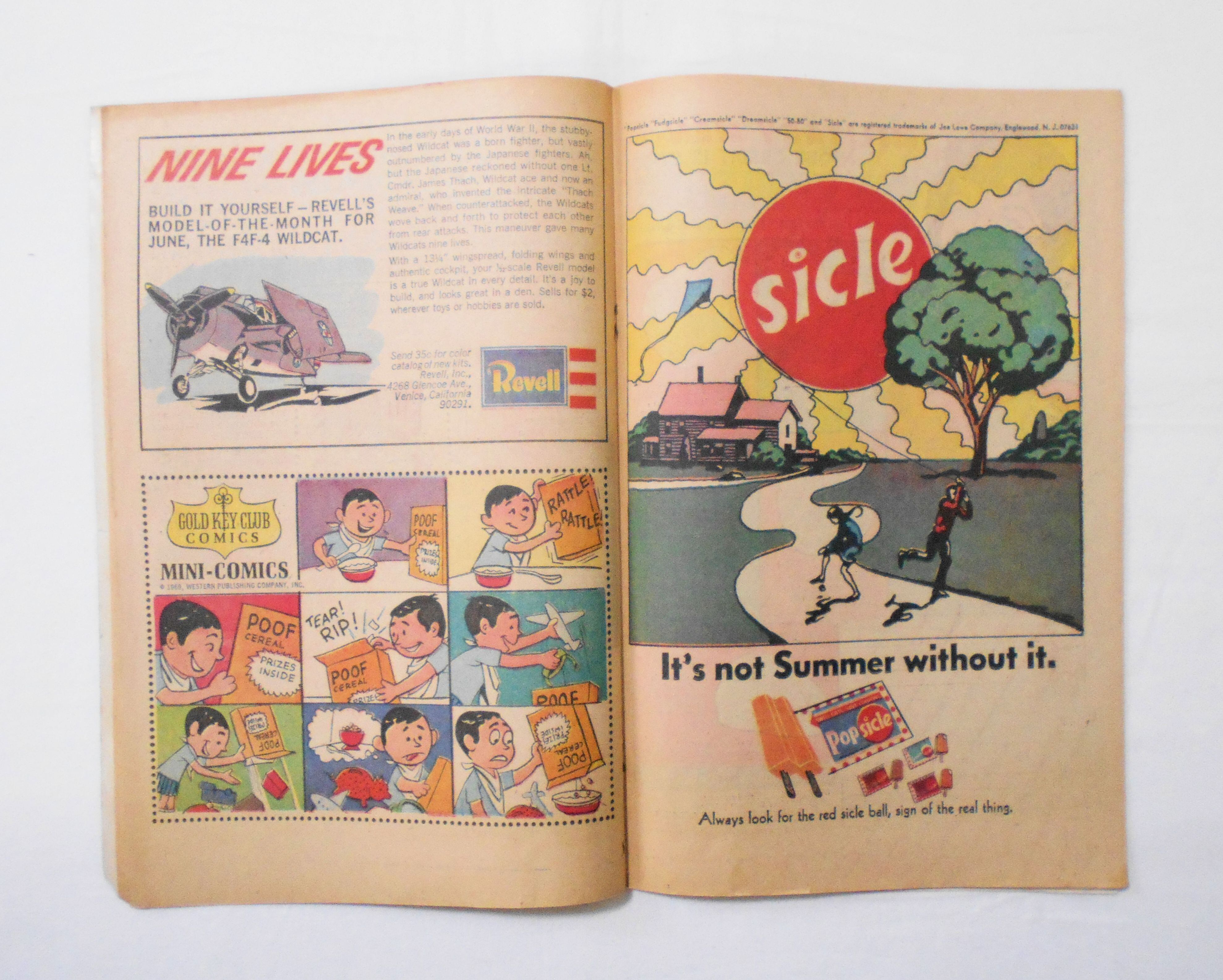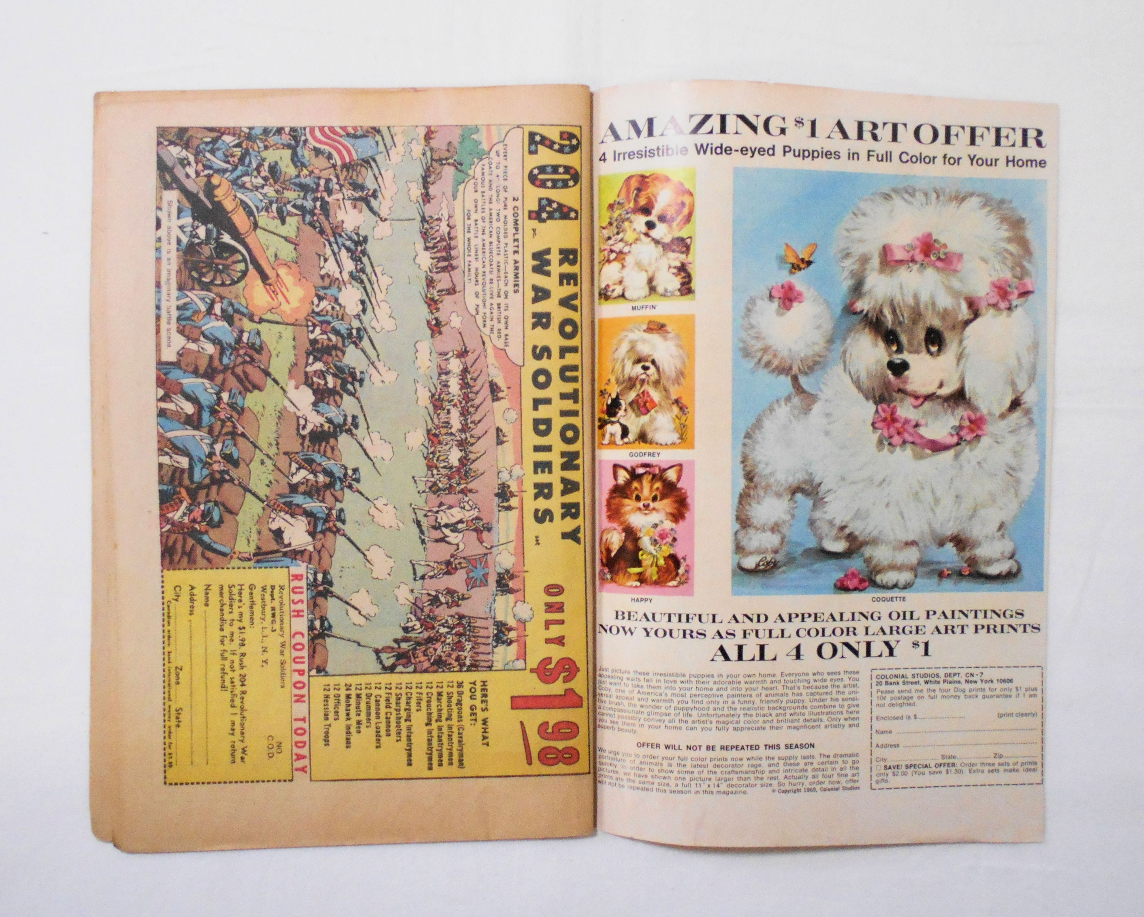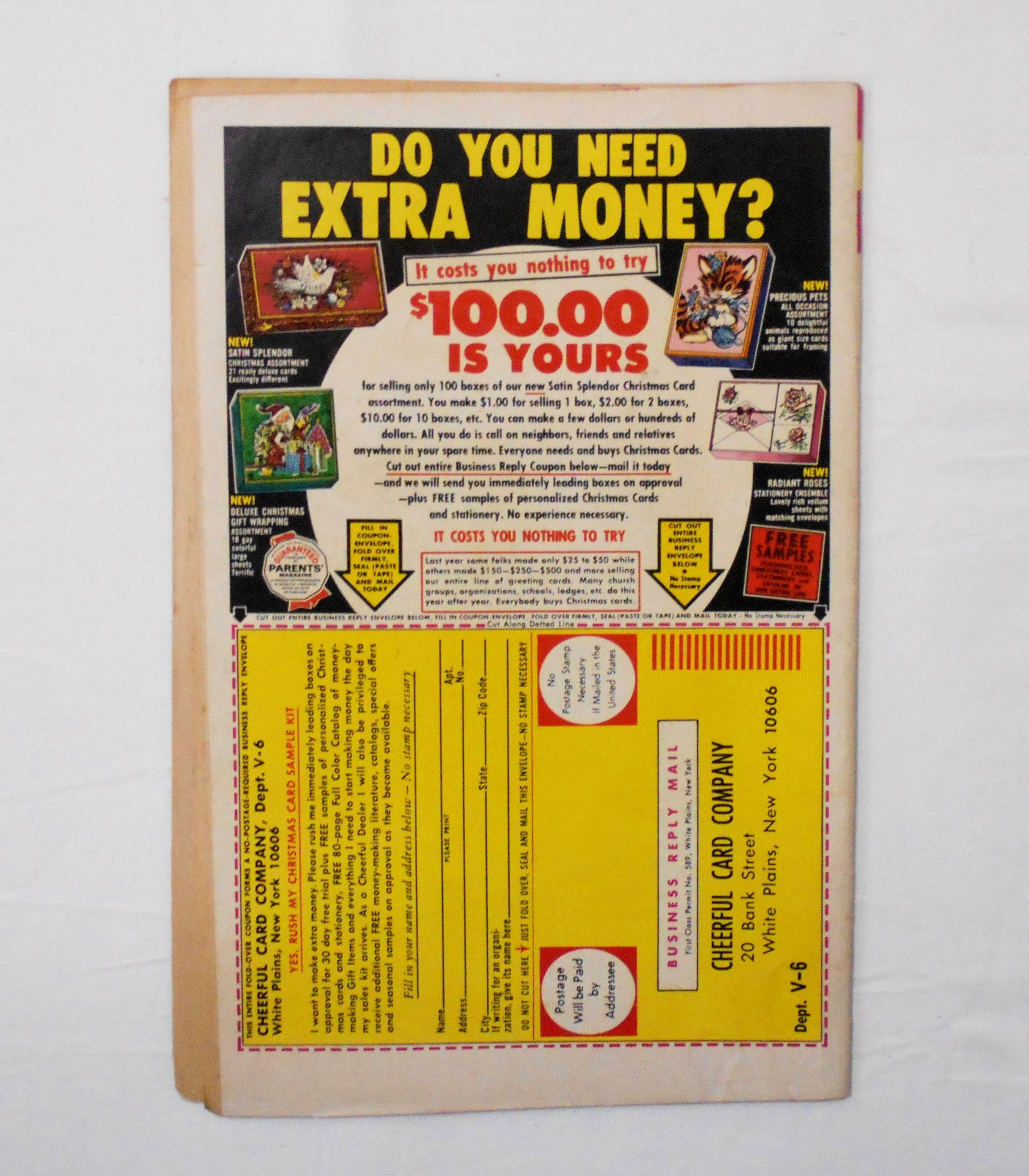 背の中心が斜めに歪み、本全体に歪みが生じています。他、多少の擦れやシワ、黄ばみ、紙ジミ、角や端の傷みや折れ、微破れ等があり、経年に伴う使用感は否めませんが、1960年代の輸入中古コミックですので、その点を考慮頂ければと思います。中は多少黄ばんでいますが、目立った汚れやシミ等はなく、おおむねきれいですので、読むのに支障はございません。新品同様の美品をお求めの方や、古書にご理解を頂けない方にお薦めは出来ません。