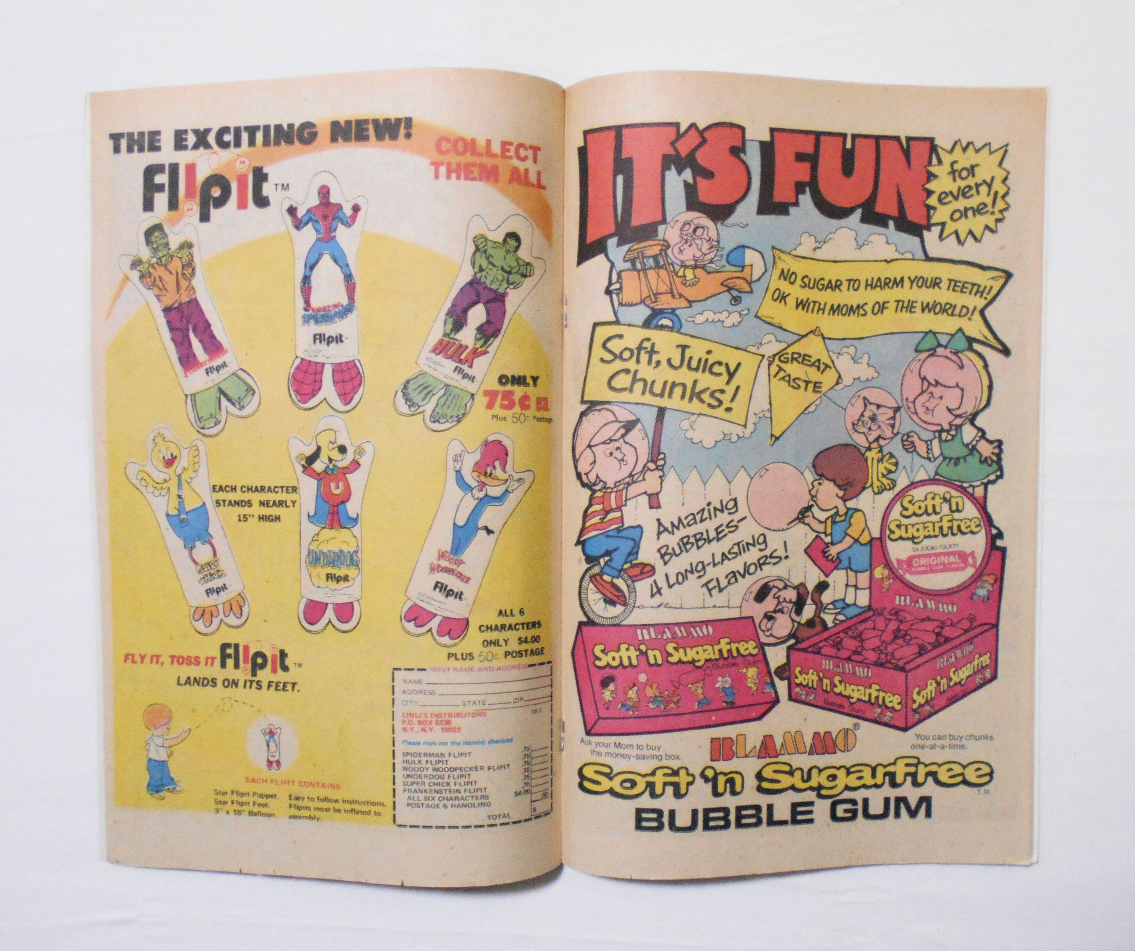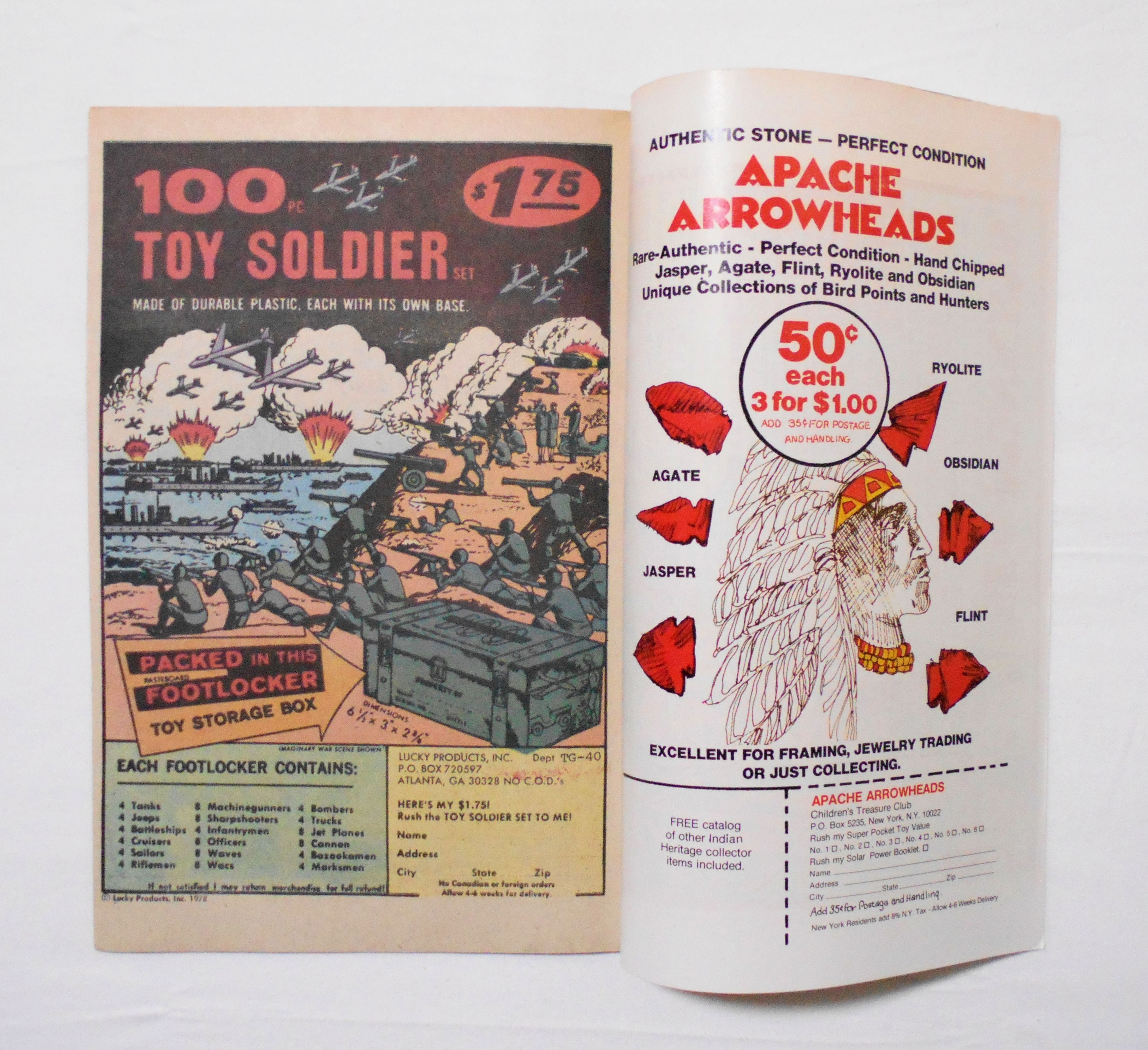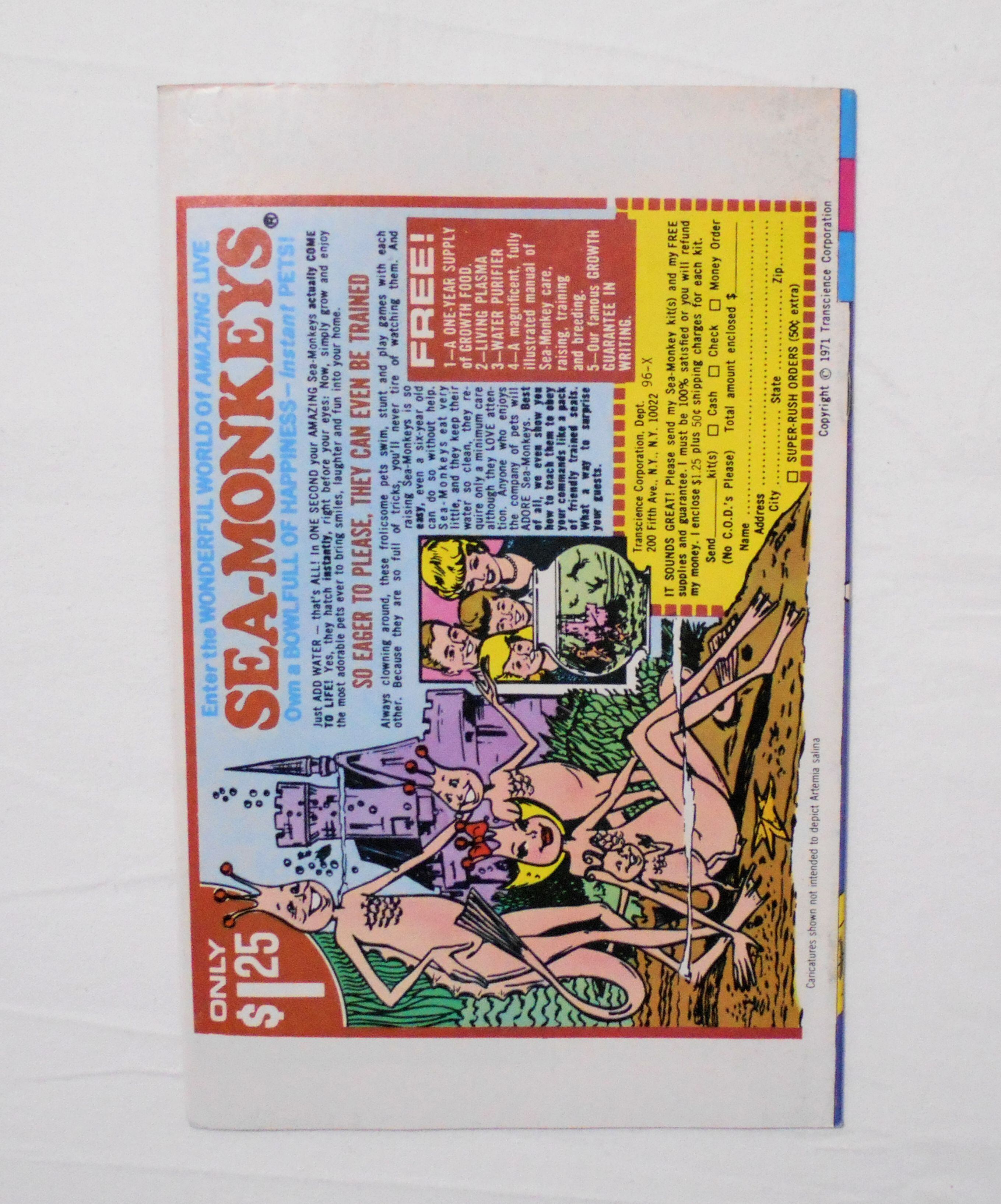 背から内側へ約2~3センチ縦方向に折れめが付いています。裏表紙の左上角に鉛筆で数字の書き込みがあります。他、多少の擦れやシワ、黄ばみ、紙ジミ、角や端の傷みや折れ等があり、経年に伴う使用感は否めませんが、中は目立った汚れやシミ等はなく、1970年代の輸入中古コミックですので、その点を考慮頂ければ、普通程度~おおむねきれいな状態だと思います。新品同様の美品をお求めの方や、古書にご理解を頂けない方にお薦めは出来ません。