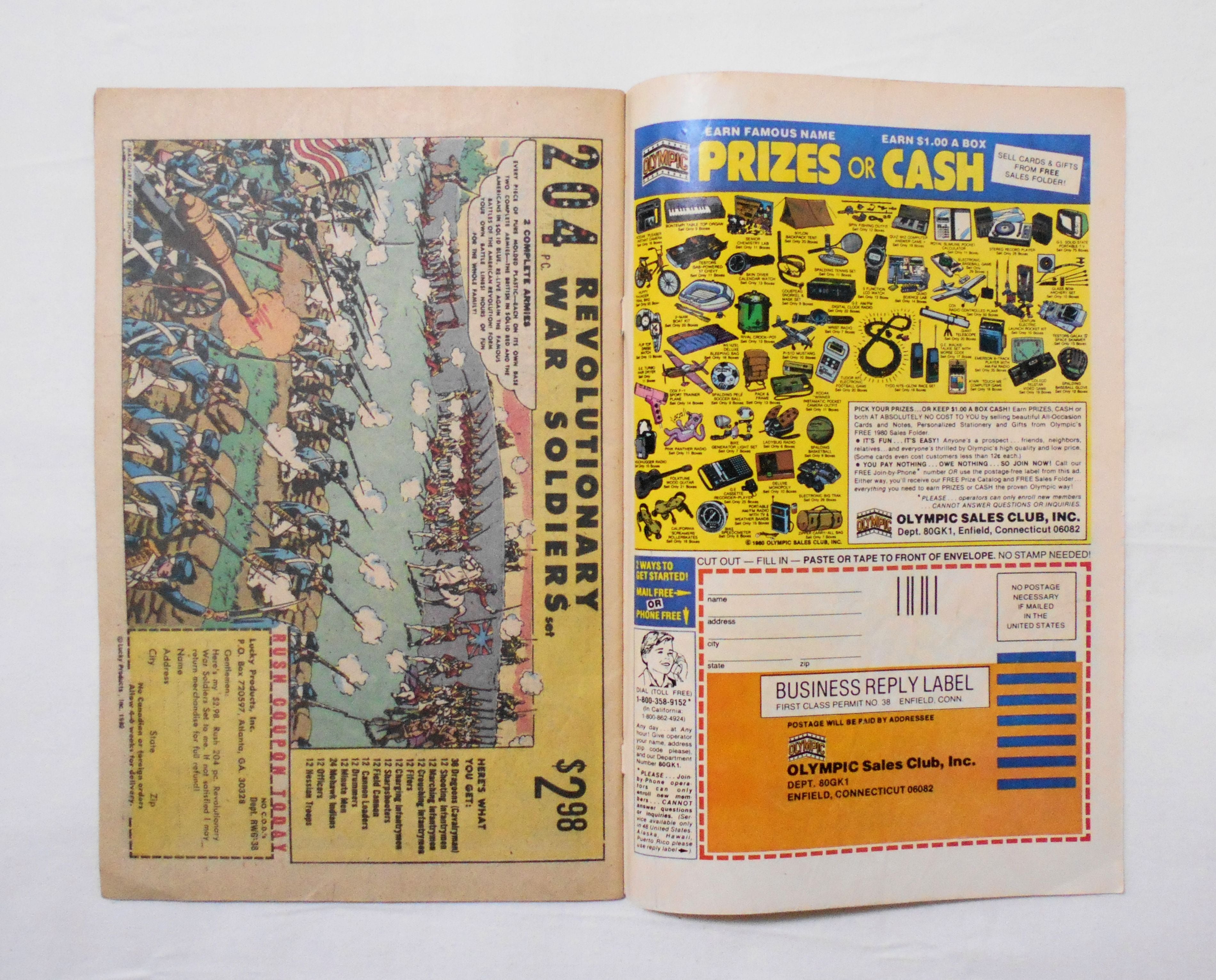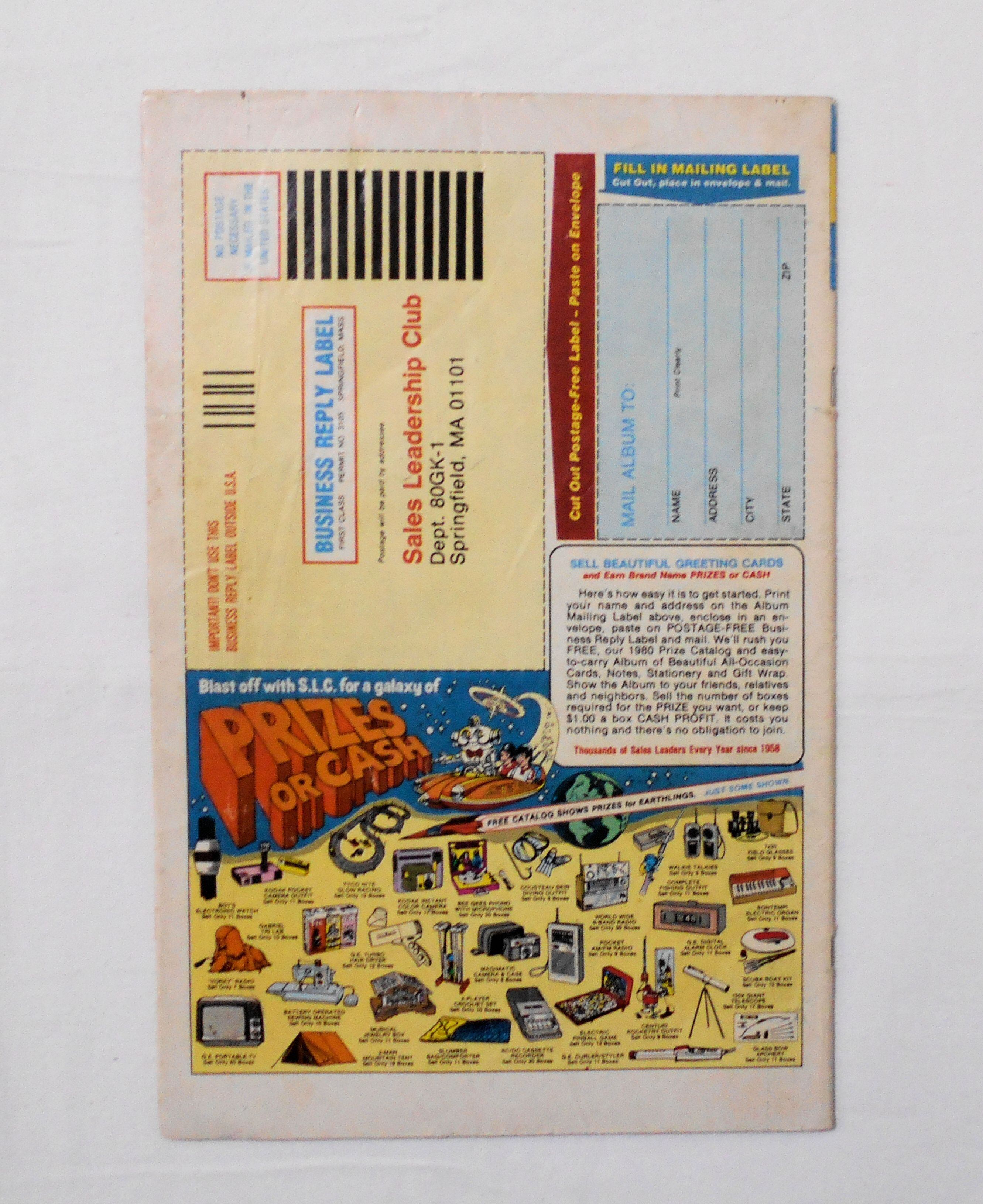 表紙の下端あたりに濡れシミがあり、裏側にも染みています。1ページ目にはほとんど影響は見られません。他、多少の擦れやシワ、黄ばみ、角や端の傷みや折れ、微破れ等があり、表紙の傷みが目立ち、経年に伴う使用感はやや強めと言えますが、1980年代の輸入中古コミックですので、その点を考慮頂ければ、普通程度と言える保存状態だと思います。中は目立った汚れやシミ等なく、おおむねきれいですので、読むのに支障はございません。新品同様の美品をお求めの方や、古書にご理解を頂けない方にお薦めは出来ません。