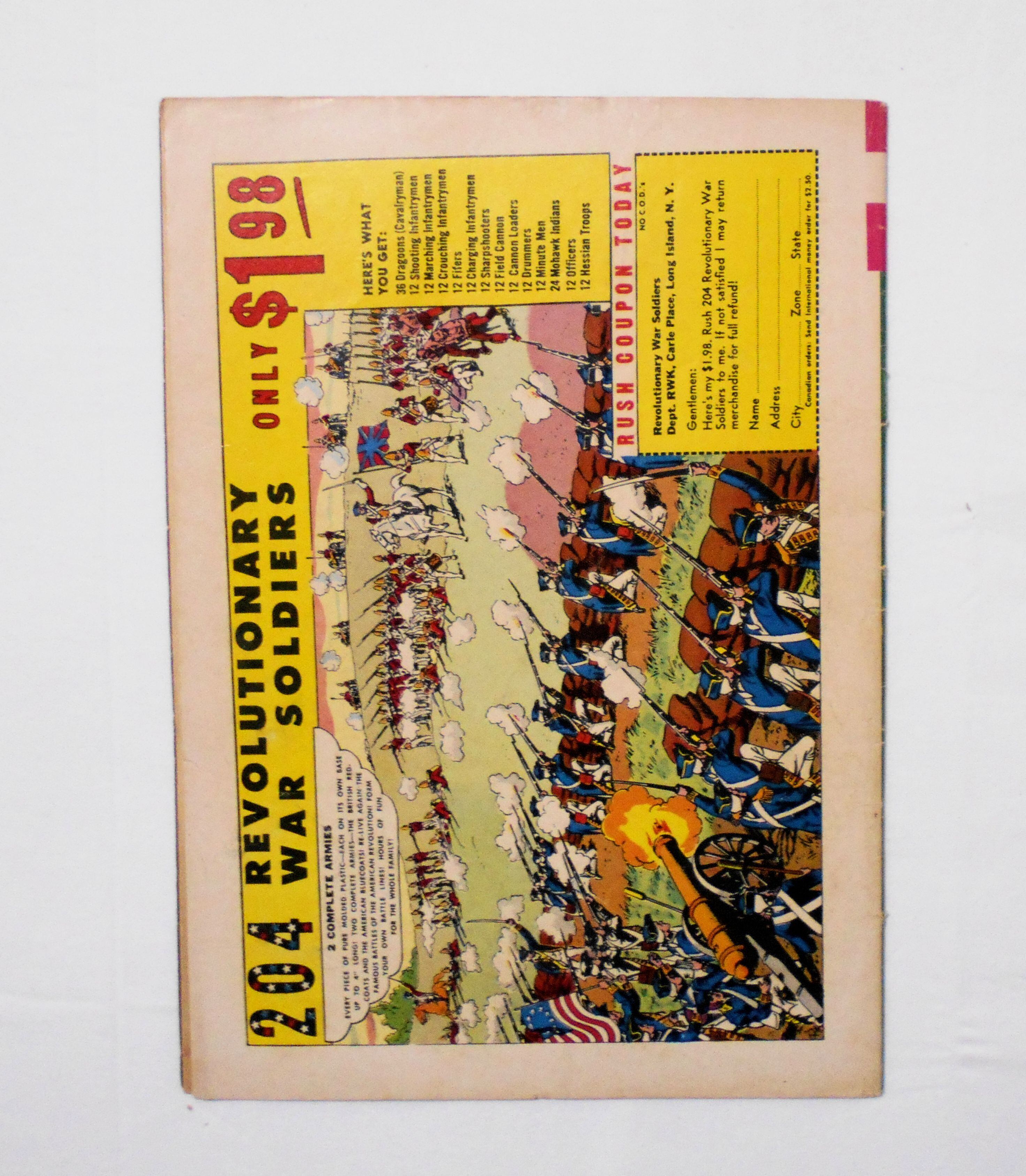 中央見開きページが紛失しています。他、多少の擦れやシワ、黄ばみ、紙ジミ、角や端の傷みや折れ、破れ等があり、経年に伴う使用感は強めと言えますが、1960年代の輸入中古コミックですので、その点を考慮頂ければ、普通程度と言える保存状態だと思います。中は黄ばんでいますが、目立った汚れやシミ等はなく、おおむねきれいですので、読むのに支障はございません。新品同様の美品をお求めの方や、古書にご理解を頂けない方にお薦めは出来ません。