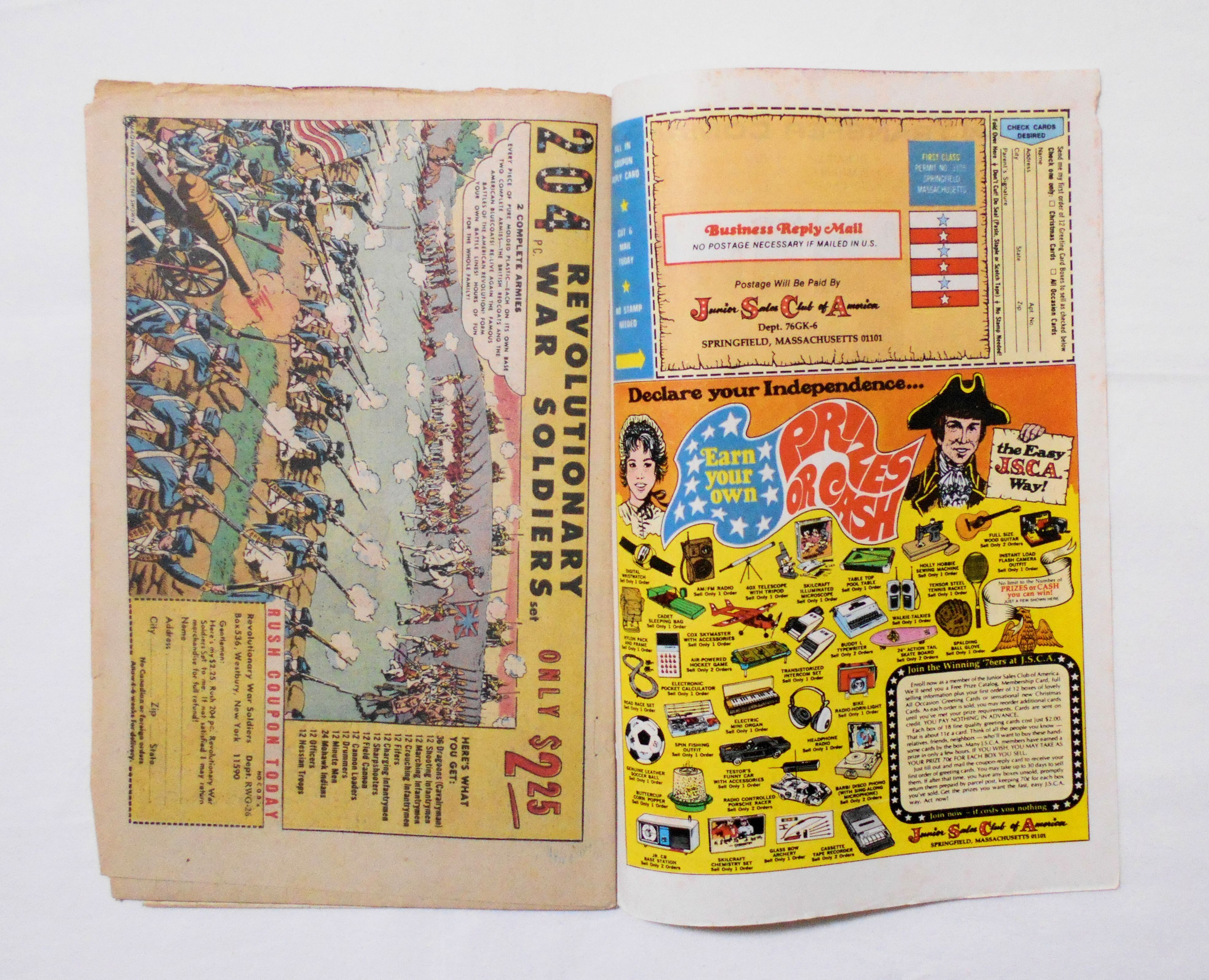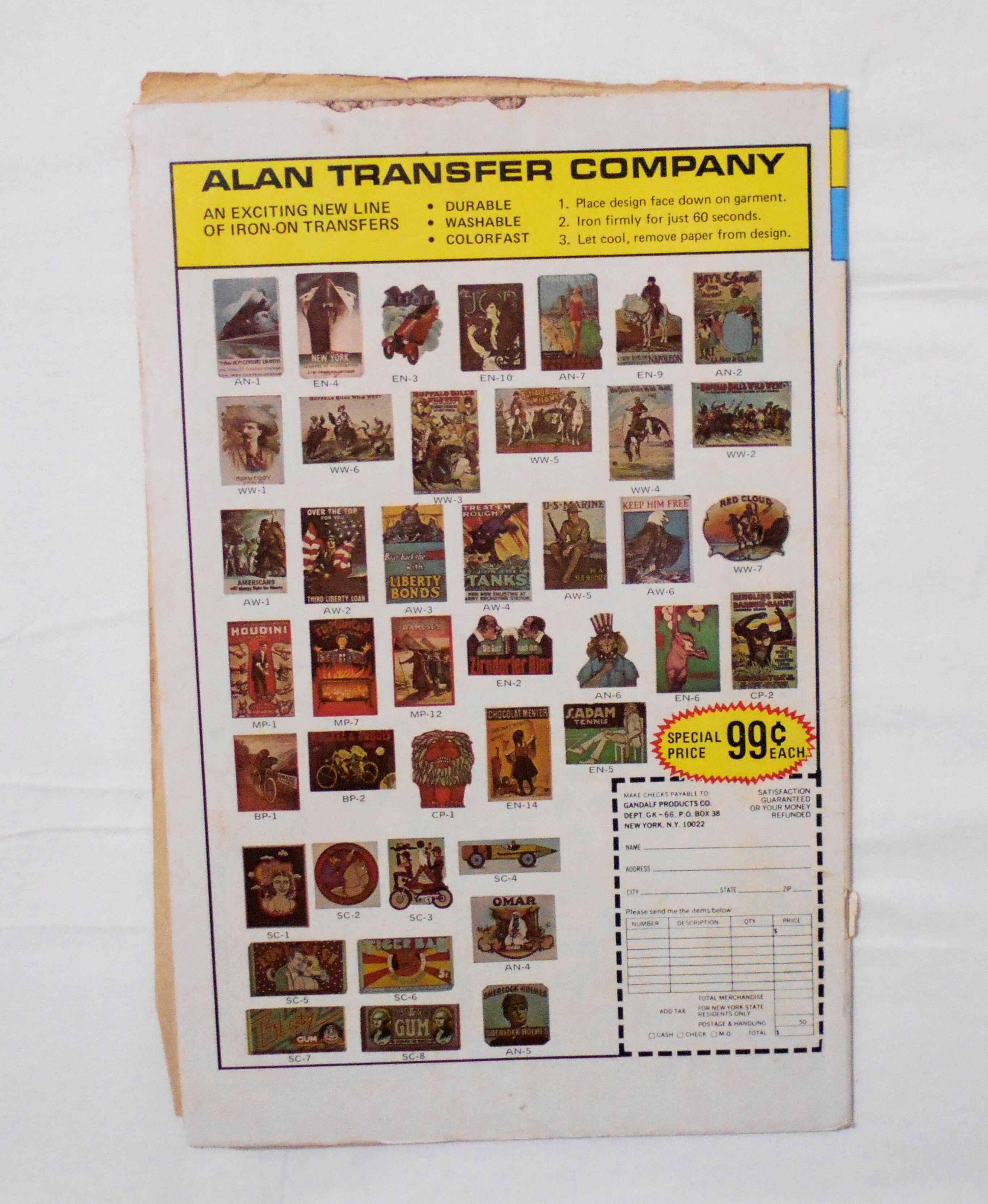 表紙の下ホッチキス部分が本体から外れています。背の中心がズレており、コミックに多少の歪みが生じており、表紙からはみ出したページの端がボロボロに傷んでいます。他、多少の擦れやシワ、黄ばみ、紙ジミ、角や端の傷みや折れ等があり、経年に伴う使用感はかなり強めで、保存状態は良くありません。1970年代の輸入中古コミックですので、その点を考慮頂ければと思います。中は多少黄ばんでいますが、目立った汚れやシミ等はなくおおむねきれいですので、読むのに支障はございません。新品同様の美品をお求めの方や、古書にご理解が頂けない方へはお薦めはできません。