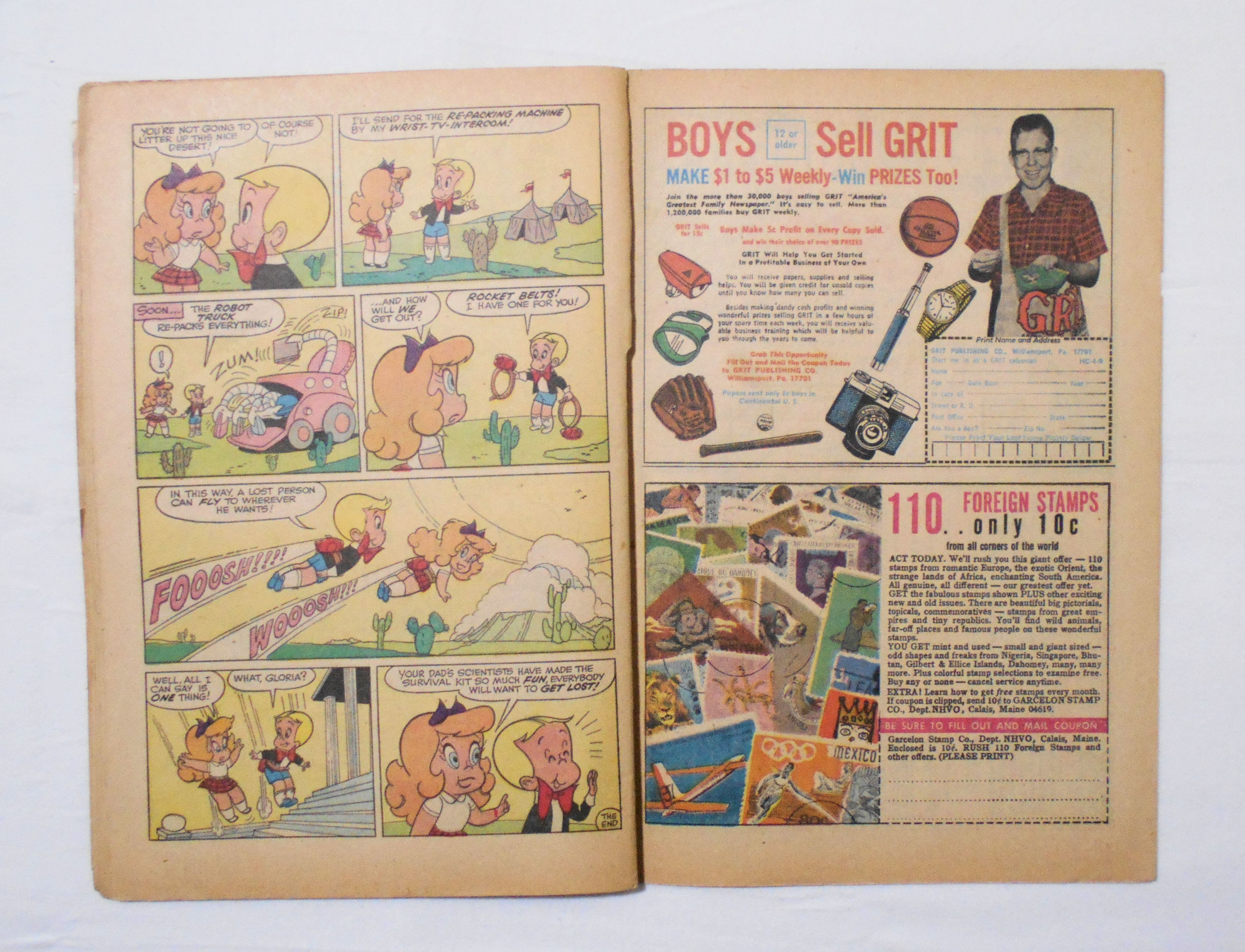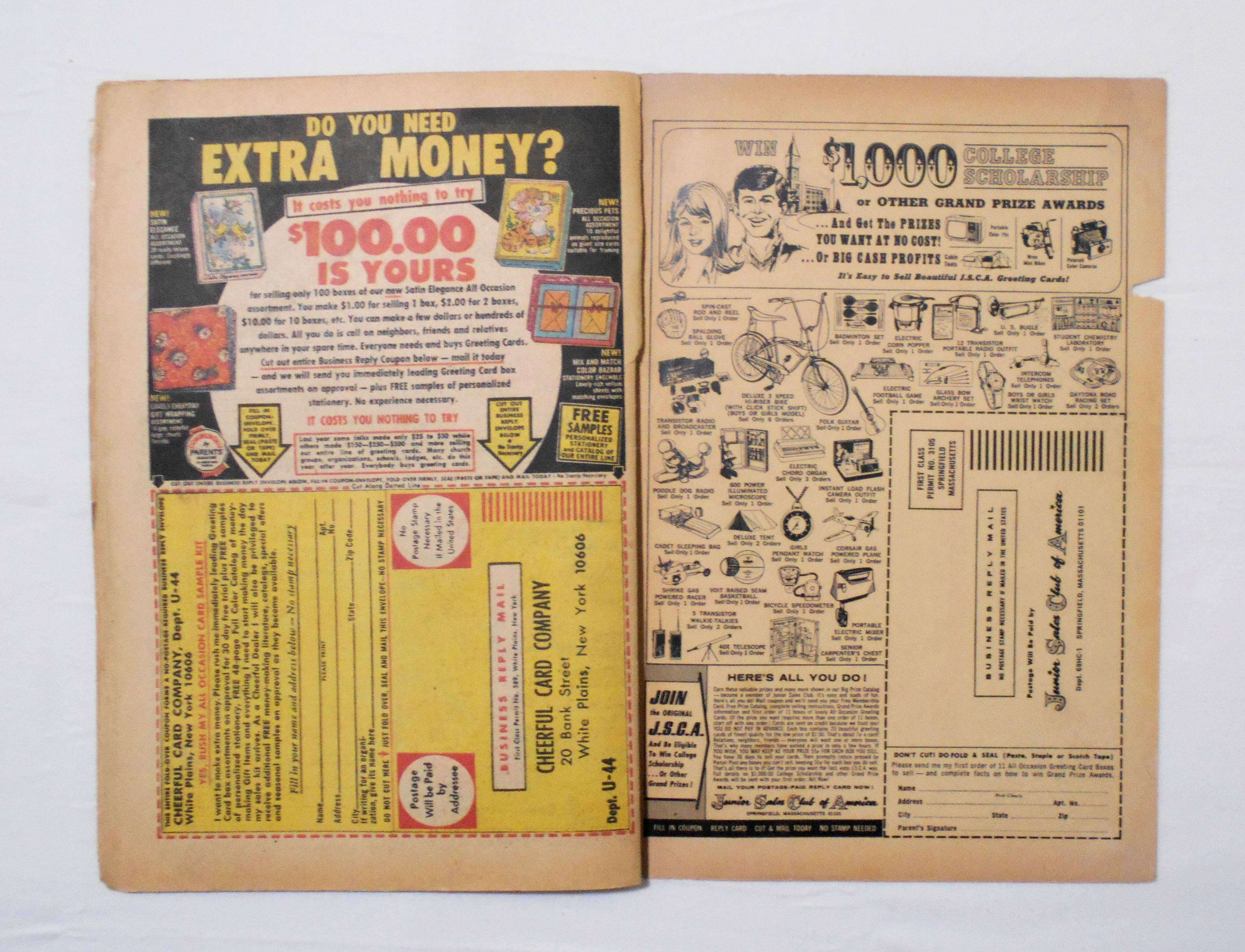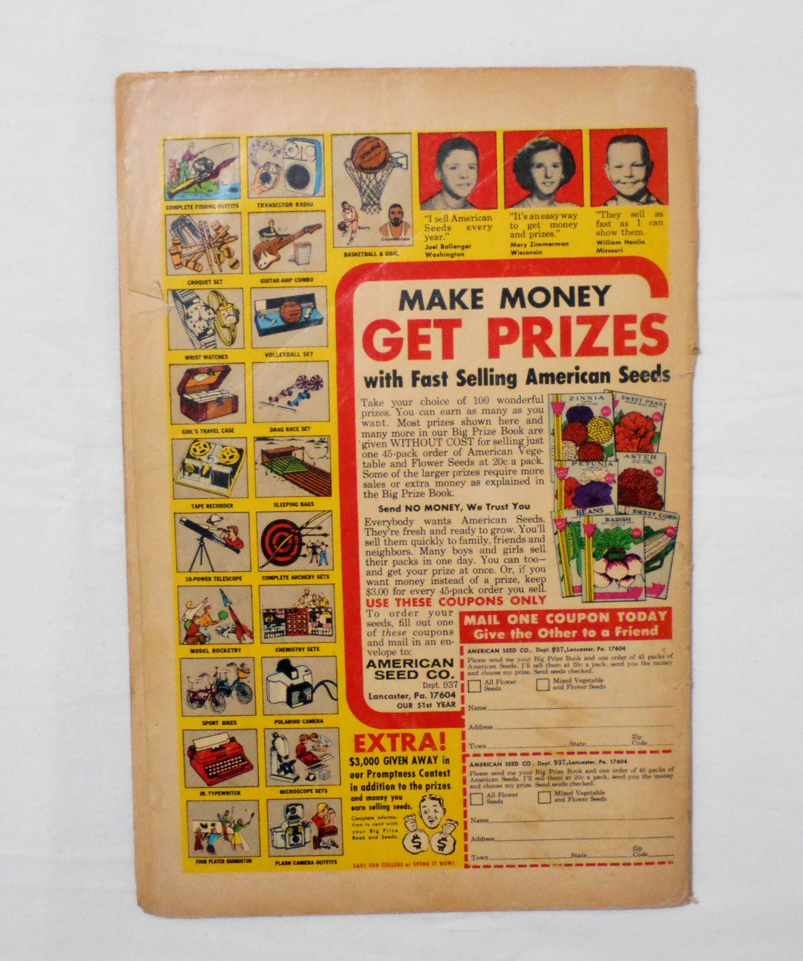 背が上端から10センチほどあたりまで破れ、今は下ホッチキス部分でかろうじてカバーと本体が付いている状態です。他、破れや折れ、シワ等本の傷みが激しく、保存状態は悪いです。1960年代の輸入中古コミックですので、その点を考慮頂ければと思います。中は黄ばんでいますが、目立った汚れやシミ等はなく、読むのに支障はございません。新品同様の美品をお求めの方や、古書にご理解を頂けない方にお薦めは出来ません。