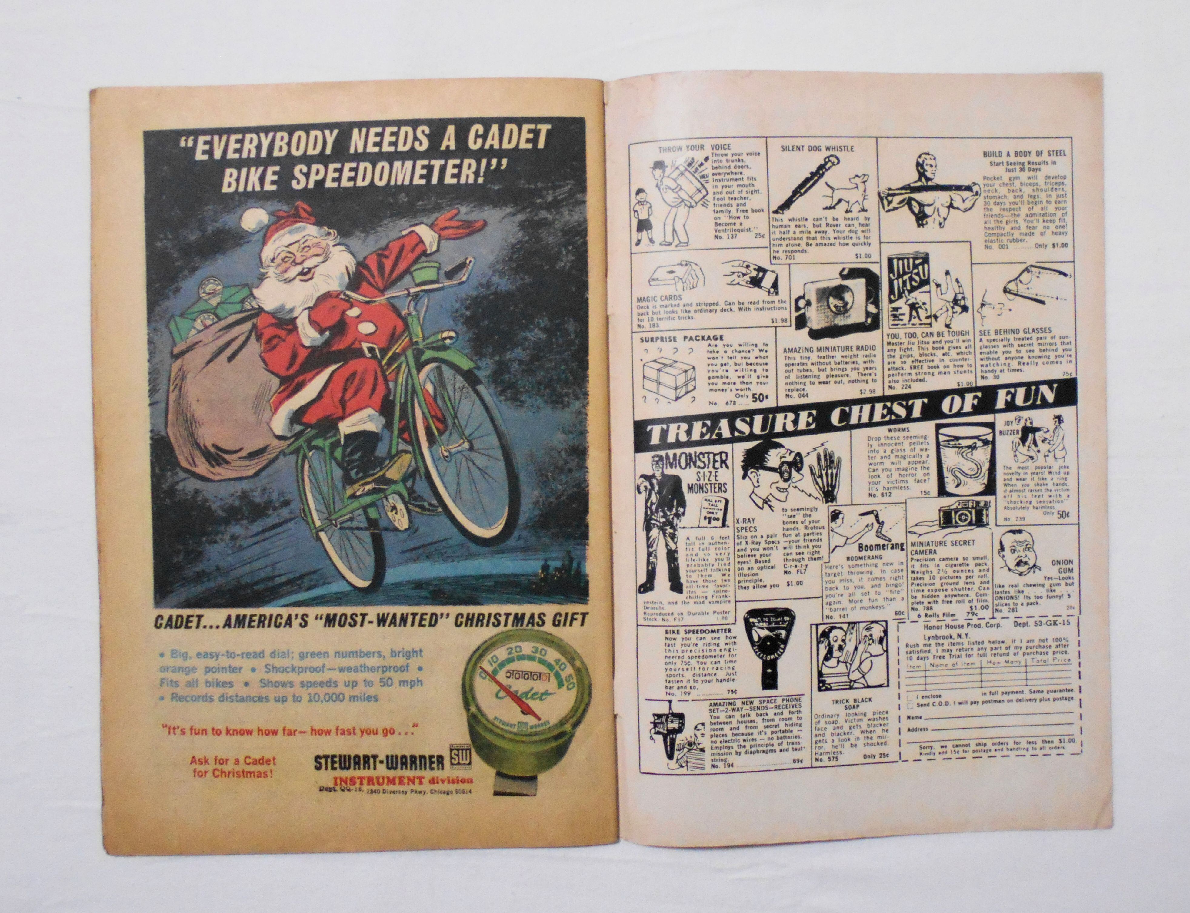 表紙の上端に数字の書き込みがあります。同じく表紙のオードリーが持っている雪玉製造機あたりの表面が僅かに剥がれています。他、多少の擦れやシワ、黄ばみ、角や端の傷みや折れ、破れ(最後の2枚下端に1センチほどの破れアリ)等があり、経年に伴う使用感や劣化は否めませんが、目立った汚れやシミ等は無く、1960年代の輸入中古雑誌であることを考慮頂ければ、普通程度~おおむね良好と言える保存状態だと思います。新品同様の美品をお求めの方や、古書にご理解が頂けない方にはお薦め出来ません。