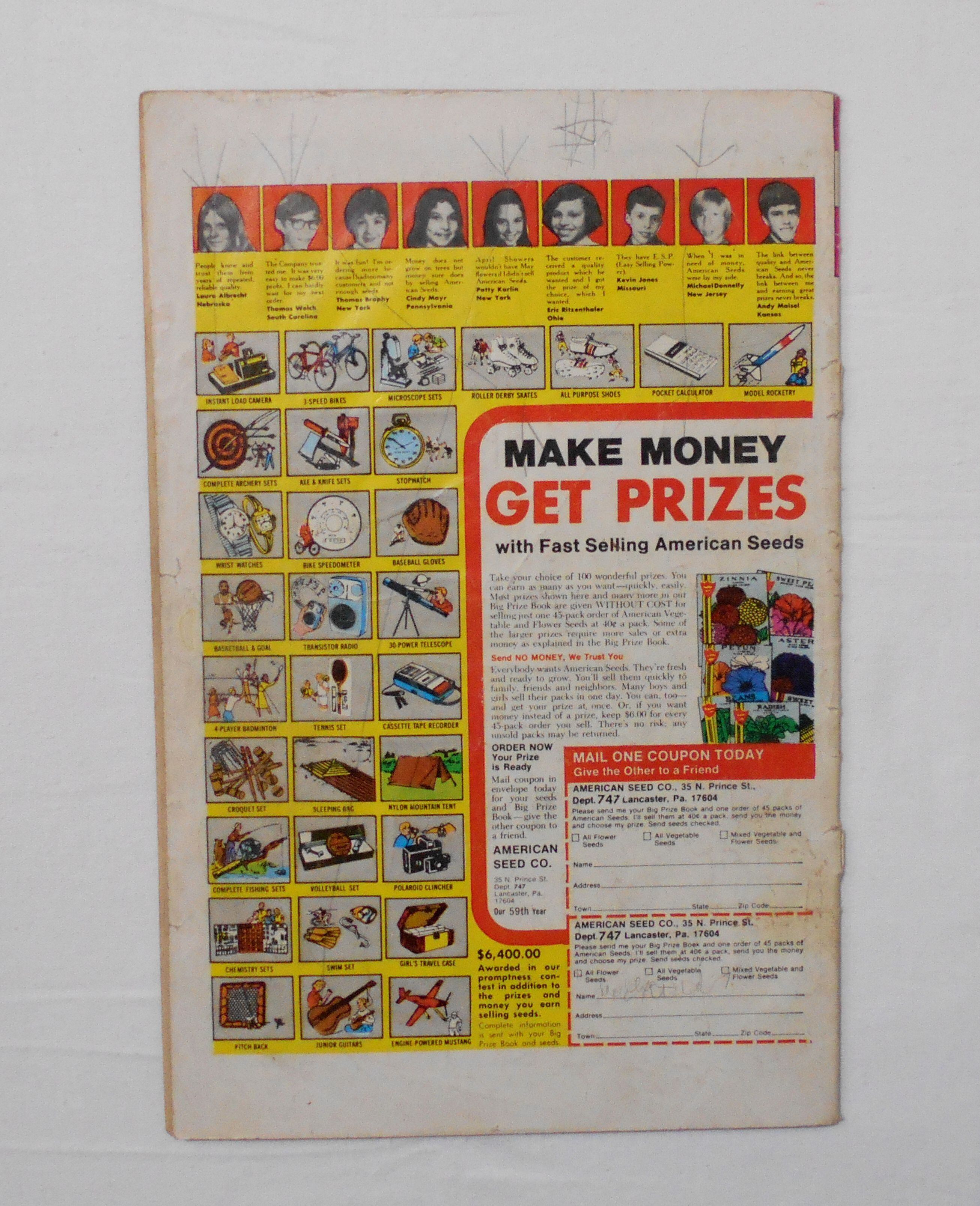 カバーのホッチキス部分が破れ、本体と外れています。裏表紙に書き込み(落書き)があります。他、多少の擦れやシワ、黄ばみ、角や端の傷みや折れ、破れ等があり、経年に伴う使用感は強めと言え、保存状態は良くありません。1970年代の輸入中古コミックですので、その点を考慮頂ければと思います。中は目立った汚れやシミ等はなく、おおむねきれいな状態ですので、読むのに支障はございません。美品をお求めの方や、古書にご理解を頂けない方にお薦めは出来ません。