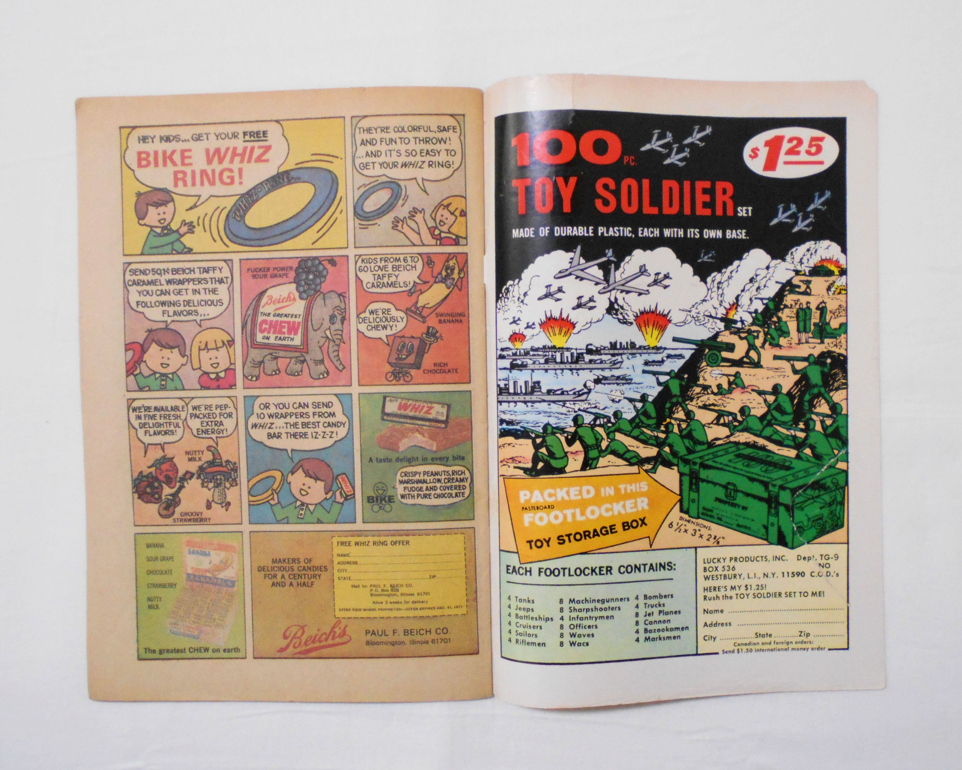 表紙の背から内側へ5センチほどの破れアリ。他、多少の擦れやシワ、黄ばみ、紙ジミ、汚れ、角や端の傷みや折れ、破れ等があり、経年に伴う使用感は否めませんが、1970年代の輸入中古コミックですので、その点を考慮頂ければ、普通程度~おおむねきれいな状態だと思います。中は多少黄ばんでいますが、目立った汚れやシミ等はなく、おおむねきれいですので、読むのに支障はございません。新品同様の美品をお求めの方や、古書にご理解を頂けない方にお薦めは出来ません。