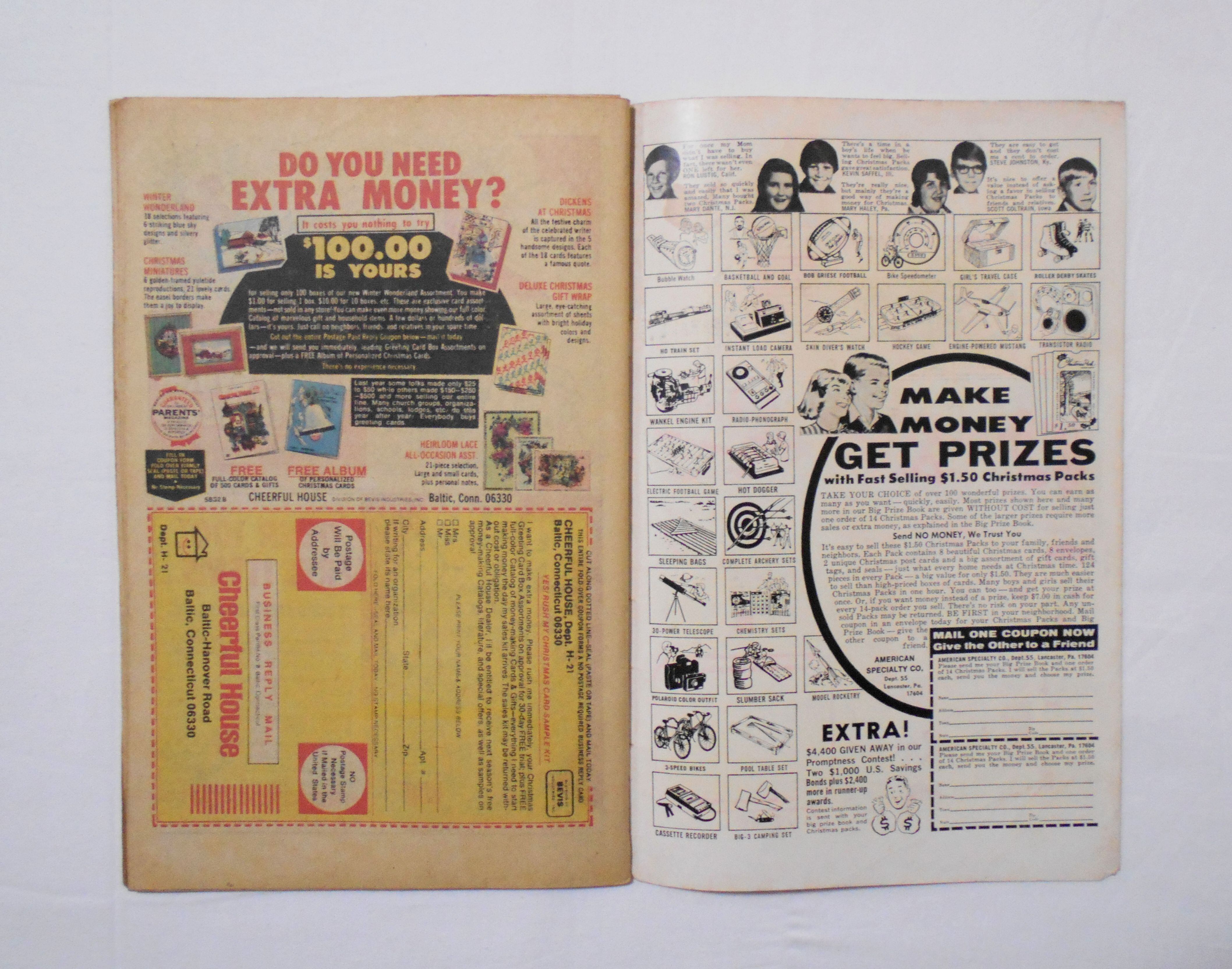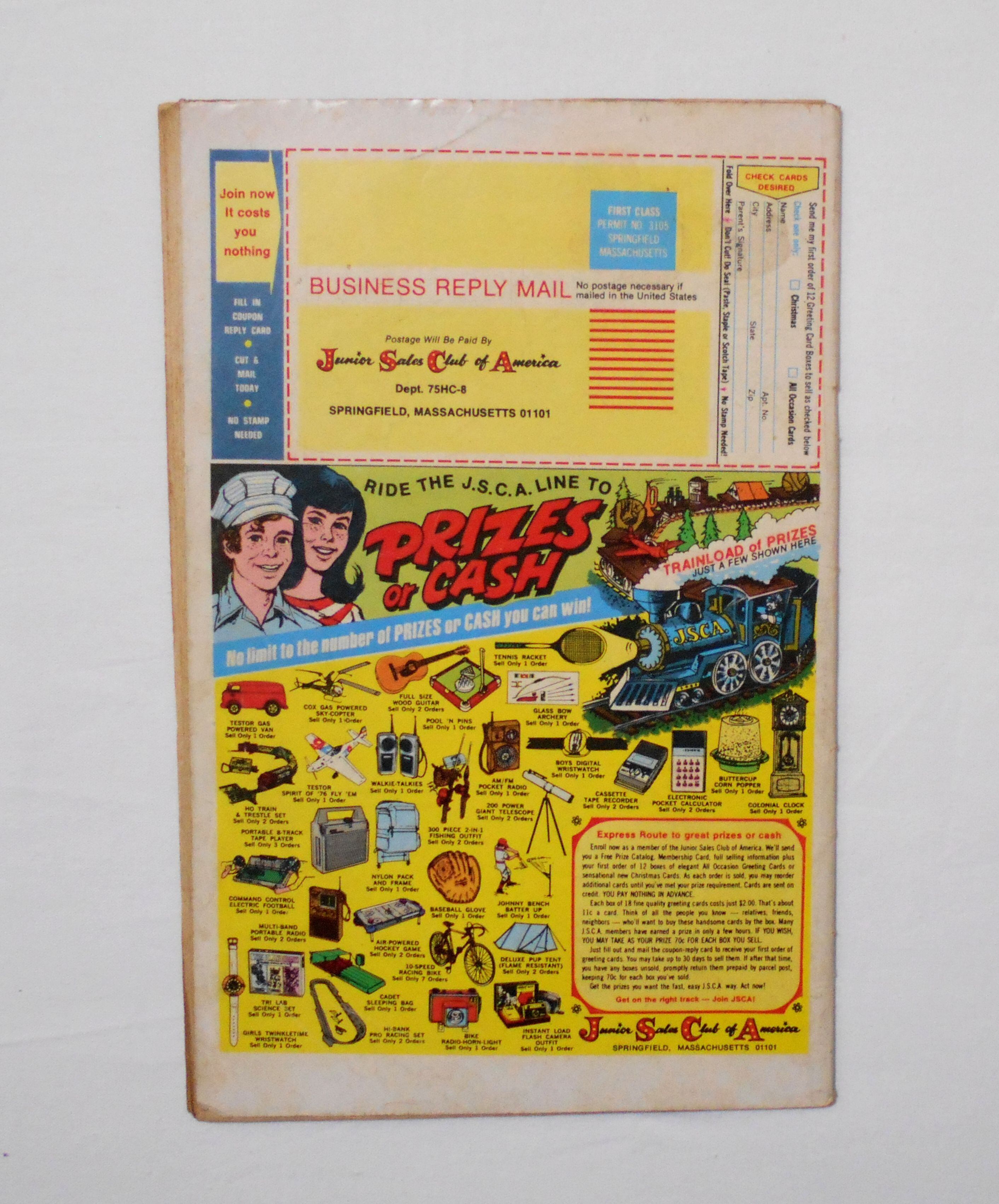 中央見開きページが本体から外れています。紛失ページはございません。表紙の上ホッチキス部分が少し破れかけており、今は何とか本体と付いておりますが、そのうちに外れてしまいそうです。他、多少の擦れやシワ、黄ばみ、紙ジミ、角や端の傷みや折れ、微破れ等があり、経年に伴う使用感はやや強めと言えます。1970年代の輸入中古コミックですので、その点を考慮頂ければと思います。中は黄ばんでいますが、目立った汚れやシミ等はなく、おおむねきれいですので、読むのに支障はございません。新品同様の美品をお求めの方や、古書にご理解を頂けない方にお薦めは出来ません。