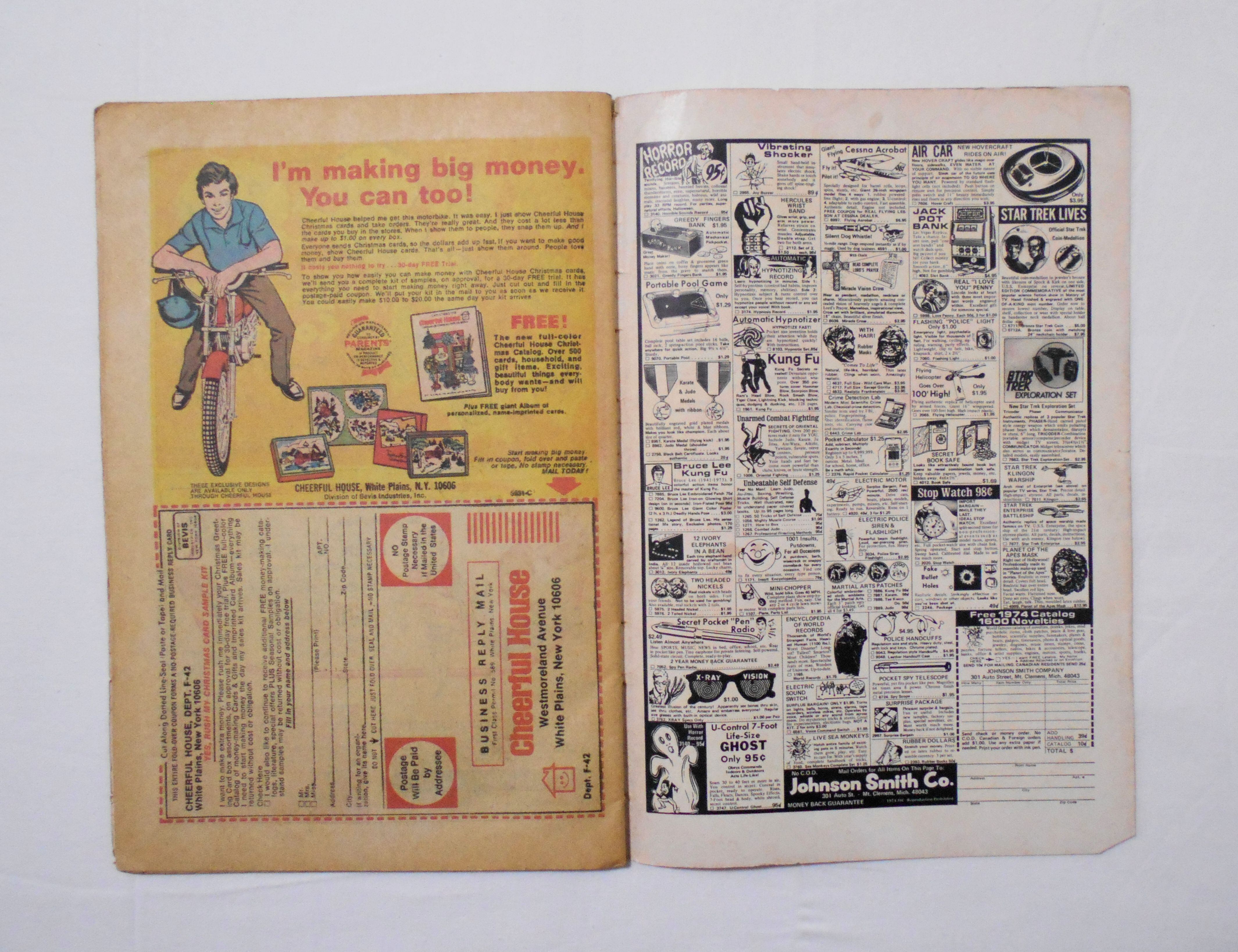 多少の擦れやシワ、黄ばみ、紙ジミ、角や端の傷みや折れ、破れ等があり、表紙の傷みが目立ち、経年に伴う使用感は強めと言えます。1970年代の輸入中古コミックですので、その点を考慮頂ければと思います。中は黄ばんでいますが、目立った汚れやシミ等はなく、おおむねきれいですので、読むのに支障はございません。新品同様の美品をお求めの方や、古書にご理解を頂けない方にお薦めは出来ません。