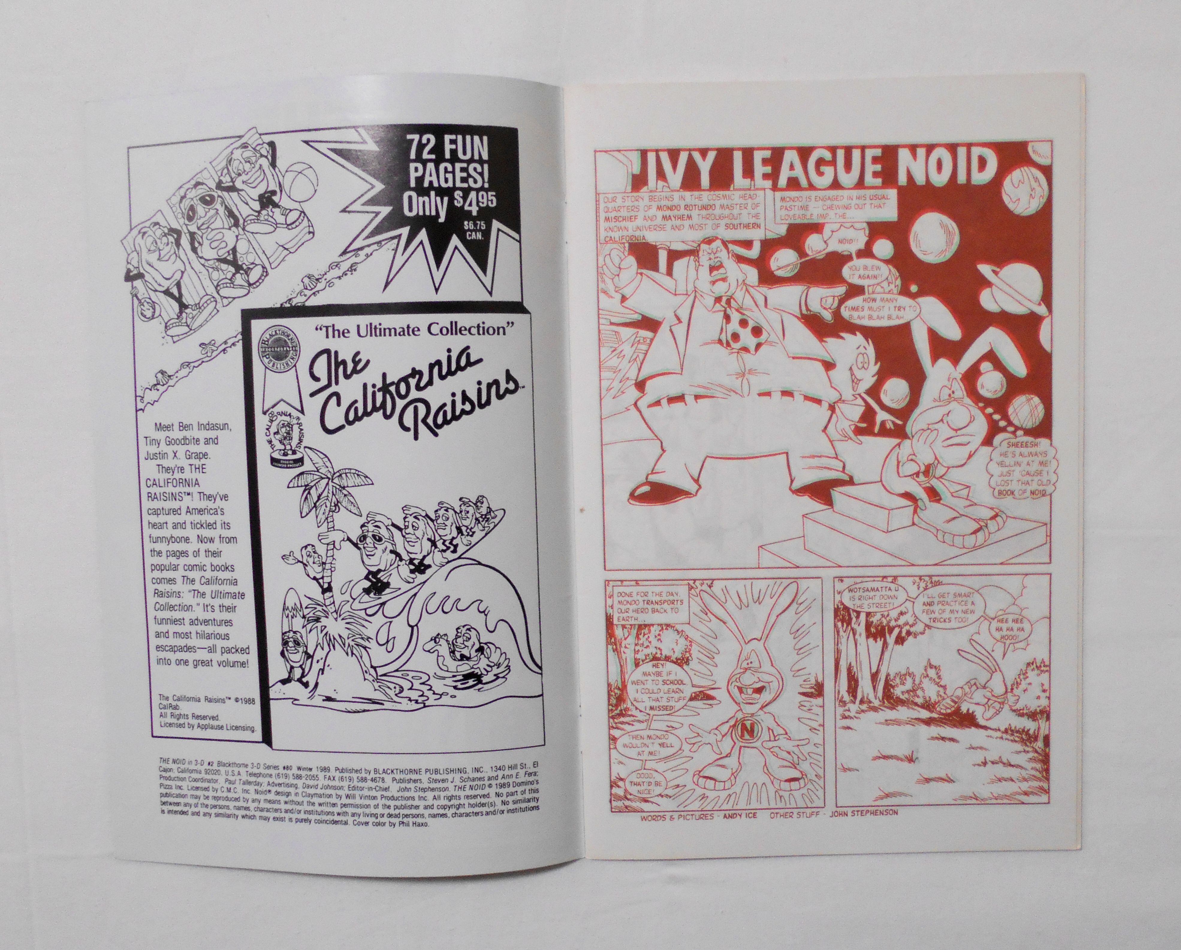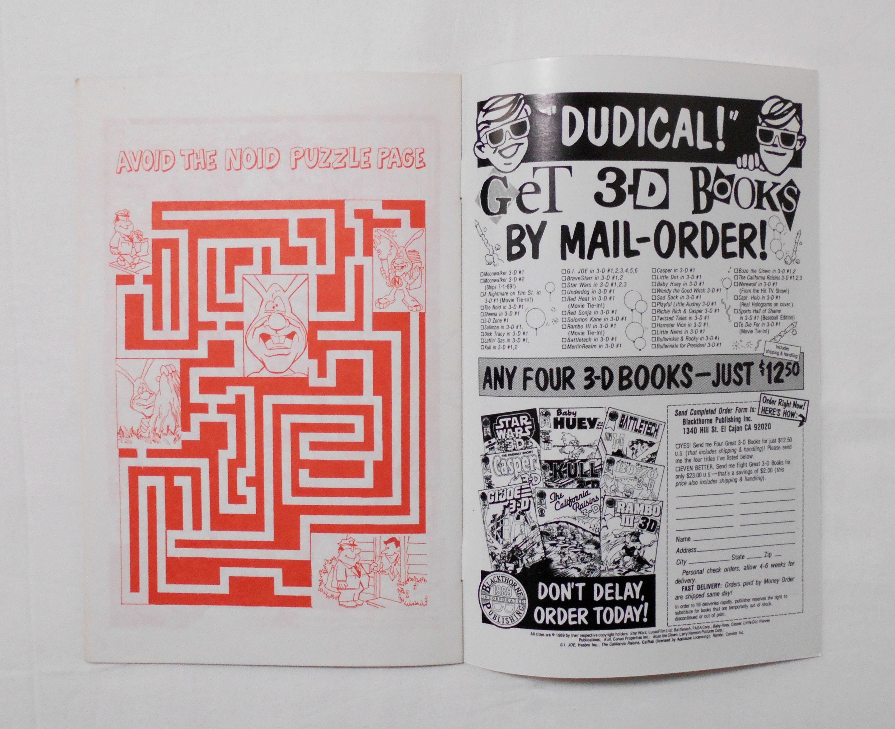 【THE NOID in 3-D #2 (BLACKTHORNE 3-D SERIES #80)】WINTER 1989◆中古アメリカン・コミック。英文表記による洋書となります。◆24ページ 赤×緑の2色刷り 大きさ約26×17センチ◆BLACKTHORNE PUBLISHING,INC.◆DOMINO'S PIZZA INC. LICENSED by C.M.C. INC. ◆左右それぞれ赤緑のメガネをかけて読むと、絵が飛び出して見える、旧き良き時代の3-Dコミックです。3-Dメガネは付属しておりませんので予めご了承下さい。