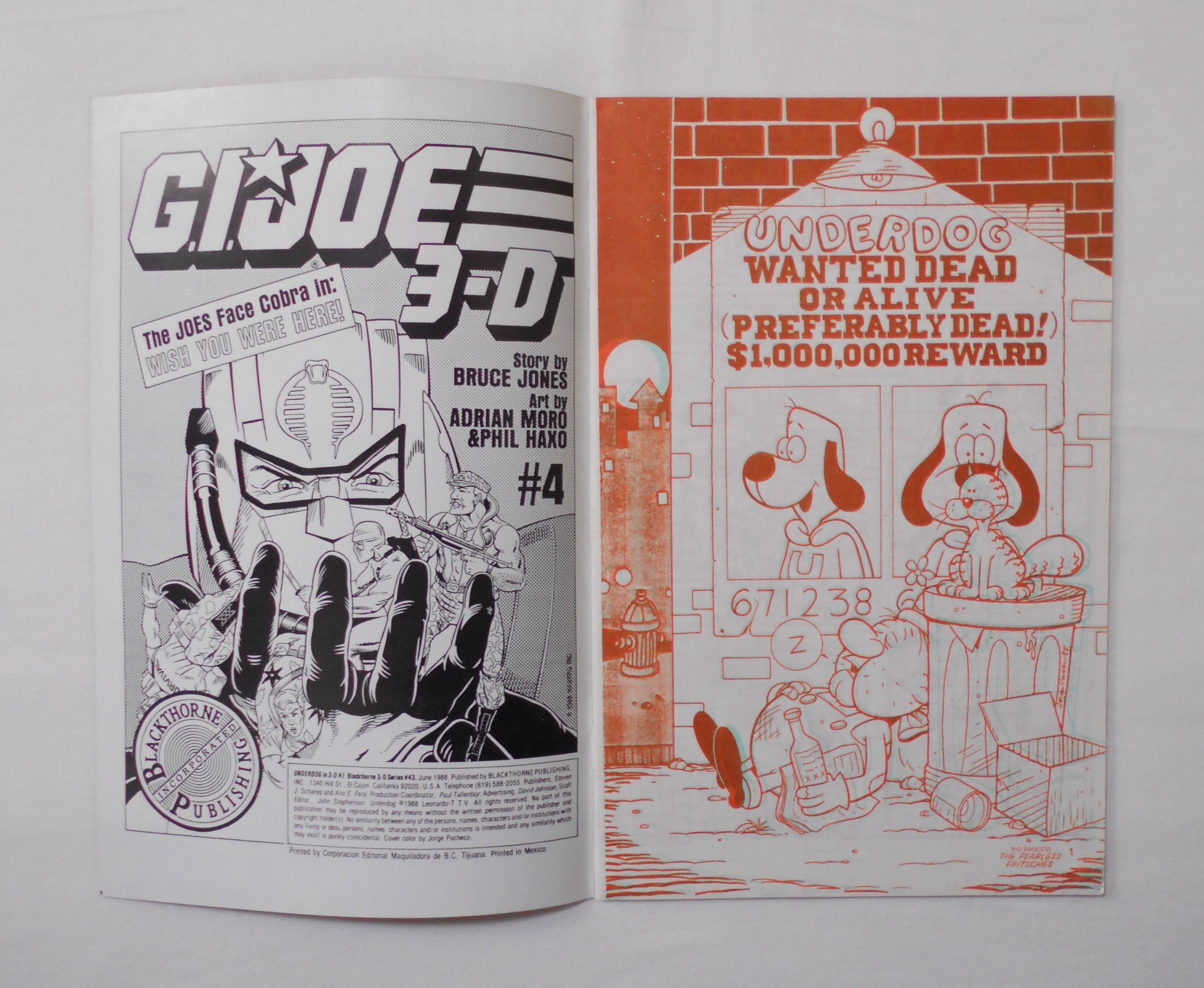 【UNDERDOG in 3-D #1 [BLACKTHORNE 3-D SERIES #43]】JUNE 1988◆中古アメリカン・コミック。英文表記による洋書となります。◆32ページ 赤×緑の2色刷り 大きさ約26×17センチ◆BLACKTHORNE PUBLISHING,INC.◆LEONARDO-T T.V.◆左右それぞれ赤緑のメガネをかけて読むと、絵が飛び出して見える、旧き良き時代の3-Dコミックです。3-Dメガネは付属しておりませんので予めご了承下さい。