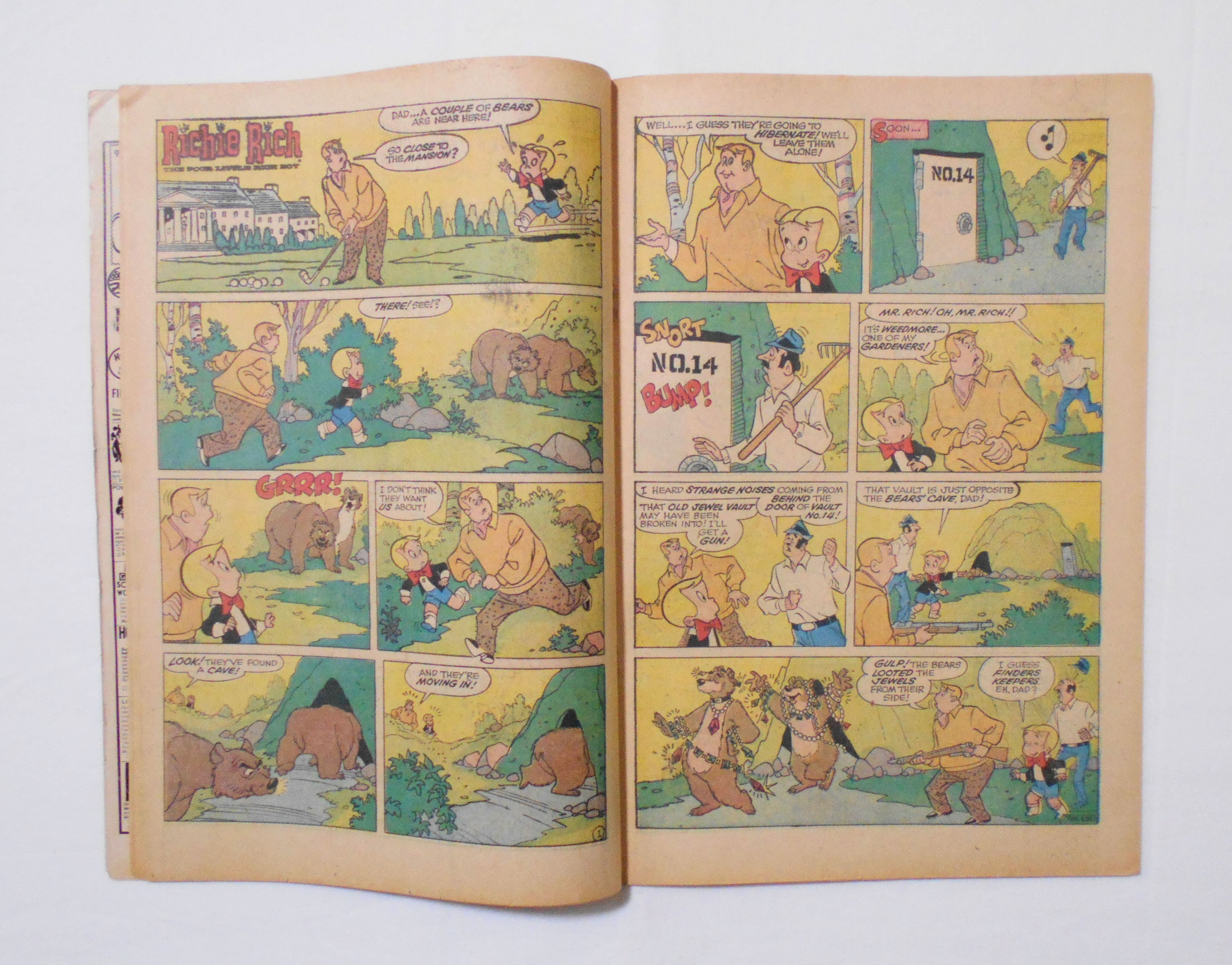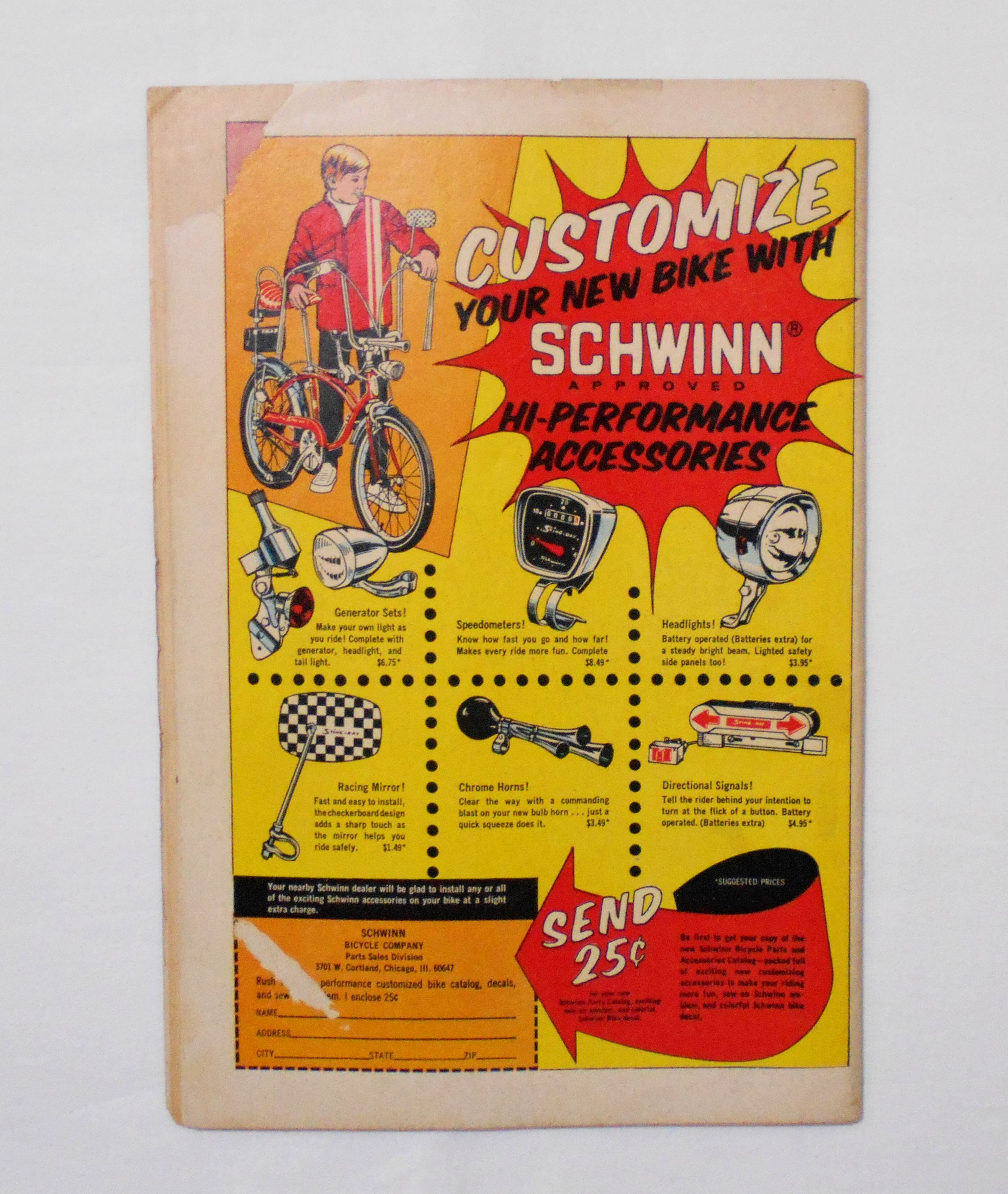 中央見開きページが紛失しています。裏表紙の左上角先が破れ、左下角あたりの表面が剥がれています。表紙上端に名前の書き込みあり(裏側にも少し染みています)。他。多少の擦れやシワ、黄ばみ、端の傷みや折れ、微破れ等があり、経年に伴う使用感はやや強めと言えます。1970年代の輸入中古コミックですので、その点を考慮頂ければと思います。中は端余白部分に僅かに点々とシミ汚れもあるページもございますが、殆どのページは目立った汚れやシミ等はなく、おおむねきれいですので、読むのに支障はございません。新品同様の美品をお求めの方や、古書にご理解を頂けない方にお薦めは出来ません。
