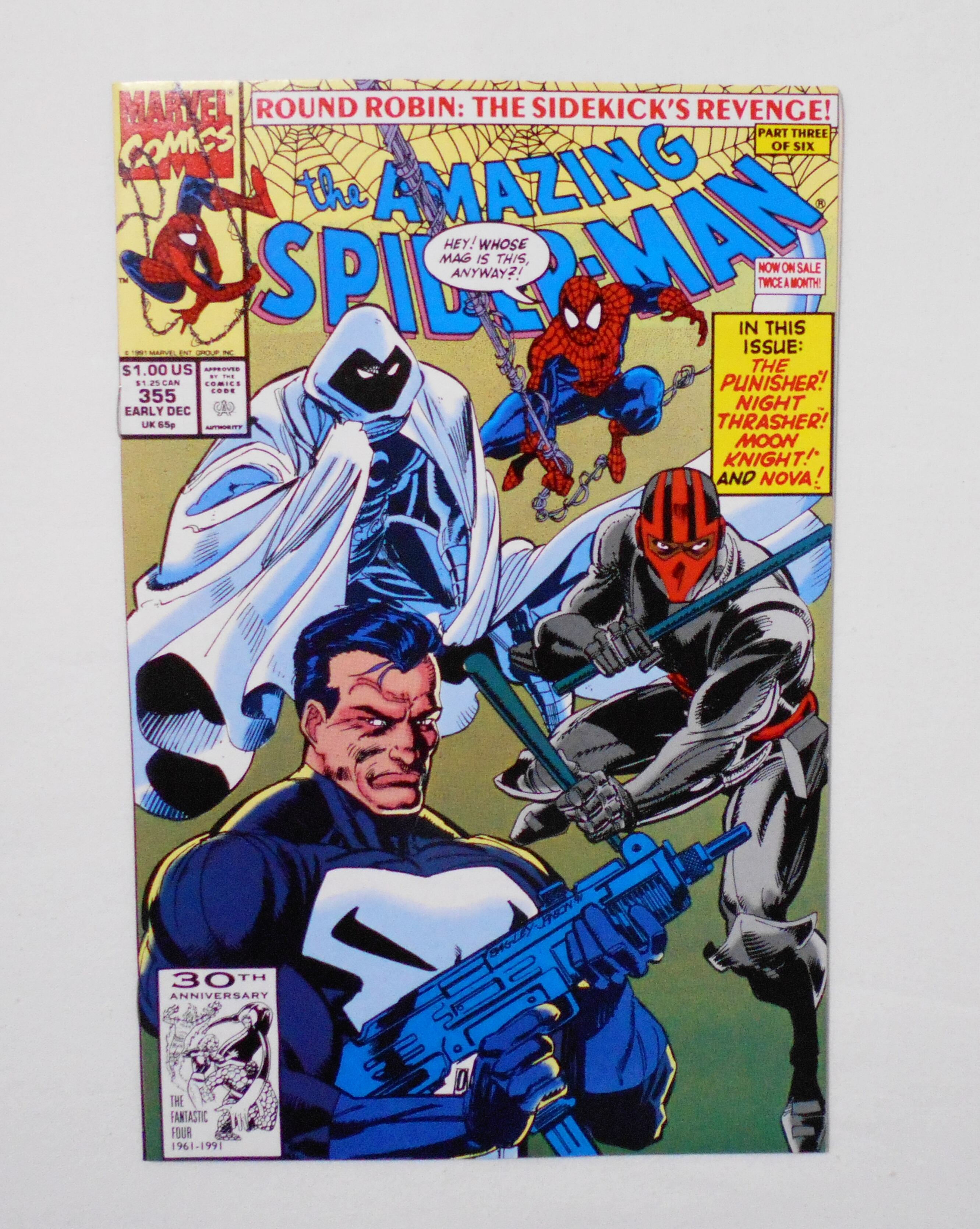 【THE AMAZING SPIDER-MAN】 VOL.1 NO.355 EARLY DEC. 1991◆ROUND ROBIN: THE SIDEKICK'S REVENGE PART.3 of 6 IN THIS ISSUE: THE PUNISHER, NIGHT THRASHER, MOON KNIGHT & NOVA◆中古アメリカン・コミック。英文表記の洋書となります。◆32ページ+見開き広告ページ フルカラー 大きさ約26×17センチ◆MARVEL COMICS