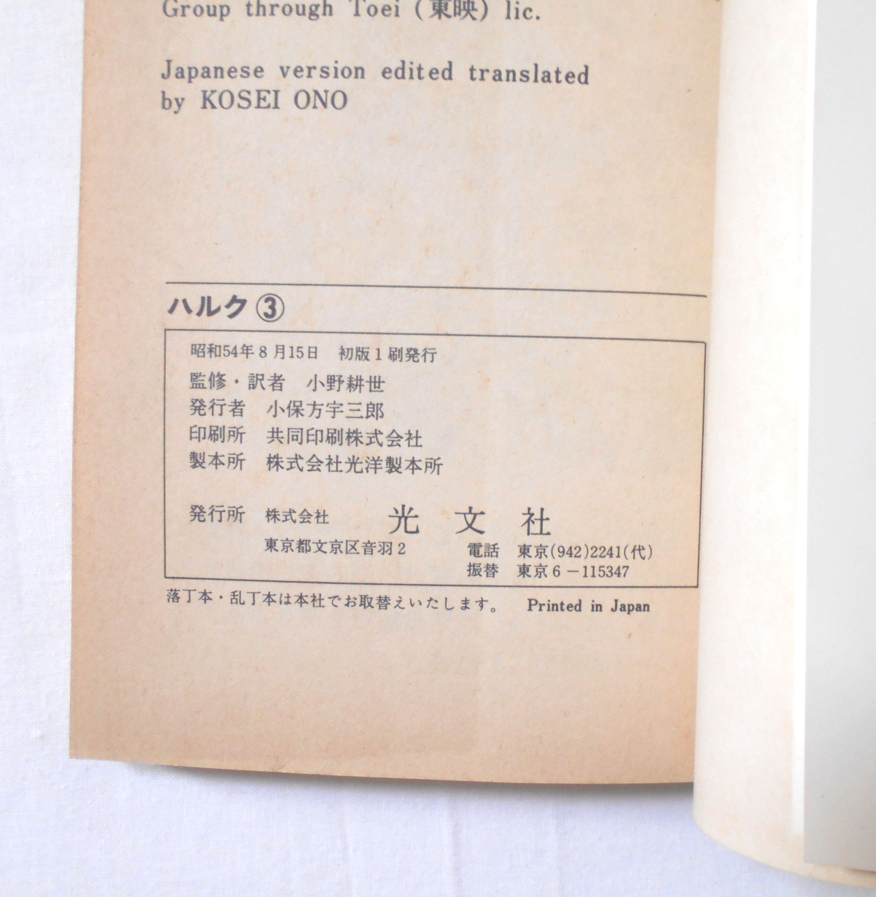 【ハルク THE INCREDIBLE HULK】 #3◆日本版アメリカン・コミック◆ページ数表記205ページ+広告 カラー(16ページ)/白黒 大きさ約17×11.5×1.5センチ◆COPYRIGHT 1979 by MARVEL COMICS GROUP◆光文社◆監修、訳者 小野耕世◆昭和54年8月15日初版1刷発行