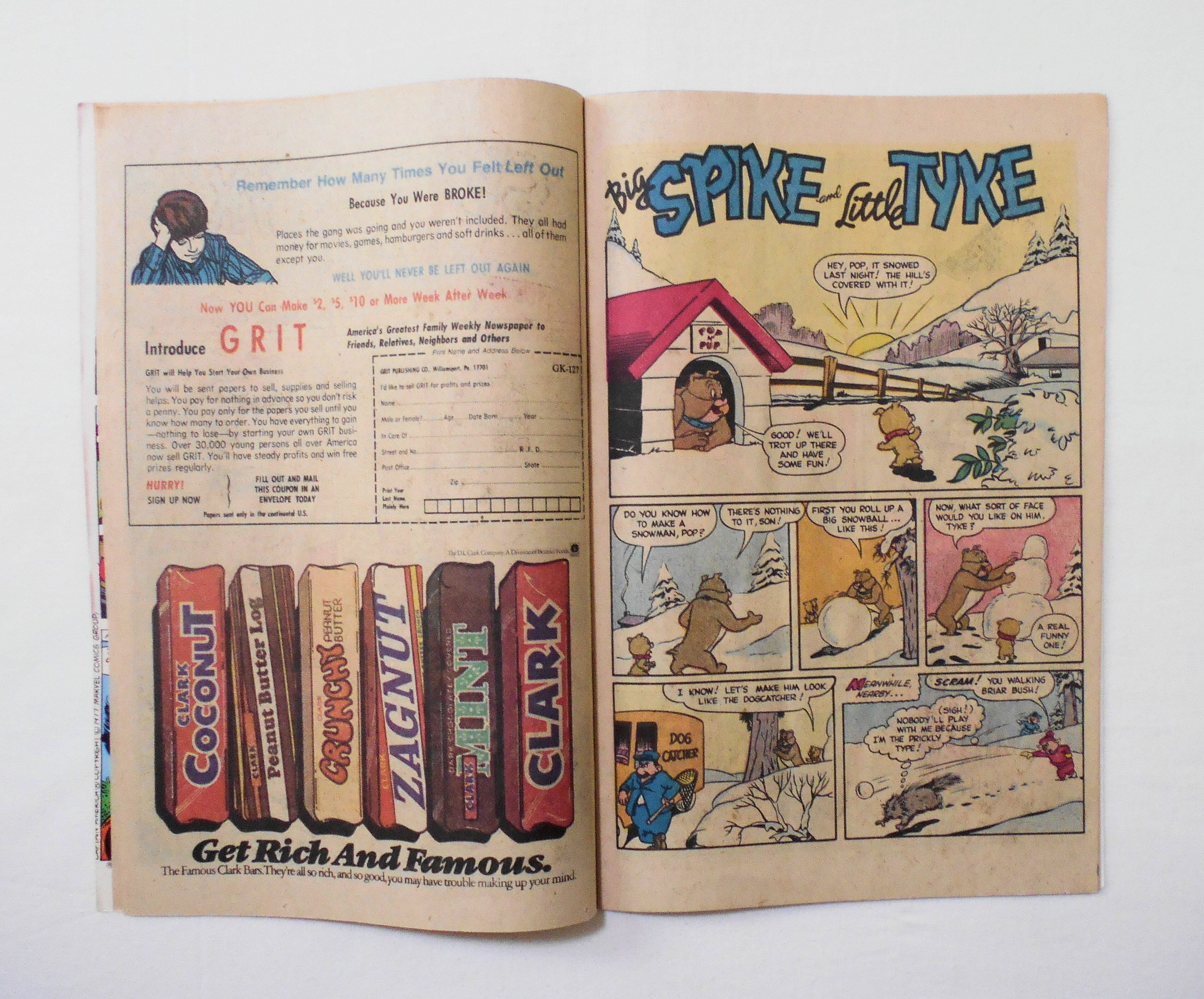 背から内側へ約5センチ縦方向に折れ跡が付いています。他、多少の擦れやシワ、黄ばみ、角や端の傷みや折れ等があり、経年に伴う使用感は否めませんが、目立った汚れやシミ等は無く、1970年代の輸入中古コミックですので、その点を考慮頂ければ、普通程度~おおむねきれいな状態だと思います。新品同様の美品をお求めの方や、古書にご理解を頂けない方にお薦めは出来ません。