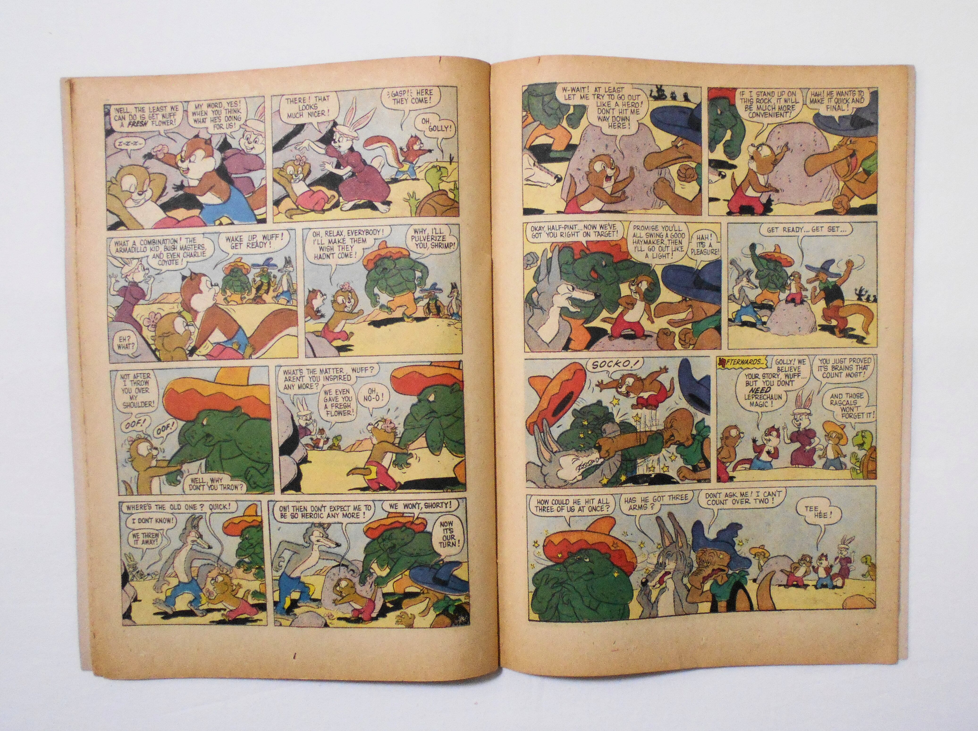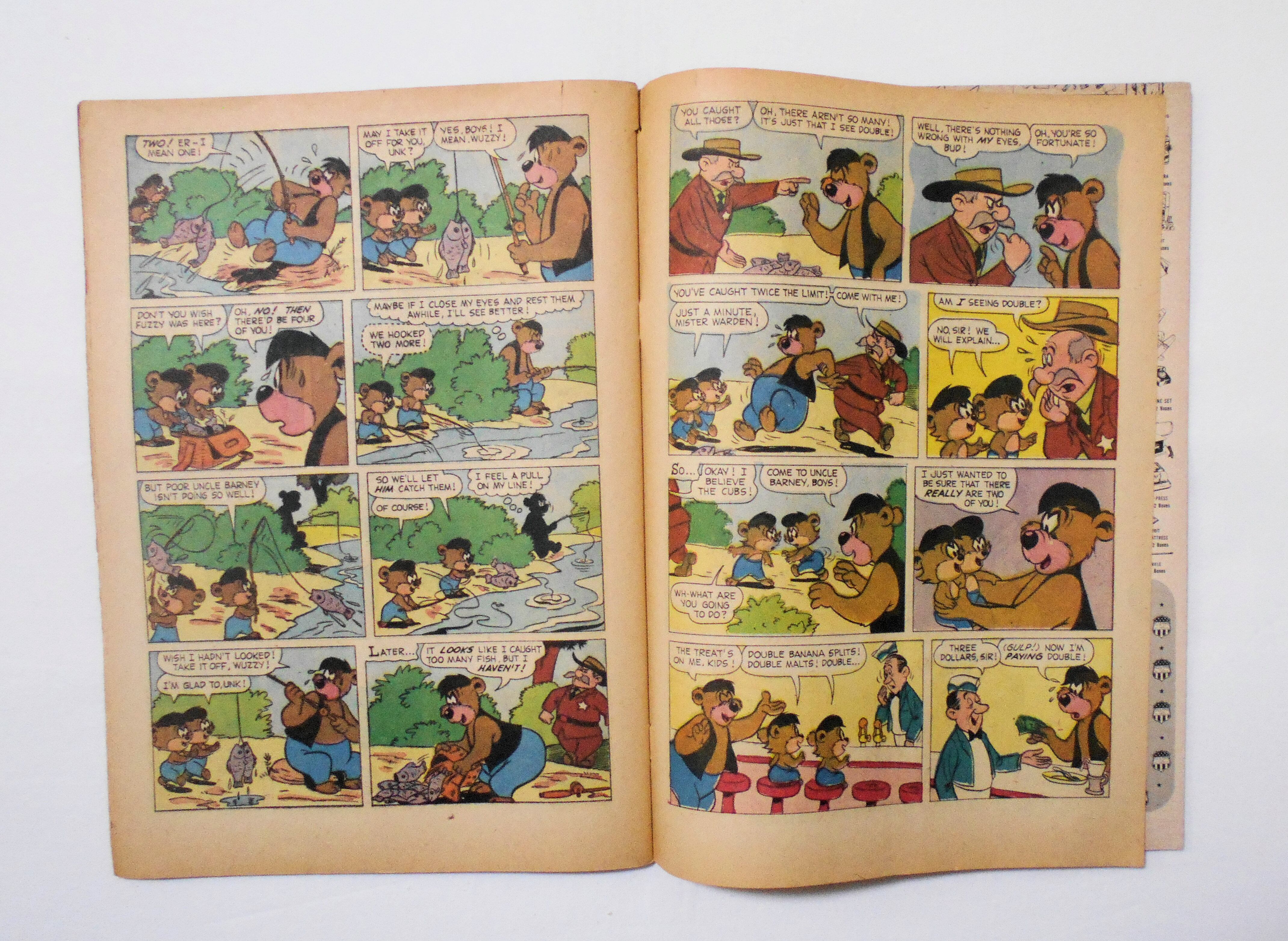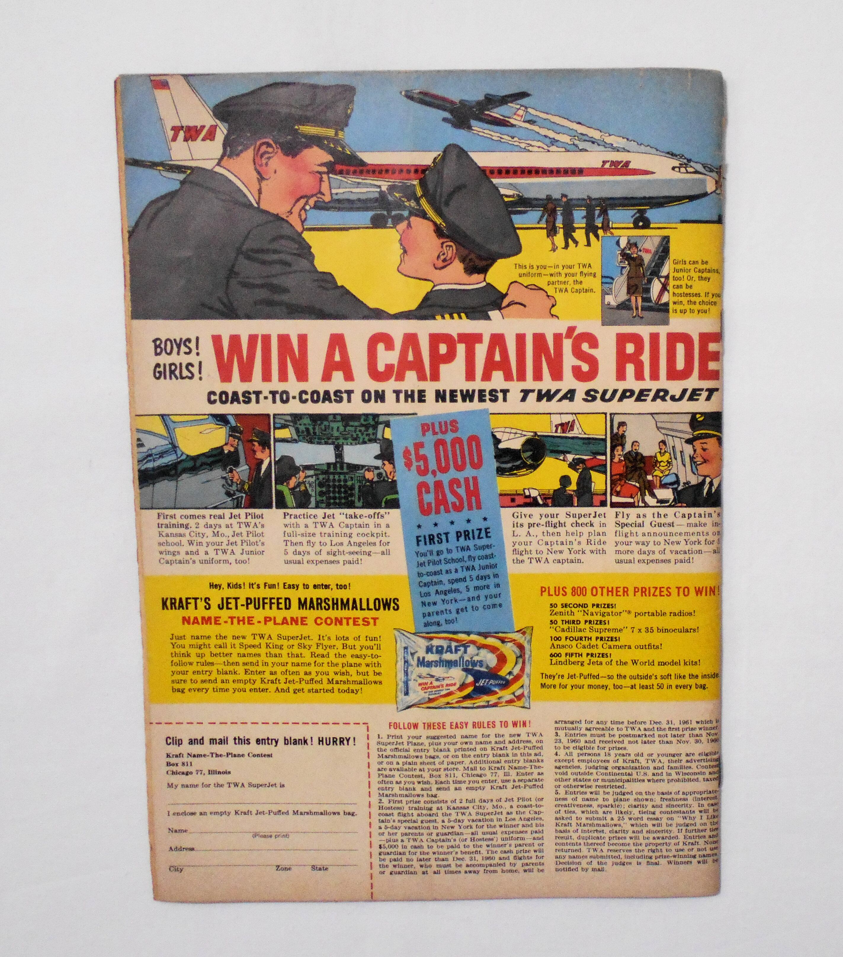 表紙~背の上角が破れています。本の中心縦方向に折れめが付いています。他、多少の擦れやシワ、黄ばみ、紙ジミ、角や端の傷みや折れ等があり、経年に伴う使用感はやや強めと言えますが、1960年代の輸入中古コミックですので、その点を考慮頂ければ、普通程度~おおむね良好と言える保存状態だと思います。中は多少黄ばんでいますが、目立った汚れやシミ等はなく、おおむねきれいですので、読むのに支障はございません。新品同様の美品をお求めの方や、古書にご理解を頂けない方にお薦めは出来ません。