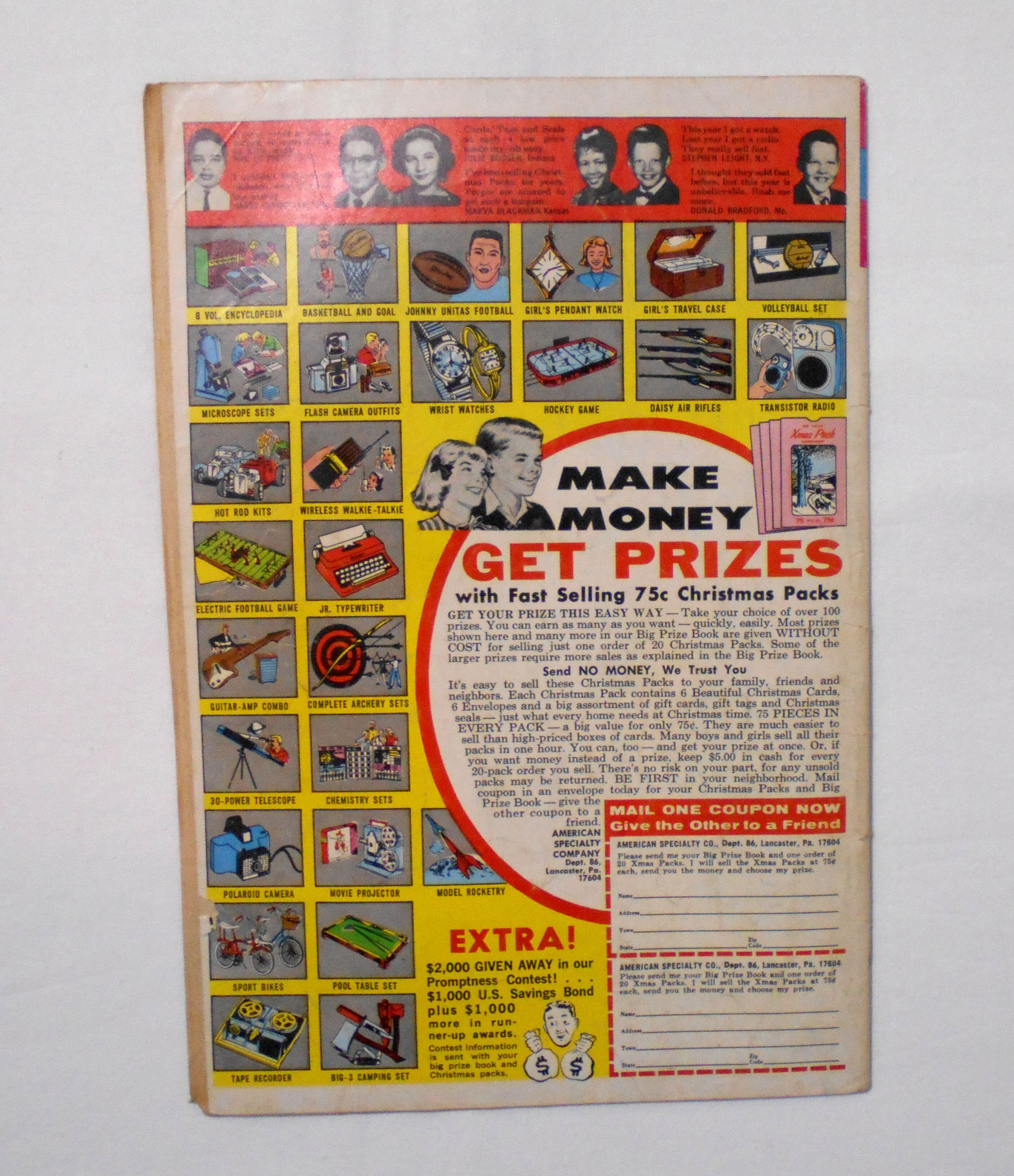中央見開きページが紛失しています。上下ホッチキス周辺が濡れた為か、錆が染みてその周りが黒く染まっています。ただ、表紙の背に濡れたような跡は他には見当たりませんでした。他、多少の擦れやシワ、黄ばみ、紙ジミ、角や端の傷みや折れ、破れ等があり、表紙の傷みが目立ち、経年に伴う使用感は強めと言え、保存状態は良くありません。1960年代の輸入中古コミックですので、その点を考慮頂ければと思います。中は目立った汚れやシミ等はなく、おおむねきれいな状態ですので、読むのに支障はございません。新品同様の美品をお求めの方や、古書にご理解を頂けない方、また古い本特有の匂いもしますので気になる方にはお薦め致しかねます。何卒ご了承くださいませ。