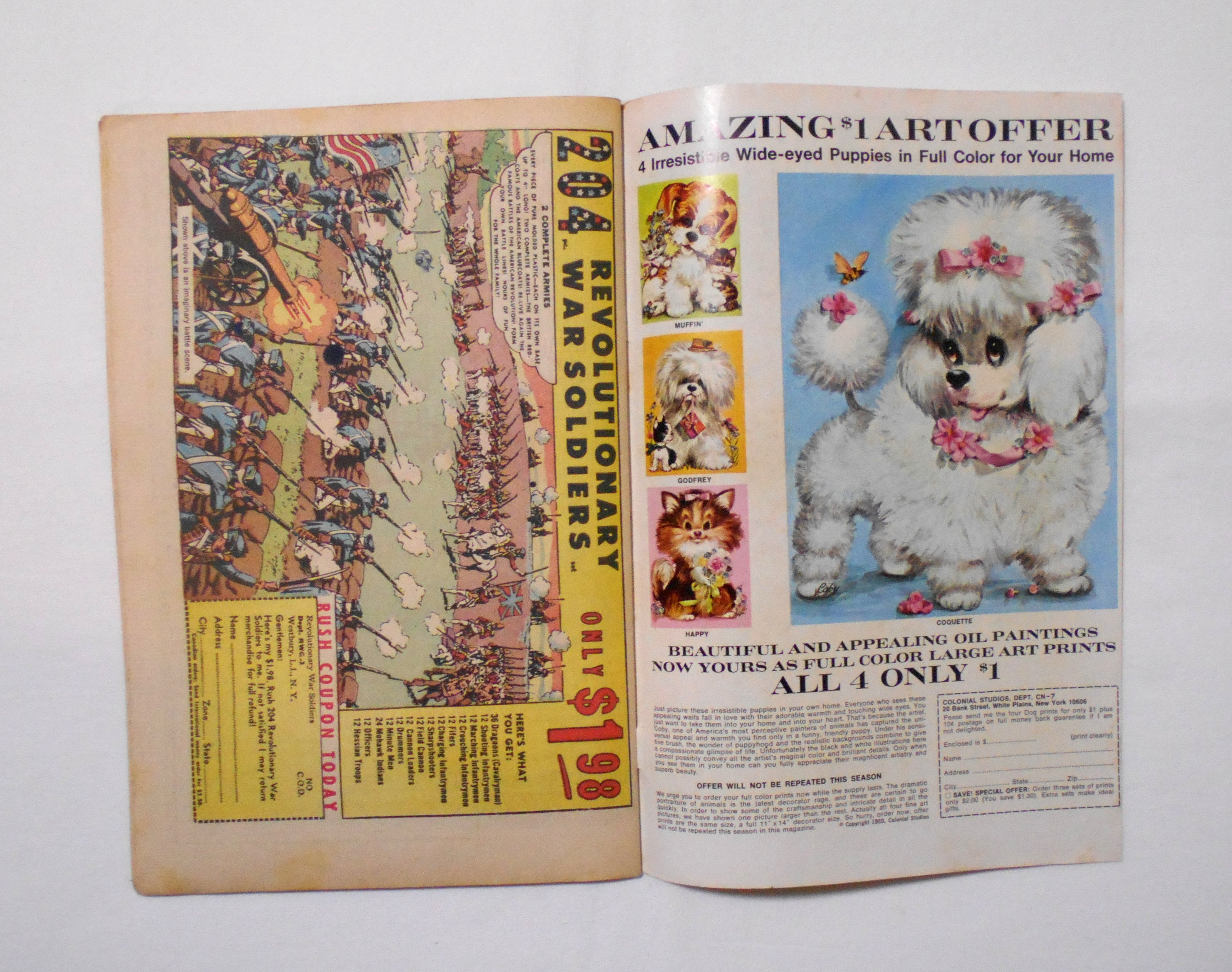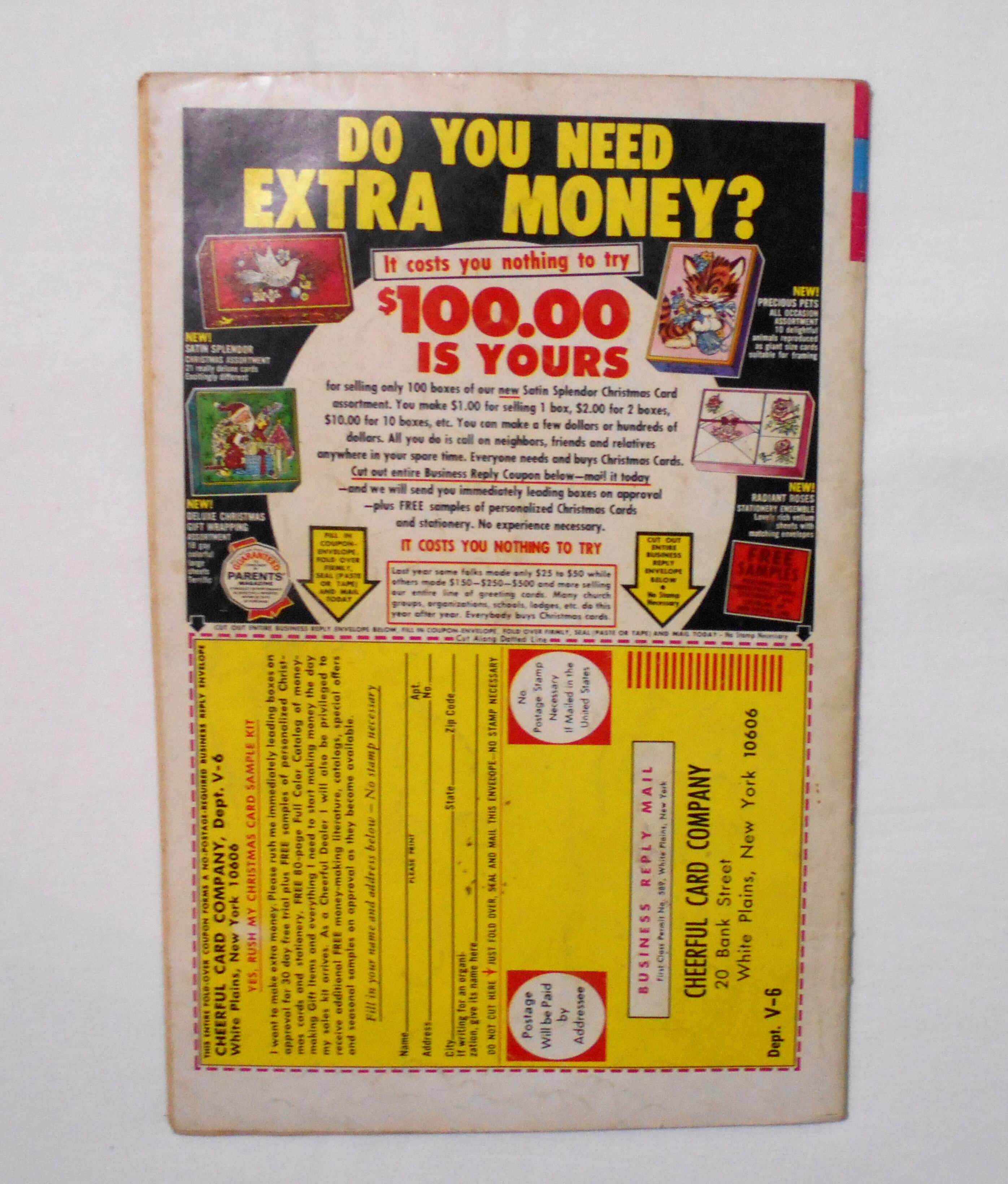 表紙の右上角にシミ汚れあり(おそらく画像では確認できません)。他、多少の擦れやシワ、黄ばみ、角や端の傷みや折れ、微破れ等があり、経年に伴う使用感は否めませんが、1960年代の輸入中古コミックですので、その点を考慮頂ければと思います。中は目立った汚れやシミ等はなく、おおむねきれいな状態ですので、読むのに支障はございません。新品同様の美品をお求めの方や、古書にご理解を頂けない方、また古い本特有の匂いもしますので気になる方にはお薦め致しかねます。何卒ご了承くださいませ。