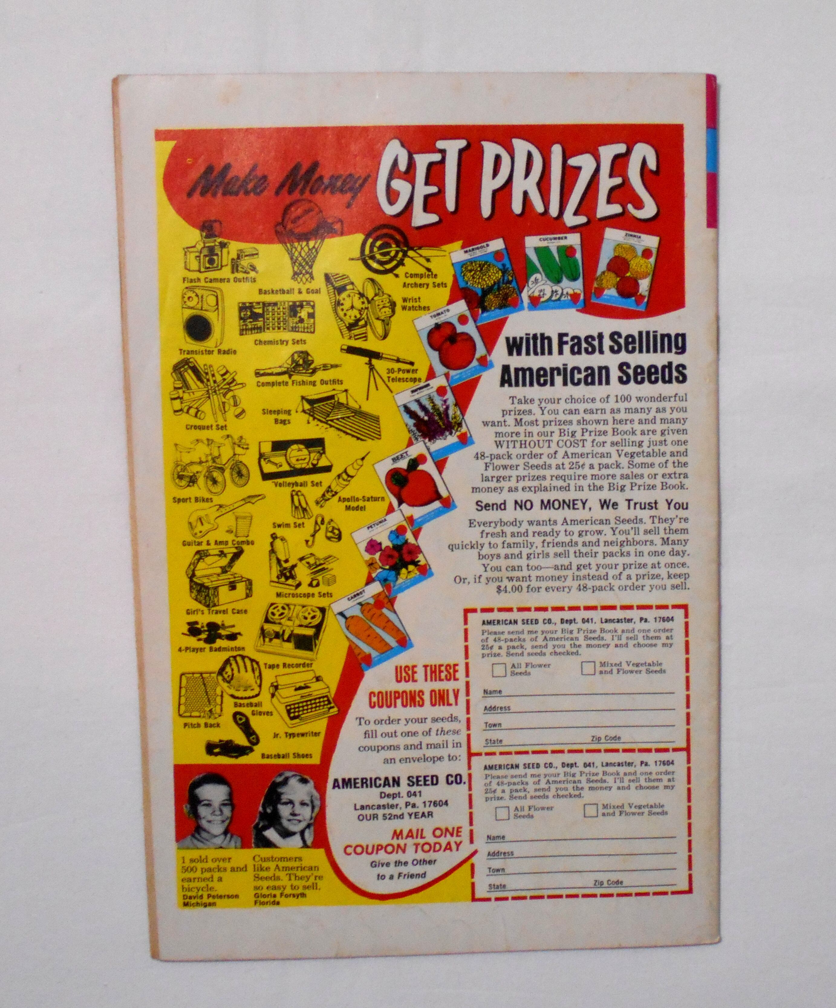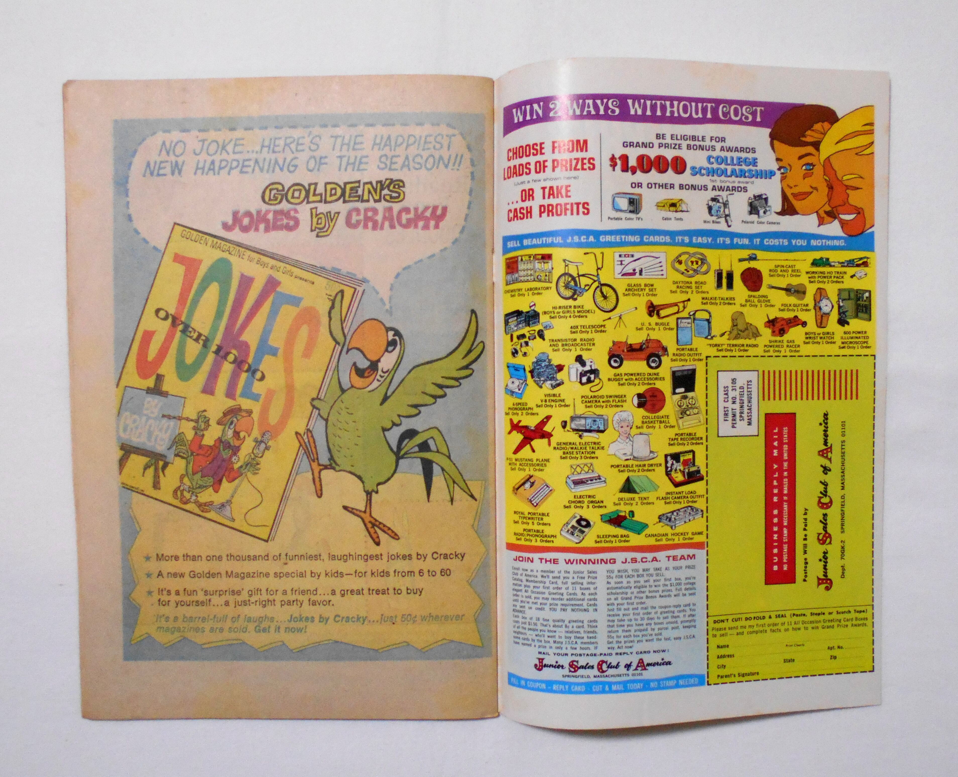 背から内側へ約0.5センチ縦方向に軽く折れ目が付いています。他、多少の擦れやシワ、黄ばみ、角や端の傷みや折れ、微破れ等があり、経年に伴う使用感は否めませんが、目立った汚れやシミ等はなく、1970年代の輸入中古コミックですので、その点を考慮頂ければ、普通程度~おおむねきれいな状態だと思います。新品同様の美品をお求めの方や、古書にご理解を頂けない方、また古い本特有の匂いもしますので気になる方にはお薦め致しかねます。何卒ご了承くださいませ。