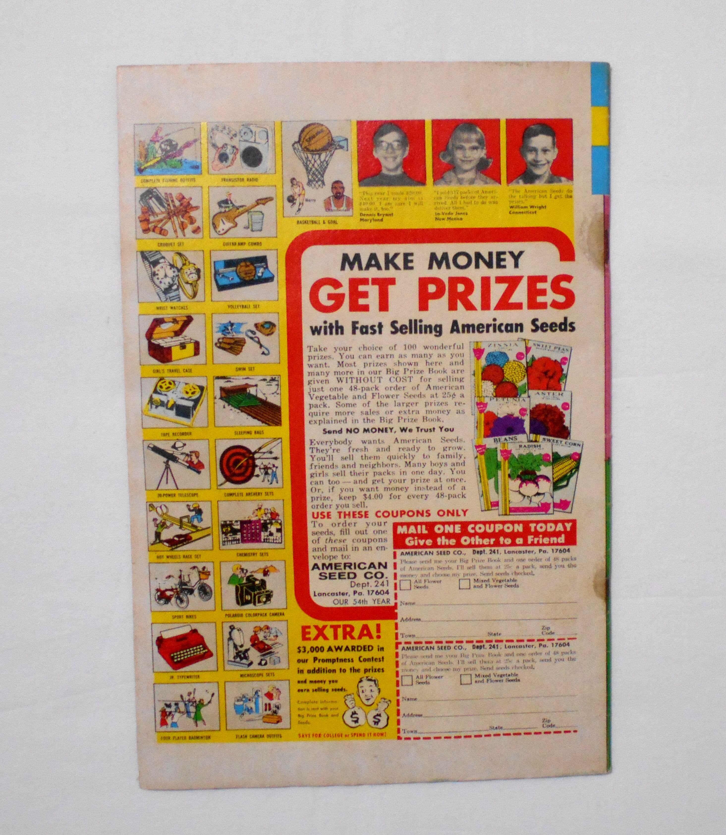 背が一度濡れたようで、上下ホッチキス部分が、ホチキスの錆が染み出し、黒く染まっています。また本の上下がやや波打つようなシワになっており、他よりも多少黄ばみが強めです。他、多少の擦れやシワ、黄ばみ、紙ジミ、角や端の傷みや微折れ等があり、経年に伴う使用感は否めませんが、目立った汚れやシミ等はなく、1970年代の輸入中古コミックですので、その点を考慮頂ければ普通程度~おおむねきれいな状態だと思います。新品同様の美品をお求めの方や、古書にご理解を頂けない方、また古い本特有の匂いもしますので気になる方にはお薦め致しかねます。何卒ご了承くださいませ。