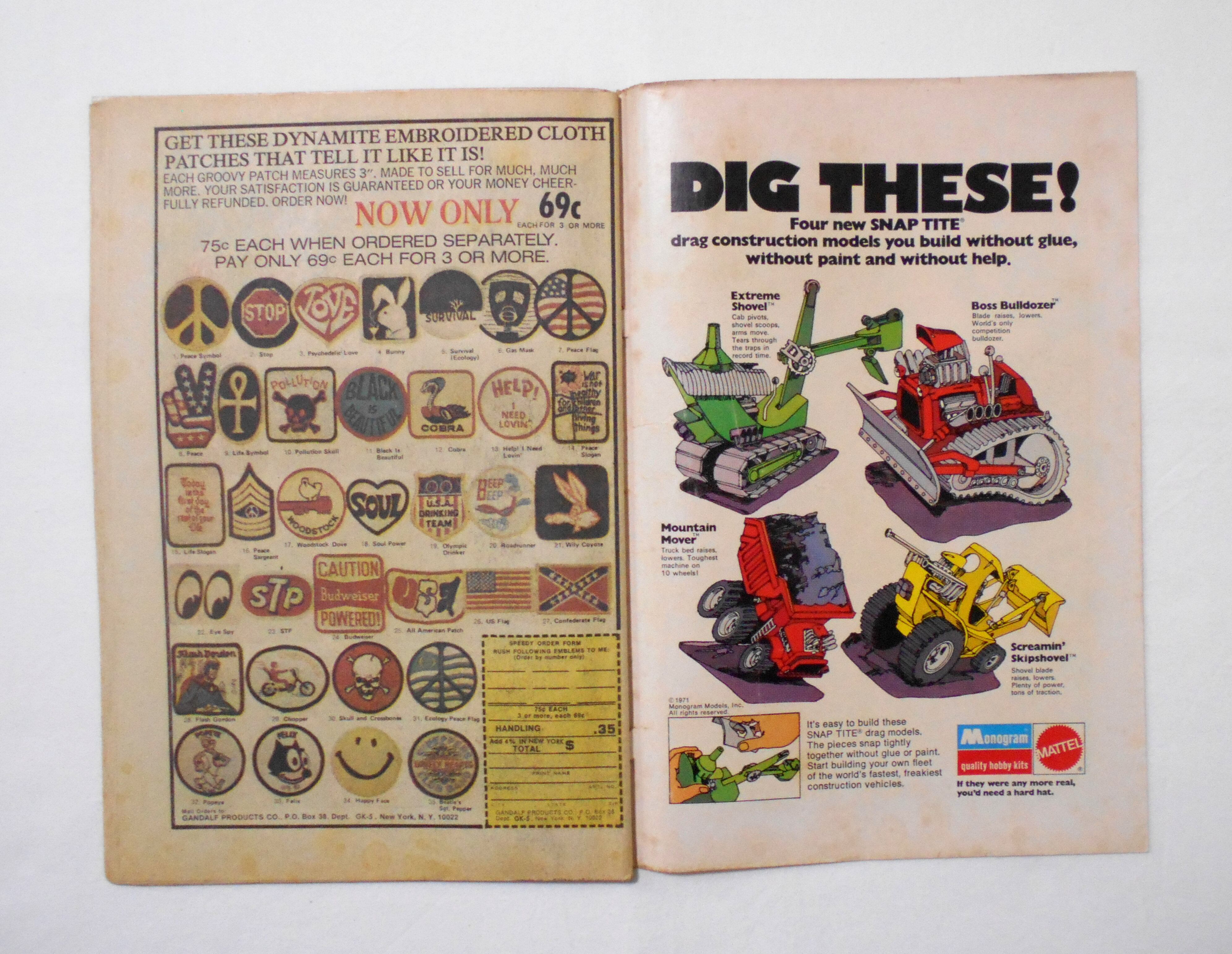 中のページの周辺(特に下端)の余白部分に薄いシミ汚れが見られます。表紙の上下ホッチキス部分が少し破れており、今は表紙と本体は付いてますが、そのうちに外れてしまうかもしれません。他、多少の擦れやシワ、黄ばみ、紙ジミ、角や端の傷みや折れ、微破れ等があり、表紙の傷みが目立ち、経年に伴う使用感はやや強めと言えますが、1970年代の輸入中古コミックですので、その点を考慮頂ければと思います。中は目立った汚れやシミ等はなく、読むのに支障はございません。新品同様の美品をお求めの方や、古書にご理解を頂けない方、また古い本特有の匂いもしますので気になる方にはお薦め致しかねます。何卒ご了承くださいませ。