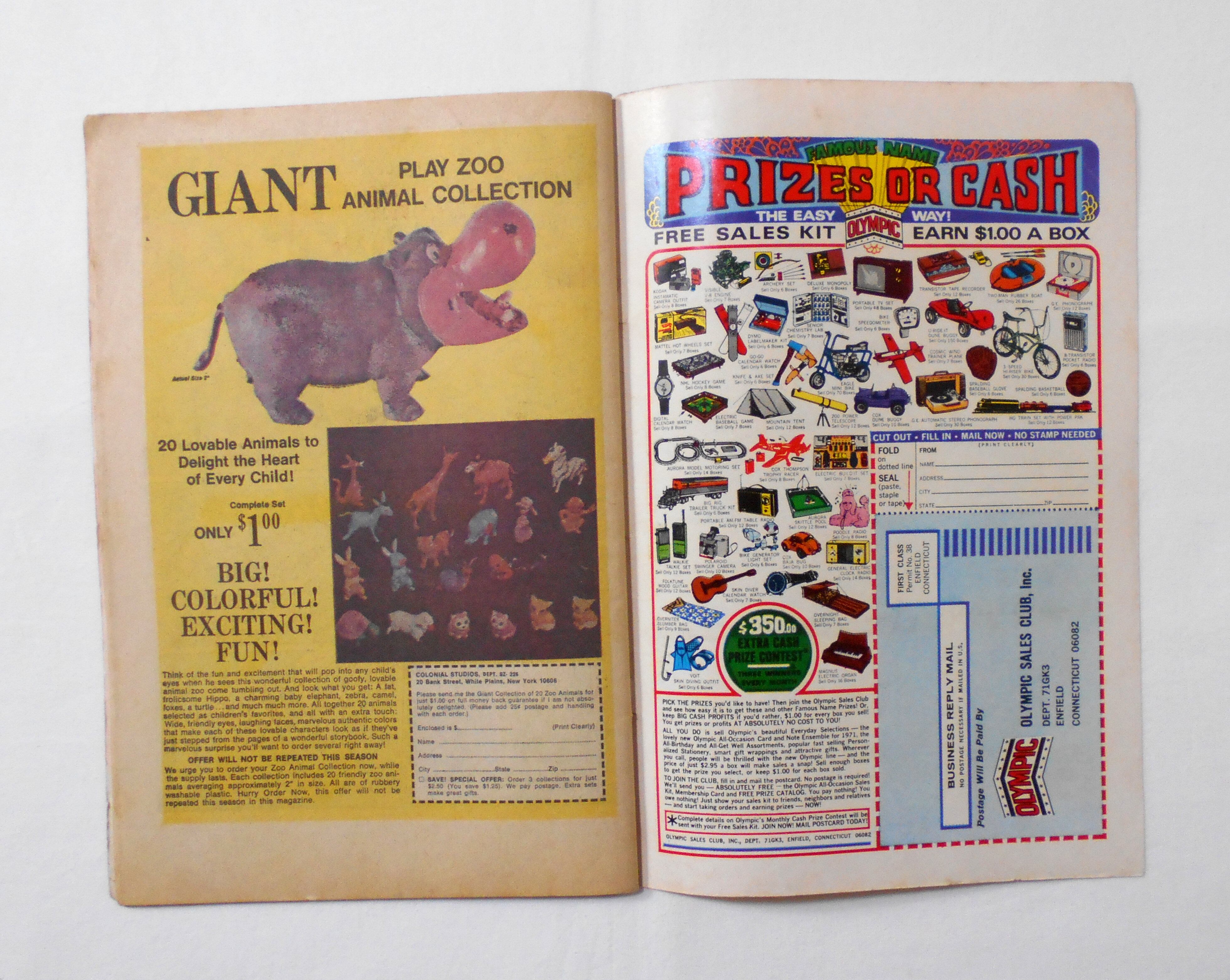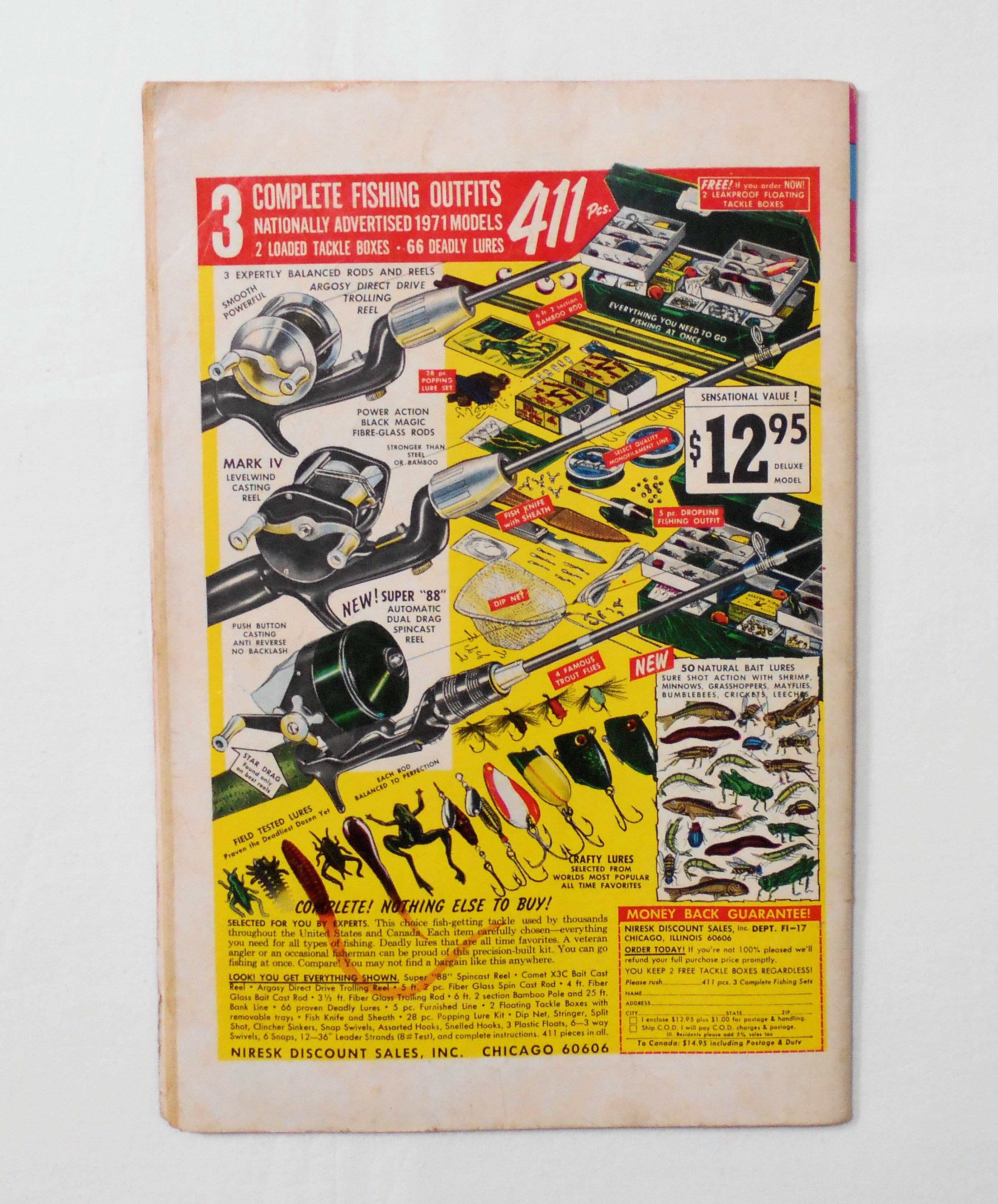背から内側へ約0.5センチ縦方向に折れ目が付いています。他、多少の擦れやシワ、黄ばみ、紙ジミ、角や端の傷みや折れ、微破れ等があり、経年に伴う使用感は強めで、保存状態はあまり良くありません。1970年代の輸入中古コミックですので、その点を考慮頂ければと思います。中は多少黄ばんでいますが、目立った汚れやシミ等はなく、読むのに支障はございません。新品同様の美品をお求めの方や、古書にご理解を頂けない方、また古い本特有の匂いもしますので気になる方にはお薦め致しかねます。何卒ご了承くださいませ。