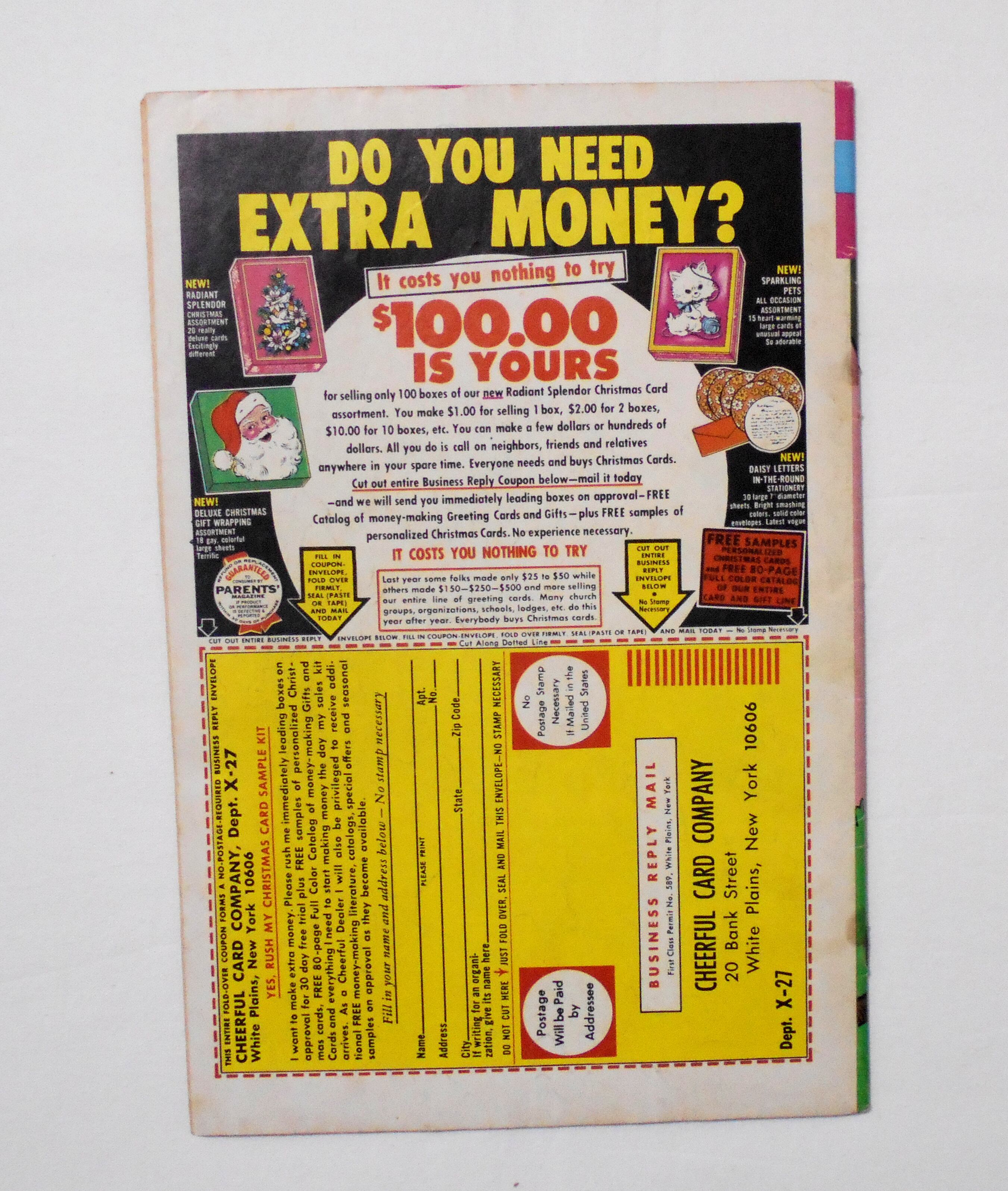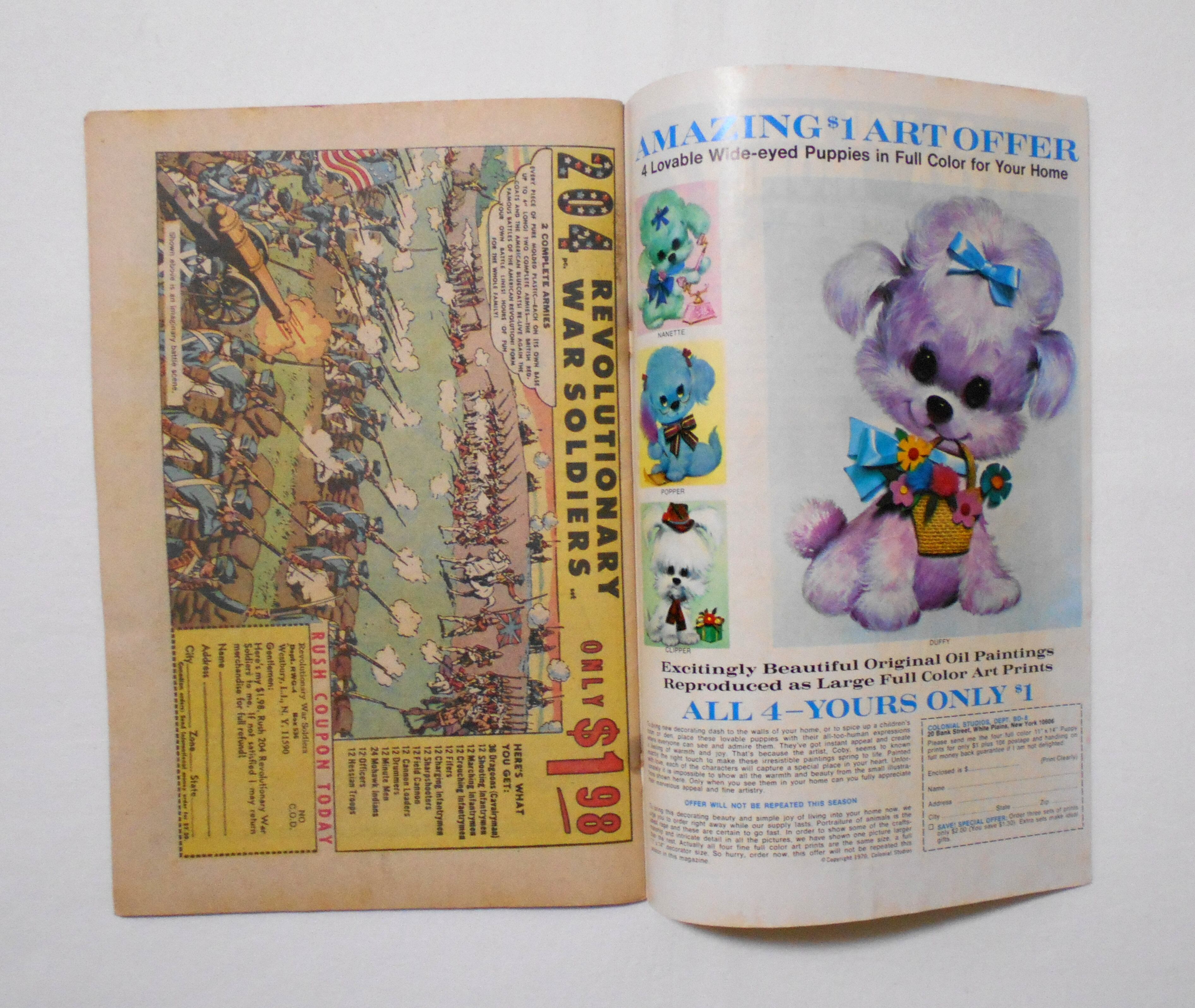 天に赤いペイント汚れあり。背が湿気た(濡れた???)為か、ホッチキスの錆が周りに染み出し、黒く染まっています。ただ濡れたと思われるような跡はございません。他、多少の擦れやシワ、黄ばみ、紙ジミ、角や端の傷みや折れ等があり、経年に伴う使用感は否めませんが、1970年代の輸入中古コミックですので、その点を考慮頂ければと思います。中は黄ばんでいますが、目立った汚れやシミ等は無く、おおむねきれいですので、読むのに支障はございません。新品同様の美品をお求めの方や、古書にご理解を頂けない方、また古い本特有の匂いもしますので気になる方にはお薦め致しかねます。何卒ご了承くださいませ。