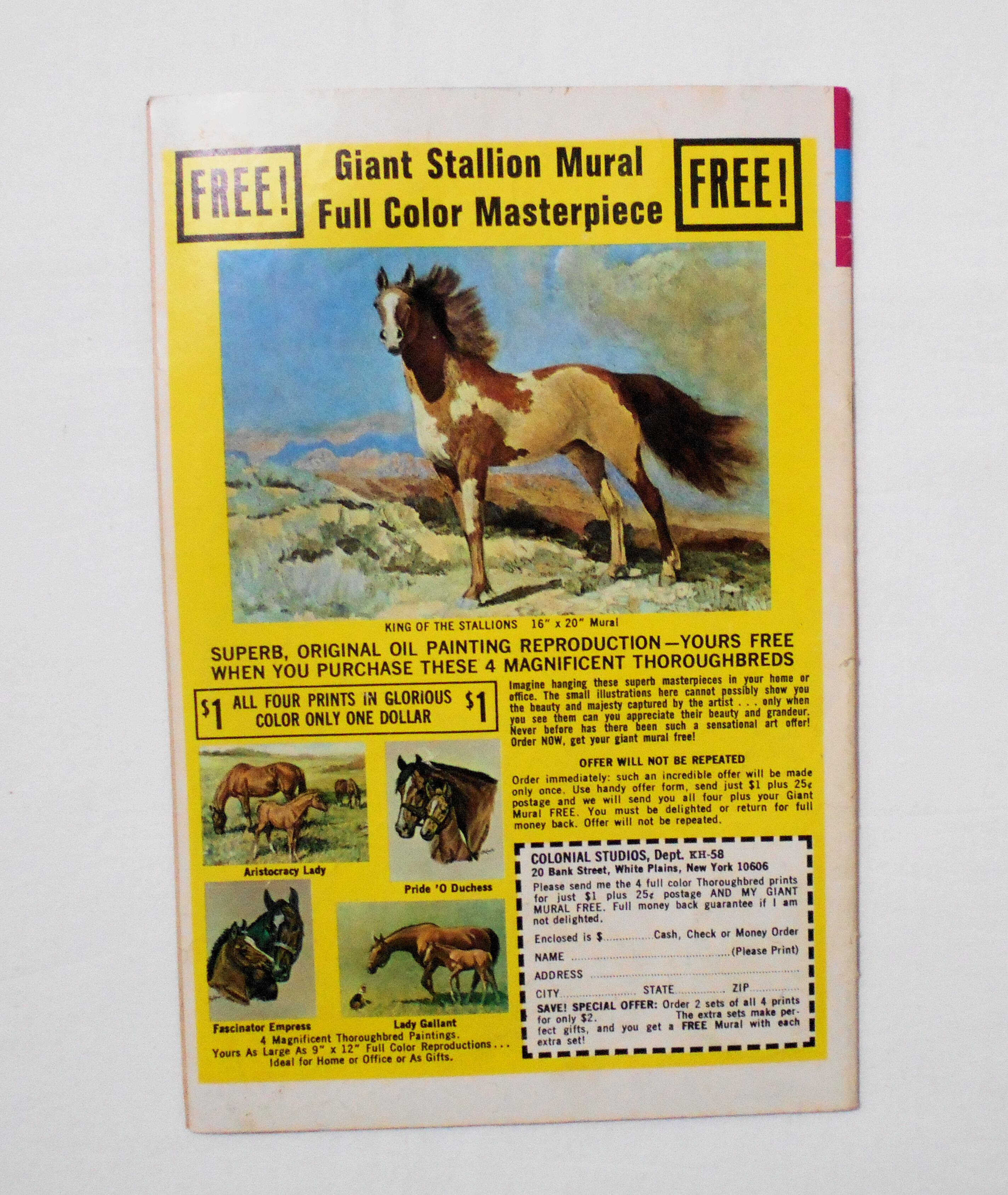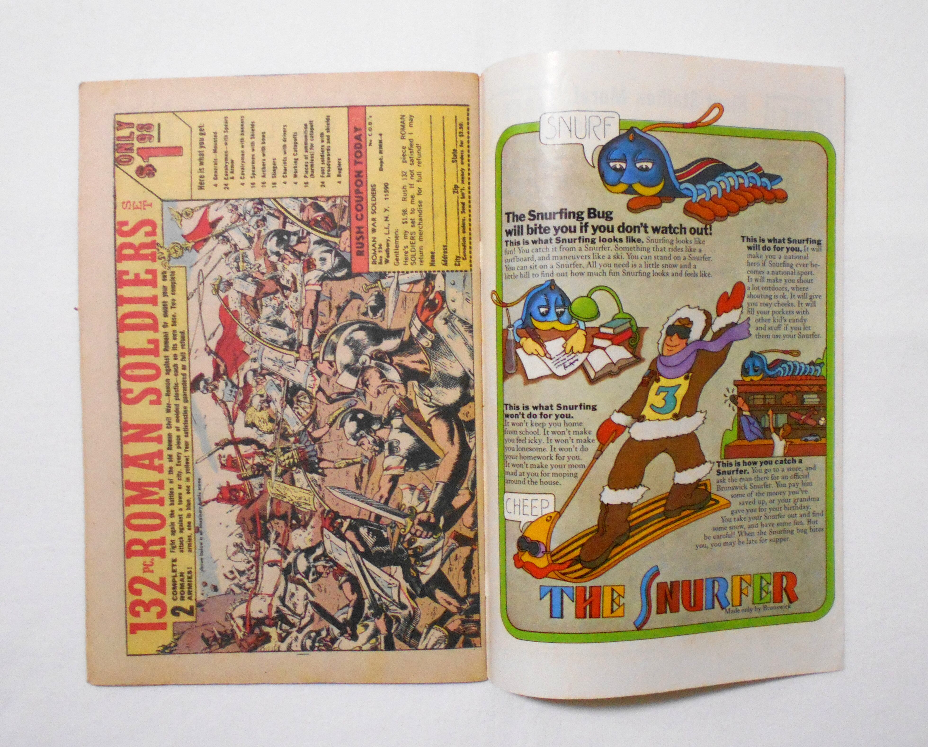 天に青いペイント汚れあり。他、多少の擦れやシワ、黄ばみ、角や端の傷みや折れ、破れ等があり、経年に伴う使用感は否めませんが、1970年代の輸入中古コミックですので、その点を考慮頂ければ、普通程度~おおむねきれいな状態だと思います。中は黄ばんでいますが、目立った汚れやシミ等は無く、おおむねきれいですので、読むのに支障はございません。新品同様の美品をお求めの方や、古書にご理解を頂けない方、また古い本特有の匂いもしますので気になる方にはお薦め致しかねます。何卒ご了承くださいませ。