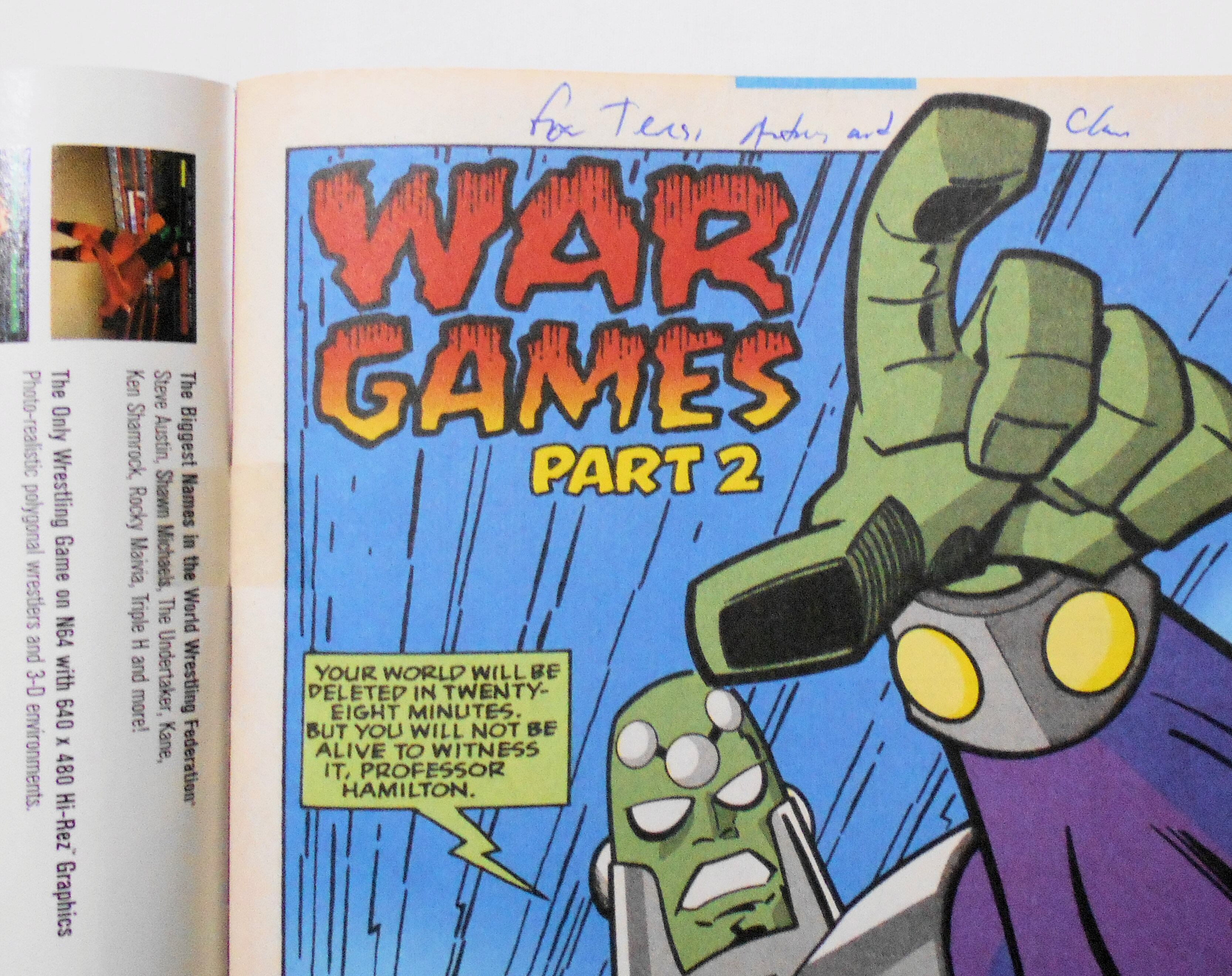 背にテープが貼られ、両表紙の内側もテープが貼られています。表紙が本体から外れた為に補修したわけではなく、前もって補強の為にテープを貼ったものと思われます。また1ページ目に上端に書き込みがあります。[テープ補強や書き込みは以前の持ち主の習慣と思われ、同時期に購入したコミック全てに同様の処置が施されていました。または図書館などの公共の施設で使用されたもので、前もって補強の処置が施されたのかもしれませんが、保存状態が良いので、不特定多数の方が読まれたものではないと思います。書かれた文字が読み取れず、真相は分かりかねます。これらが理由で、当店比較ですがお値段を少しお安めに設定させて頂きました。] 他、多少の擦れやシワ、黄ばみ、角や端の傷みや微折れ等が見られ、使用感は否めませんが、目立った汚れやシミ等はなく、普通程度~おおむねきれいな状態だと思います。ただ、一度人の手に渡った1990年代の輸入中古コミックですので、その点を考慮頂ければと思います。新品同様の美品をお求めの方や、中古品にご理解が頂けない方にはお薦め出来ません。