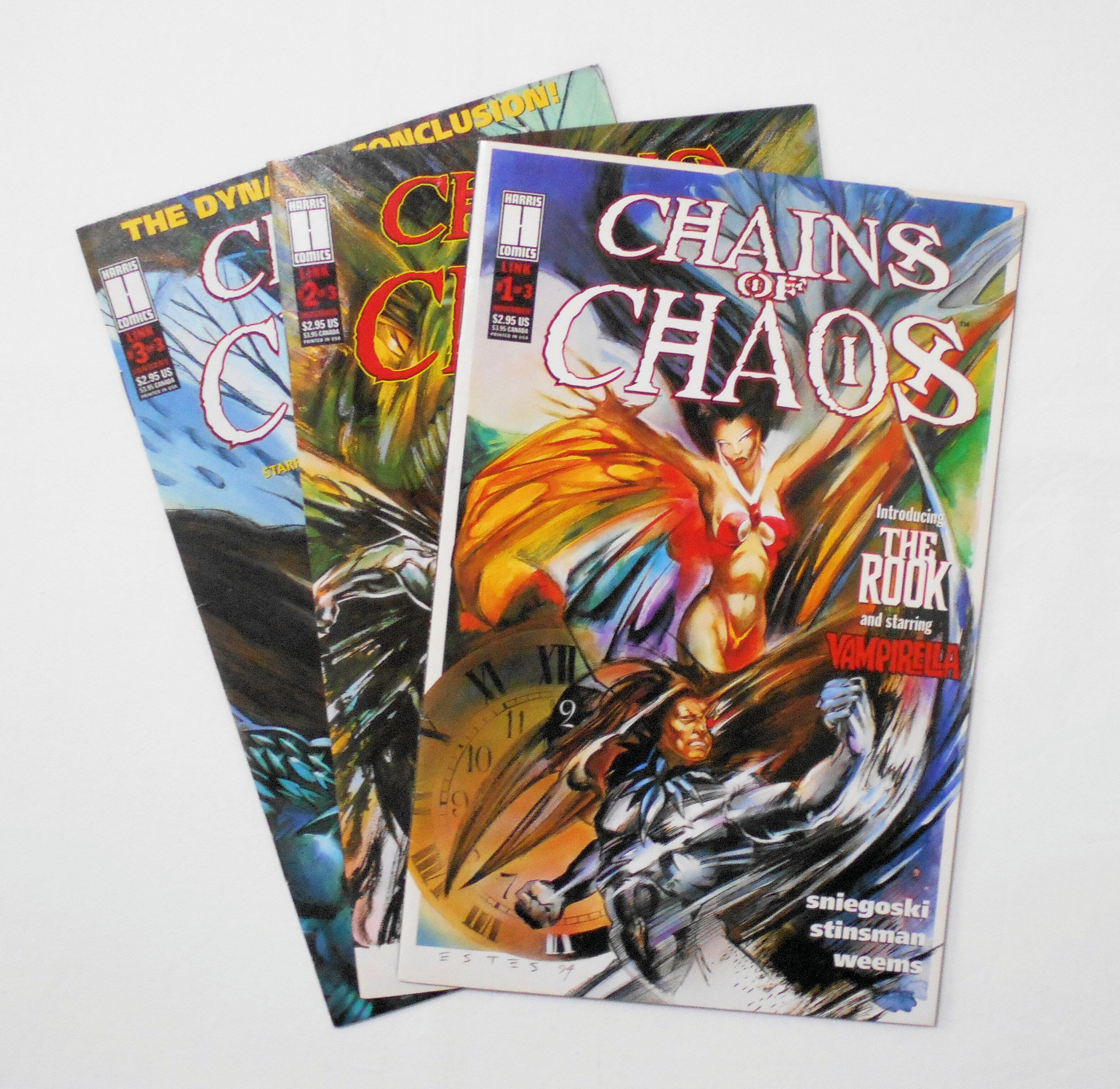 【CHAINS OF CHAOS: THE ROCK & VAMPIRELLA】LINK #1,2,3 (of 3) / #1 NOV. 1994 #2 DEC. 1994 #3 JAN. 1994(おそらく1995年の記載ミスです) ALL FIRST PRINTING◆by SNIEGSKI, CAESAR & WEEMS◆中古アメリカン・コミック。英文表記の洋書となります。◆それぞれ32ページ カラー 大きさ約26×17センチ◆HARRIS PUBLICATIONS, INC.