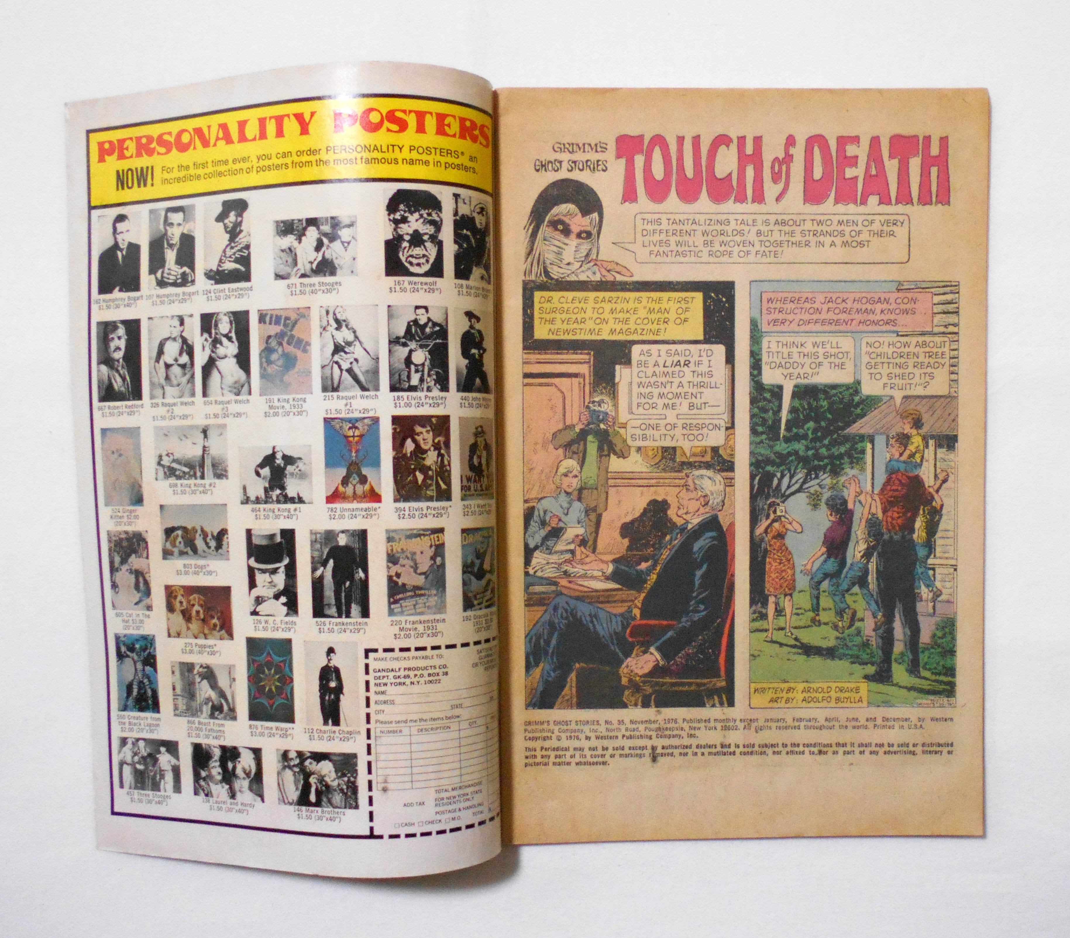 【GRIMM'S GHOST STORIES】 NO.35 NOV. 1976◆中古アメリカン・コミック。英文表記の洋書となります。◆32ページ フルカラー 大きさ約26×17センチ◆WESTERN PUBLISHING COMPANY, INC.◆収録タイトル:"TOUCH OF DEATH"、"THE TEN O'CLOCK NEWS"、"THE ANIMAL SPIRIT"
