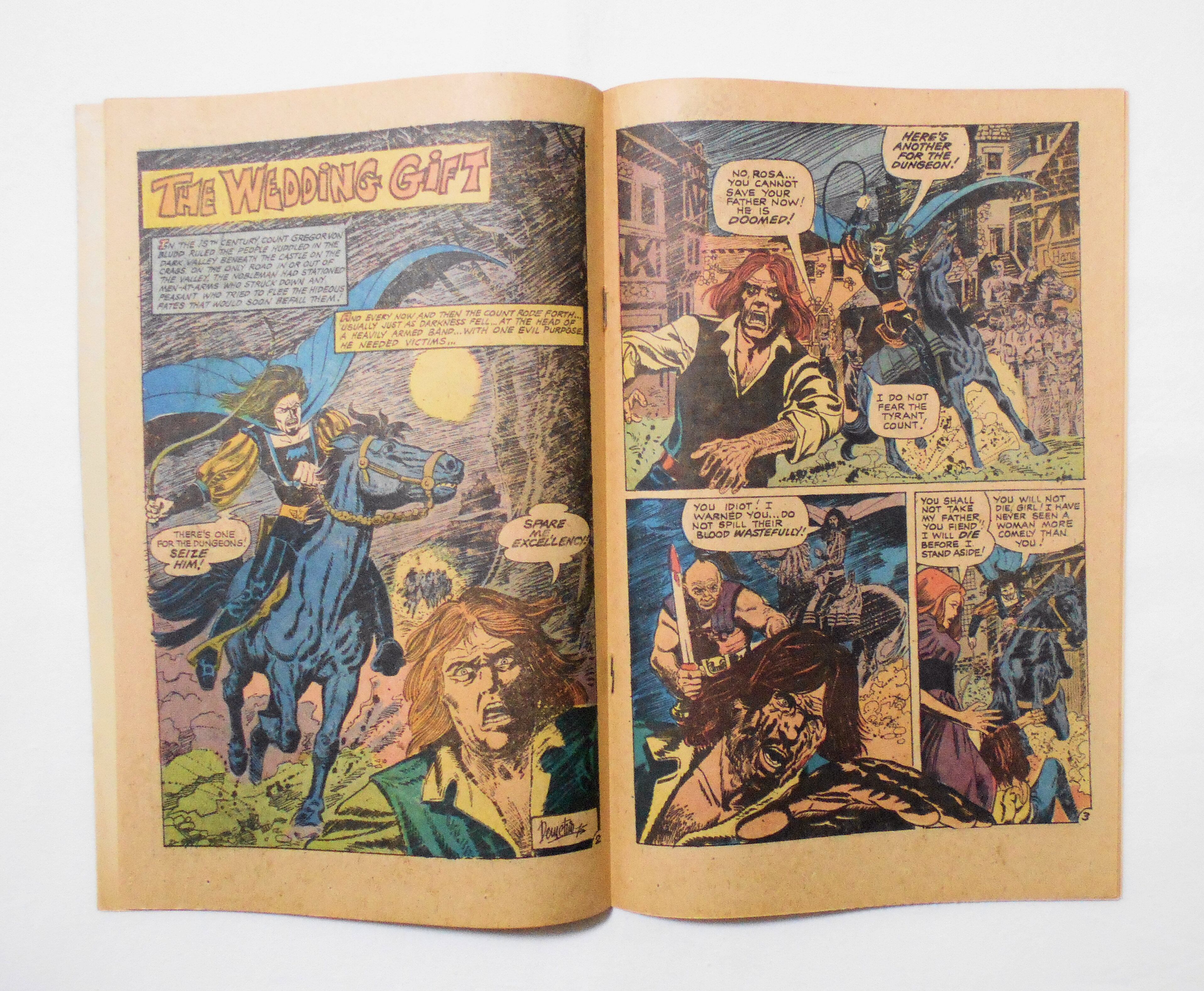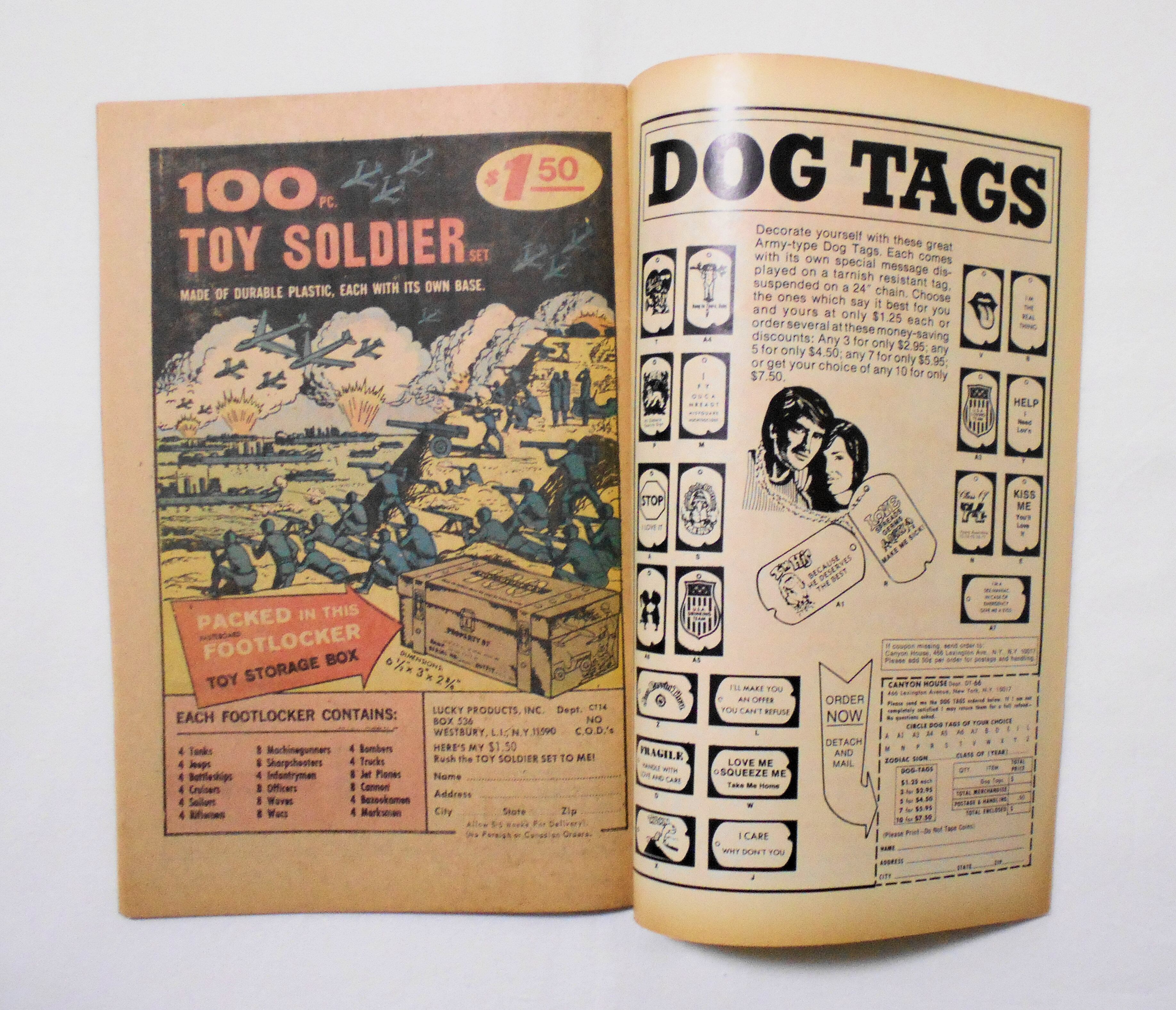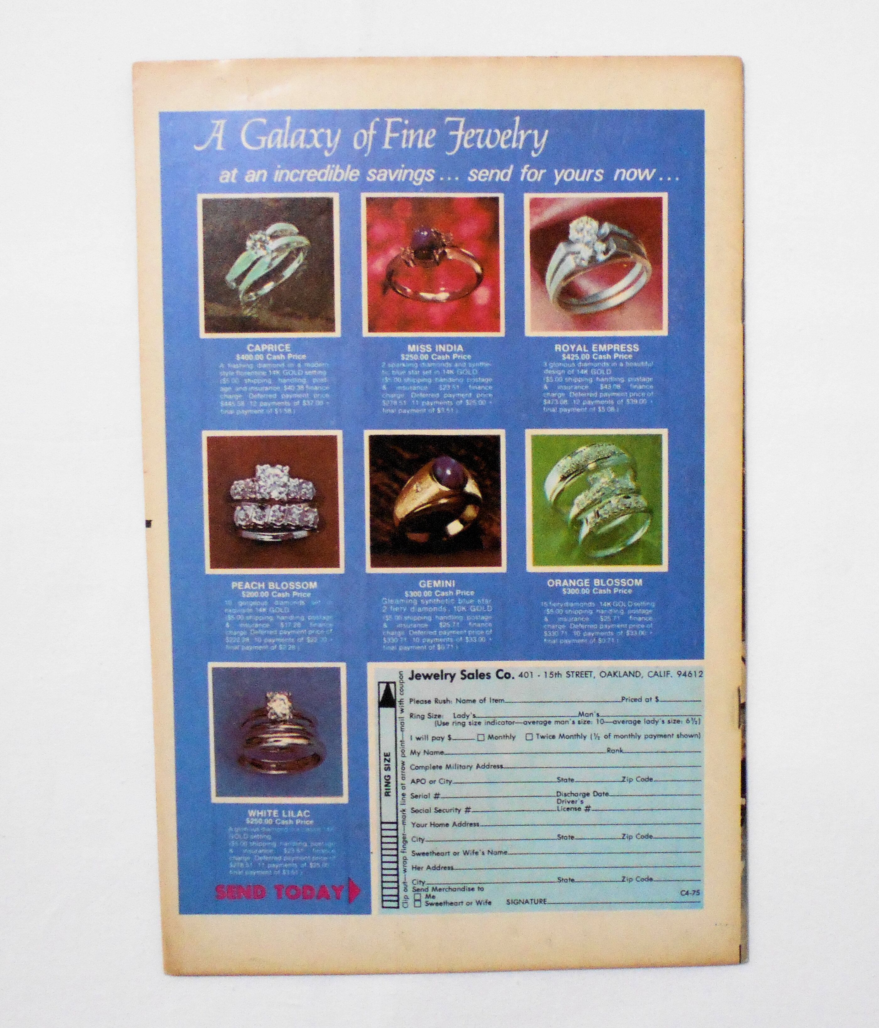 1ページ目の右上角にスタンプが押されています。他、多少の擦れやシワ、黄ばみ、紙ジミ、角や端の傷みや微折れ、微破れ等があり、経年に伴う使用感は否めませんが、1970年代の輸入中古コミックですので、その点を考慮頂ければ、普通程度と言える保存状態だと思います。中は黄ばんでいますが、目立った汚れやシミ等はなく、読むのに支障はございません。新品同様の美品をお求めの方や、古書にご理解を頂けない方にお薦めは出来ません。