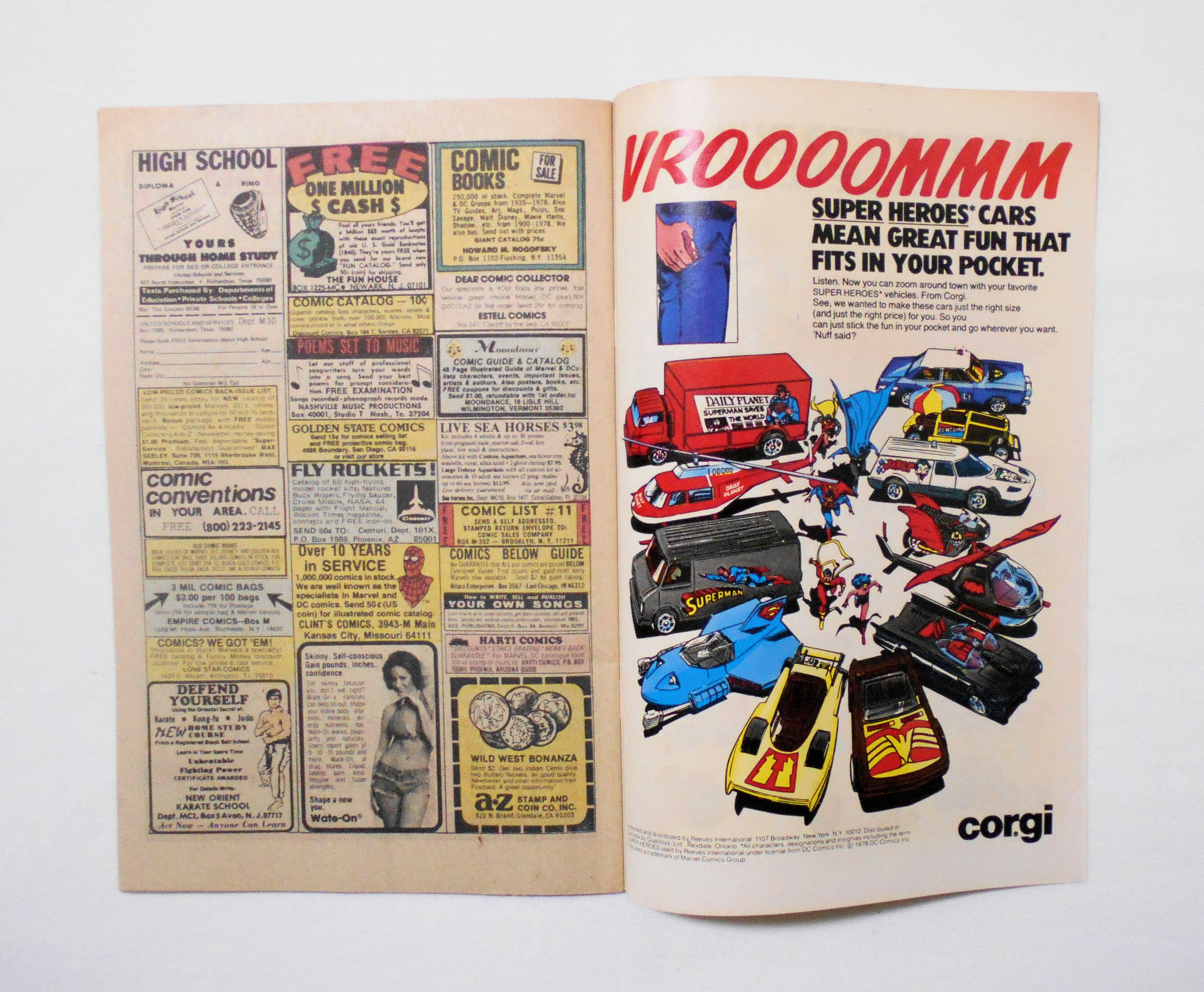 背から内側へ約0.5センチ縦方向に軽く折れ目がついています。他、多少の擦れやシワ、黄ばみ、紙ジミ、角の傷みや微折れ、微破れ等があり、経年に伴う使用感は否めませんが、目立った汚れやシミ等はなく、1980年代の輸入中古コミックですので、その点を考慮頂ければ、普通程度~おおむねきれいな状態だと思います。新品同様の美品をお求めの方や、中古品にご理解を頂けない方にお薦めは出来ません。